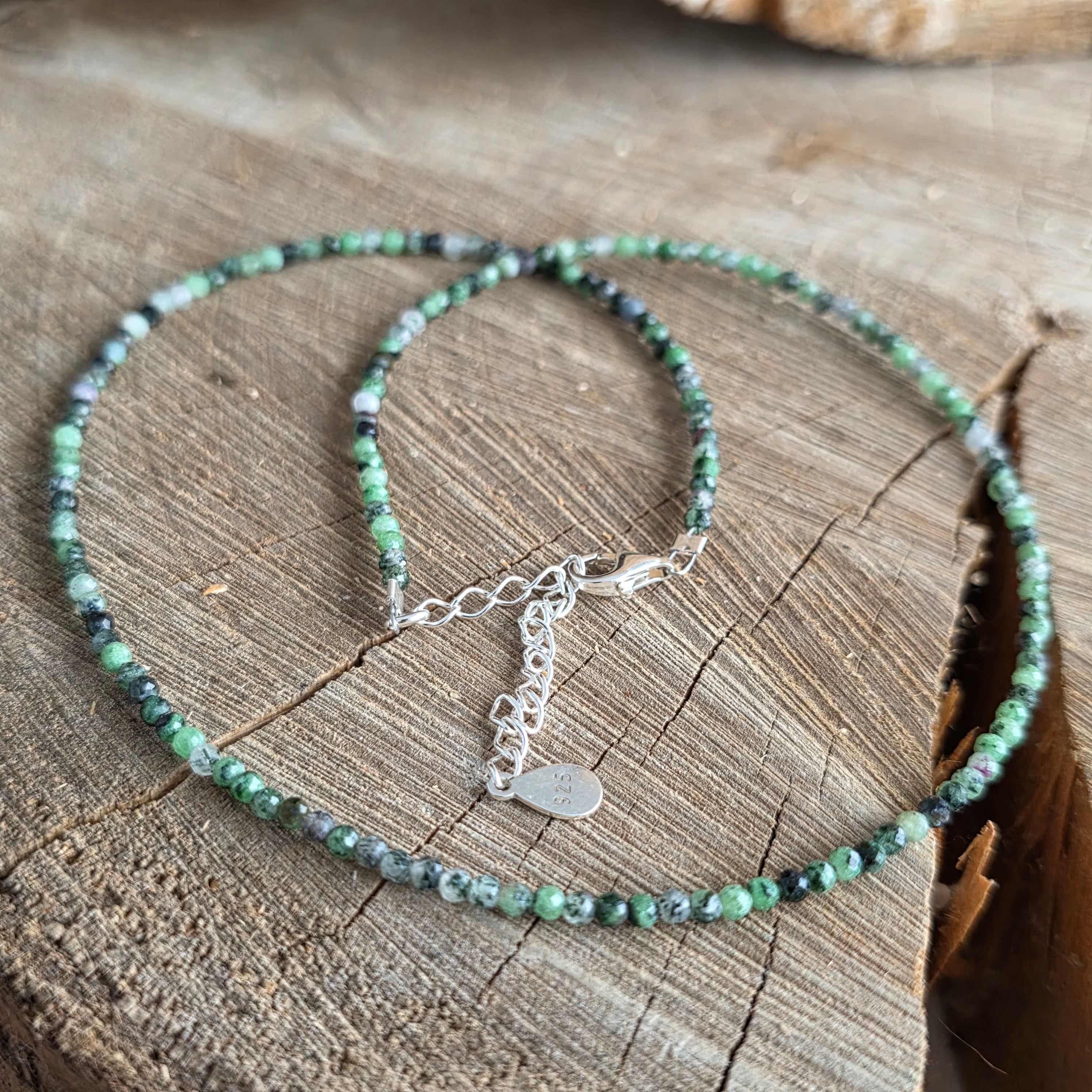 Klejnot, który szepcze w odcieniach surowych zielonych i ciemnych cieni - jak tajny ogród pozostawiony nietknięty. Ten drobny naszyjnik naturalnego zoisit, złożony z sfer 2,5 mm, jest umieszczany z wdziękiem u podstawy szyi, jak tajemnicza nić otaczająca delikatność.