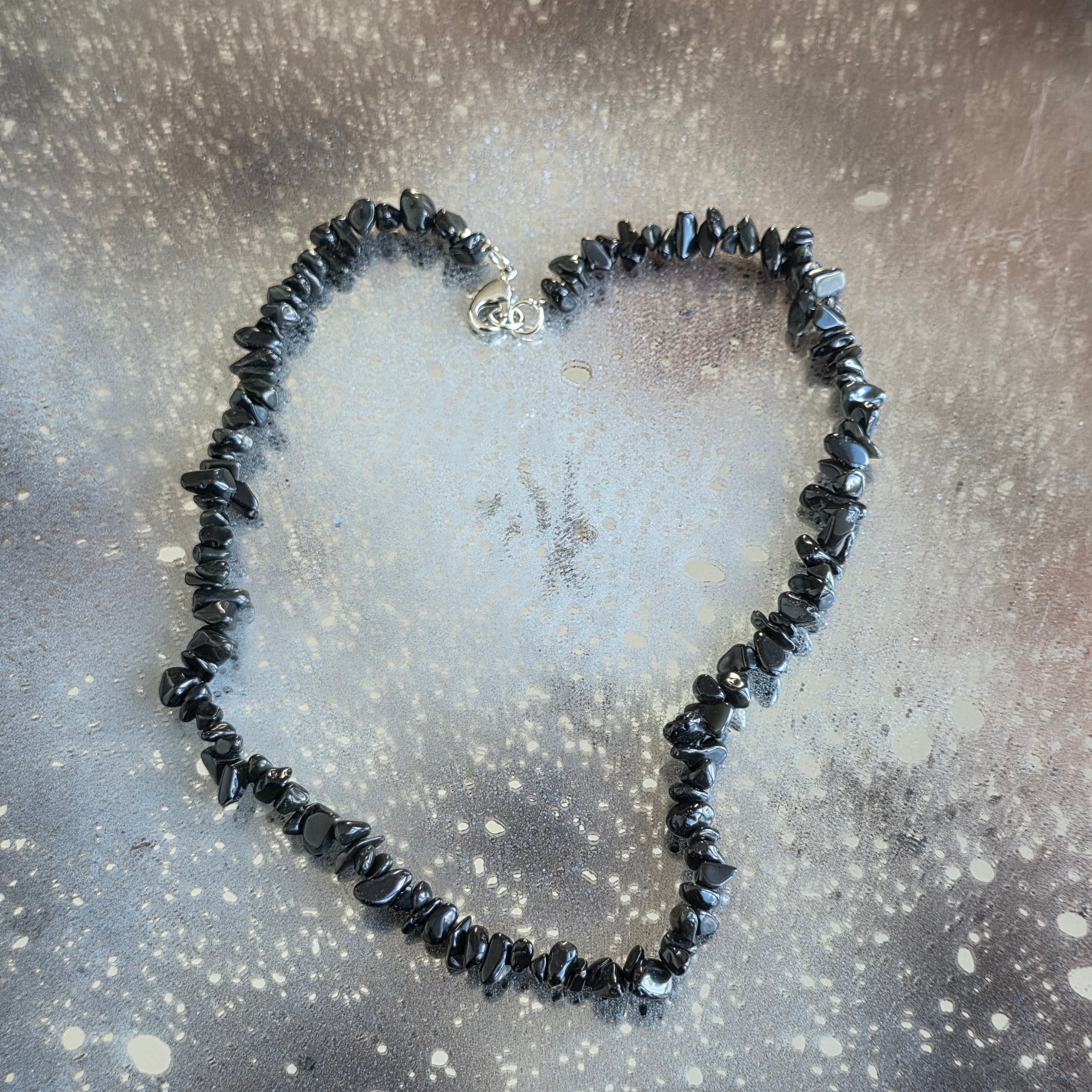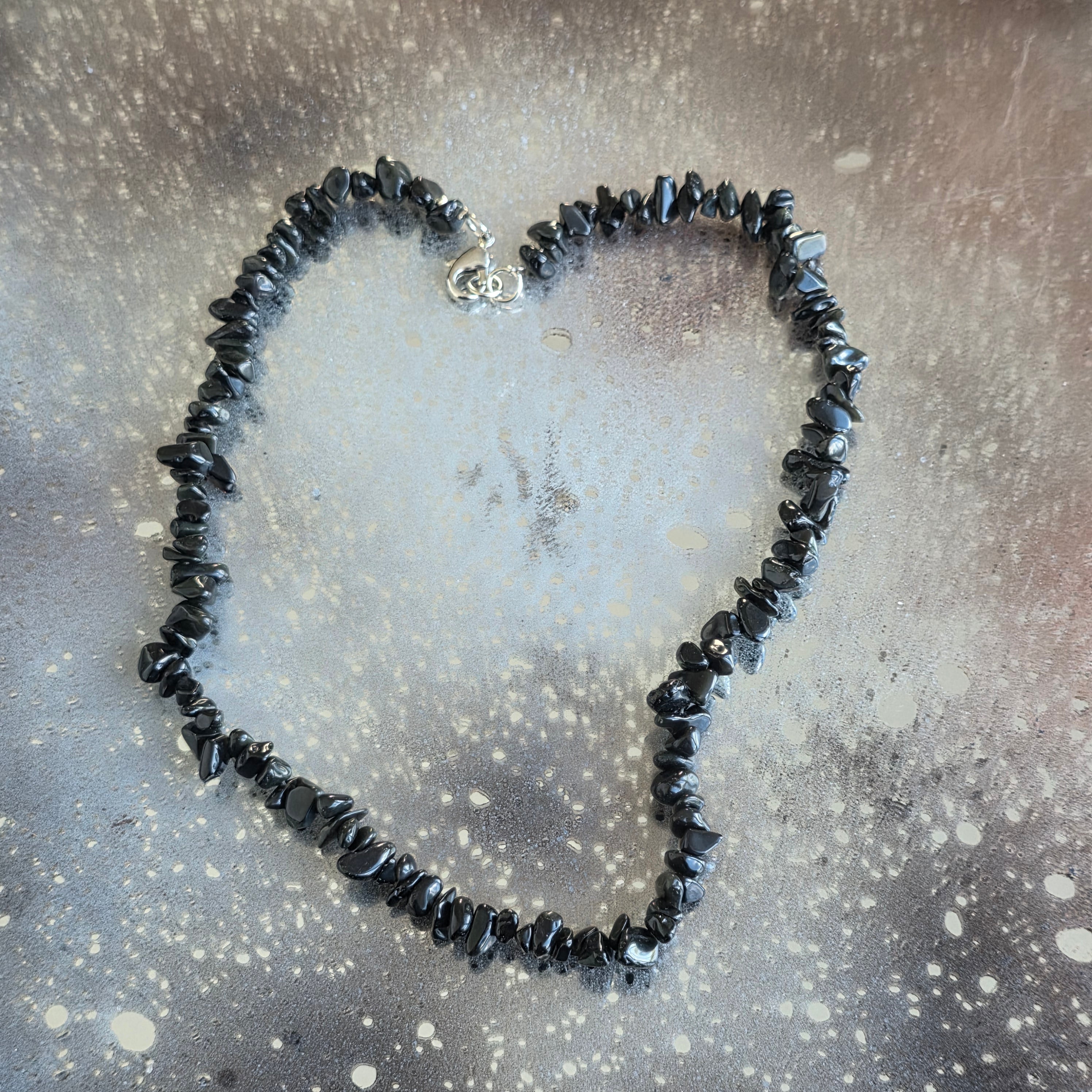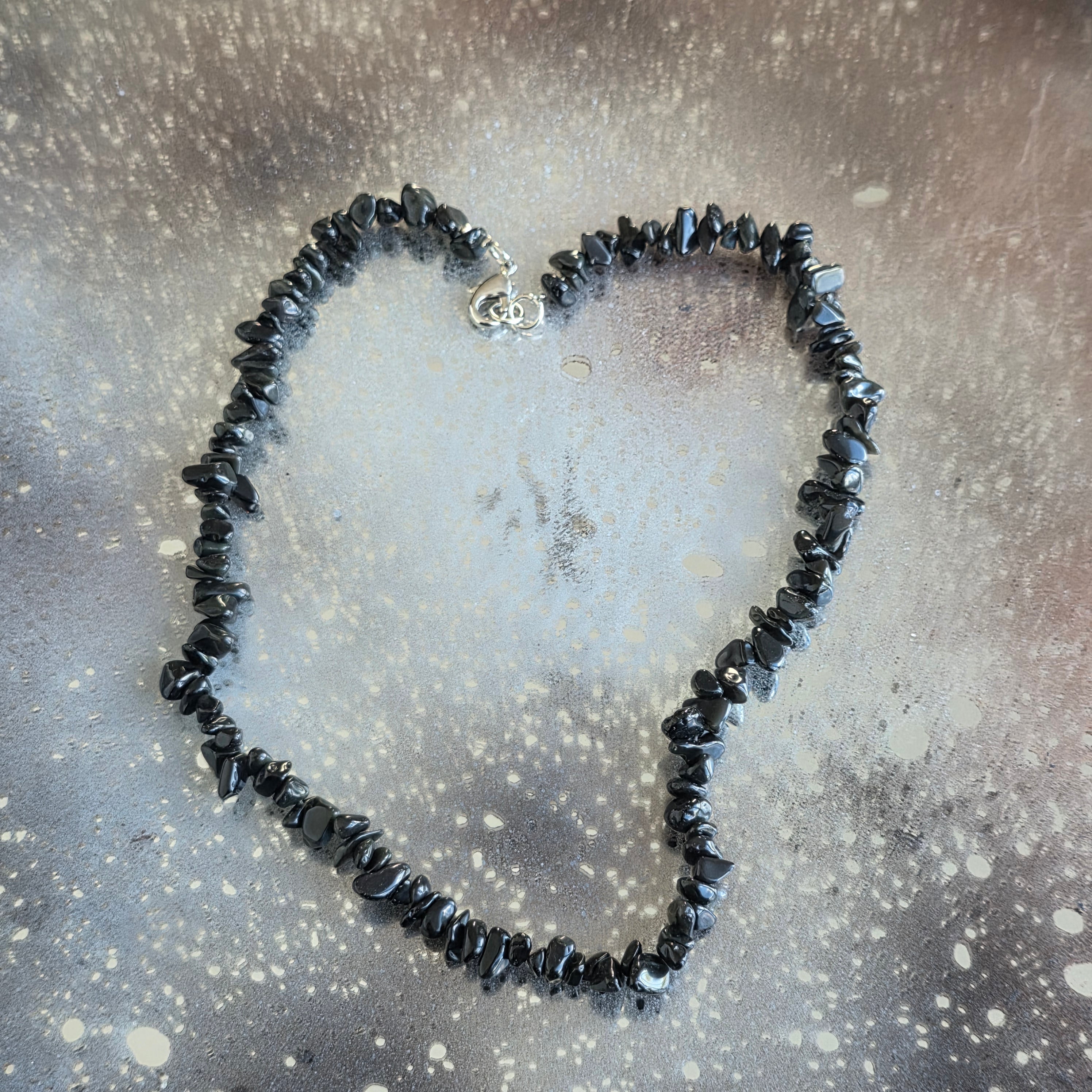 Naszyjnik, który nosi w sobie tajemnicę wulkanicznych nocy i głęboką ciszę ziemi. Naturalne chipsy obsydianu,delikatnie oszlifowane i nawleczone na ciąg o długości 80 cm,emanują subtelną, niemal hipnotyzującą elegancją. Ich czarny połysk z szklistymi refleksami przypomina ostudzoną lawę, która nauczyła się przekształcać w ochronę.
