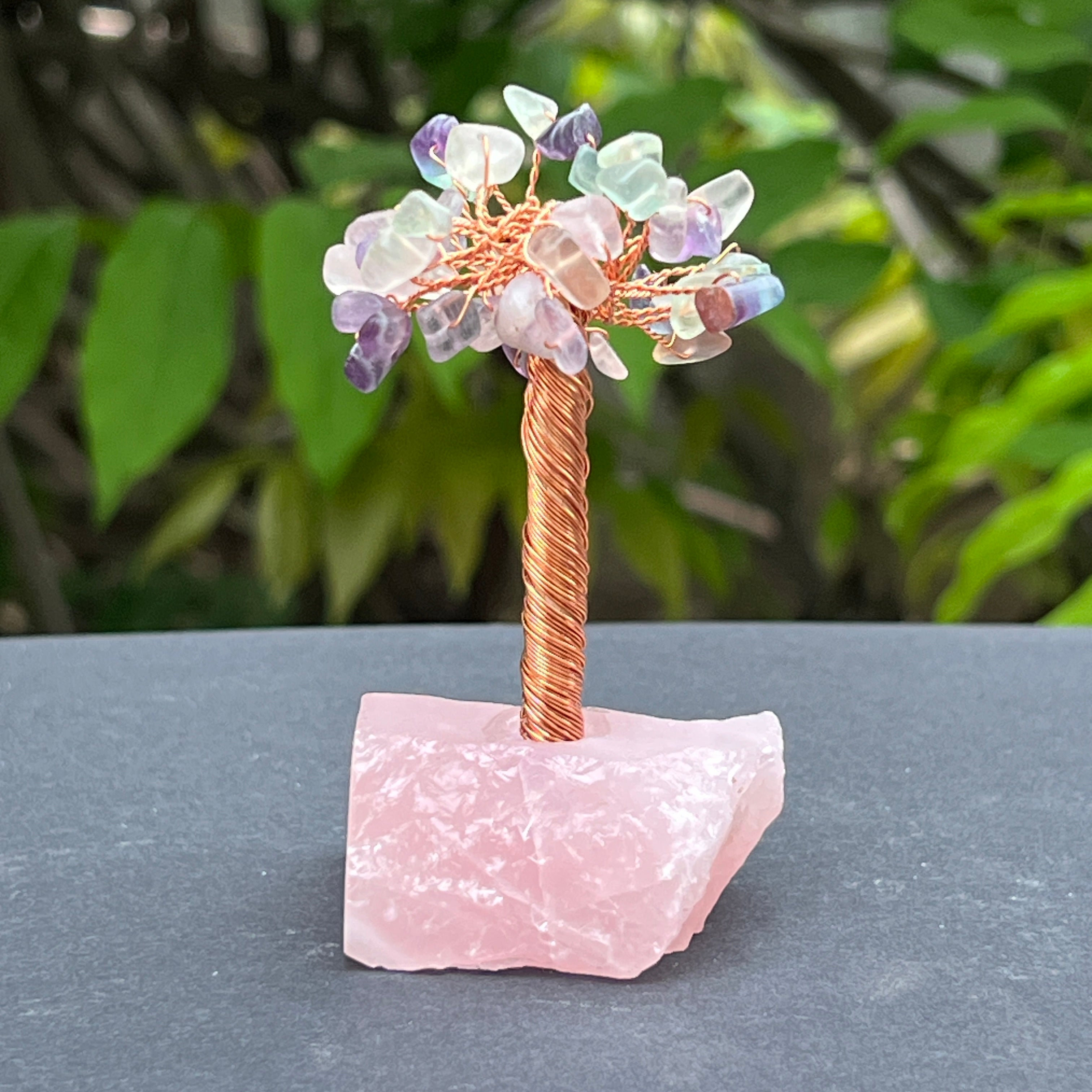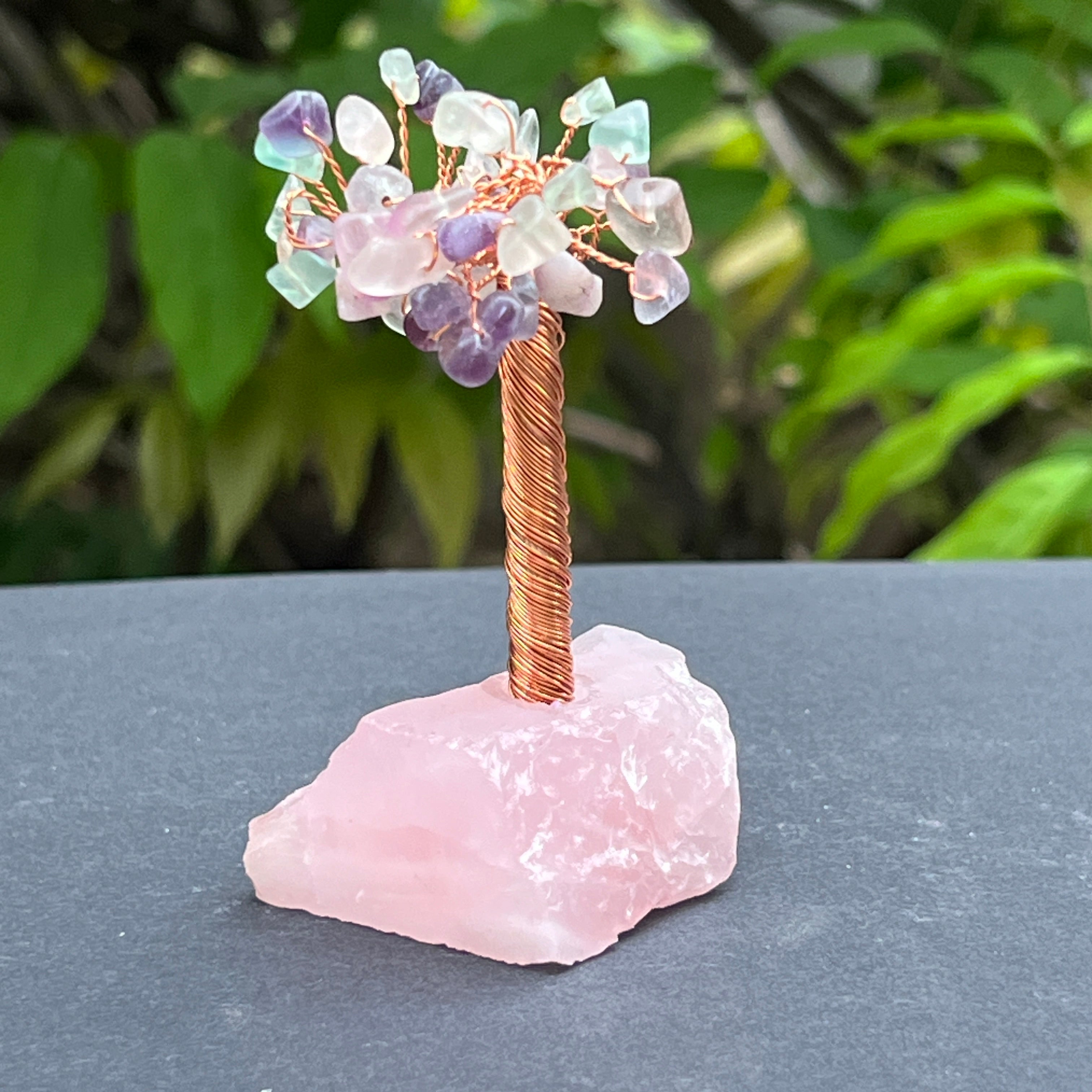 To drzewo Feng Shui łączy energię jasności umysłowej z łagodnymi wibracjami miłości i równowagi emocjonalnej. Liście są wykonane z fluor, powiązany kamień w Feng Shui z skupieniem, ochroną umysłową i równowagą między logiką a intuicją. Solidna podstawa pochodzi z Gross Różowy kwarc, znany jako kamień serca, który wspiera miłość, emocjonalne uzdrowienie i współczucie.