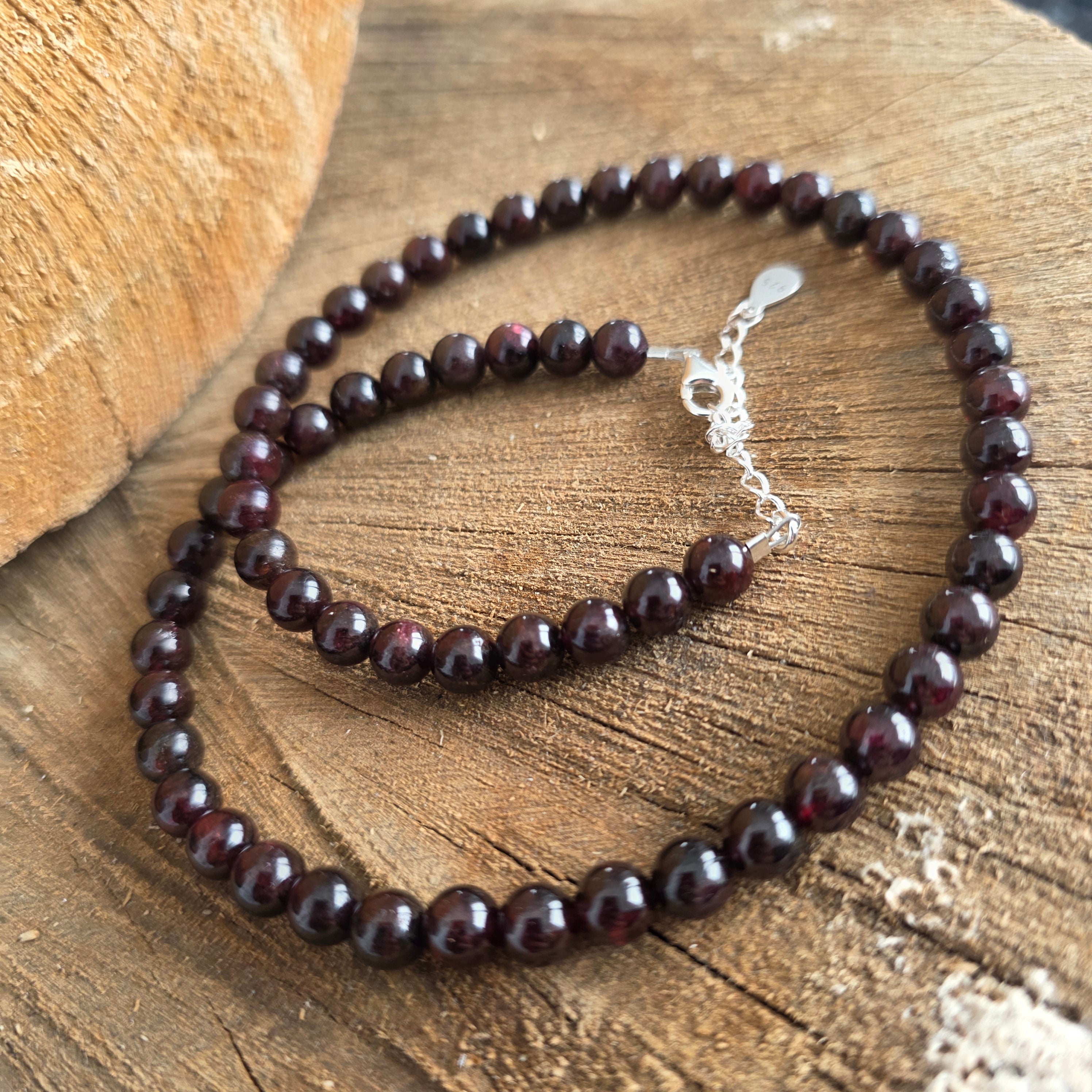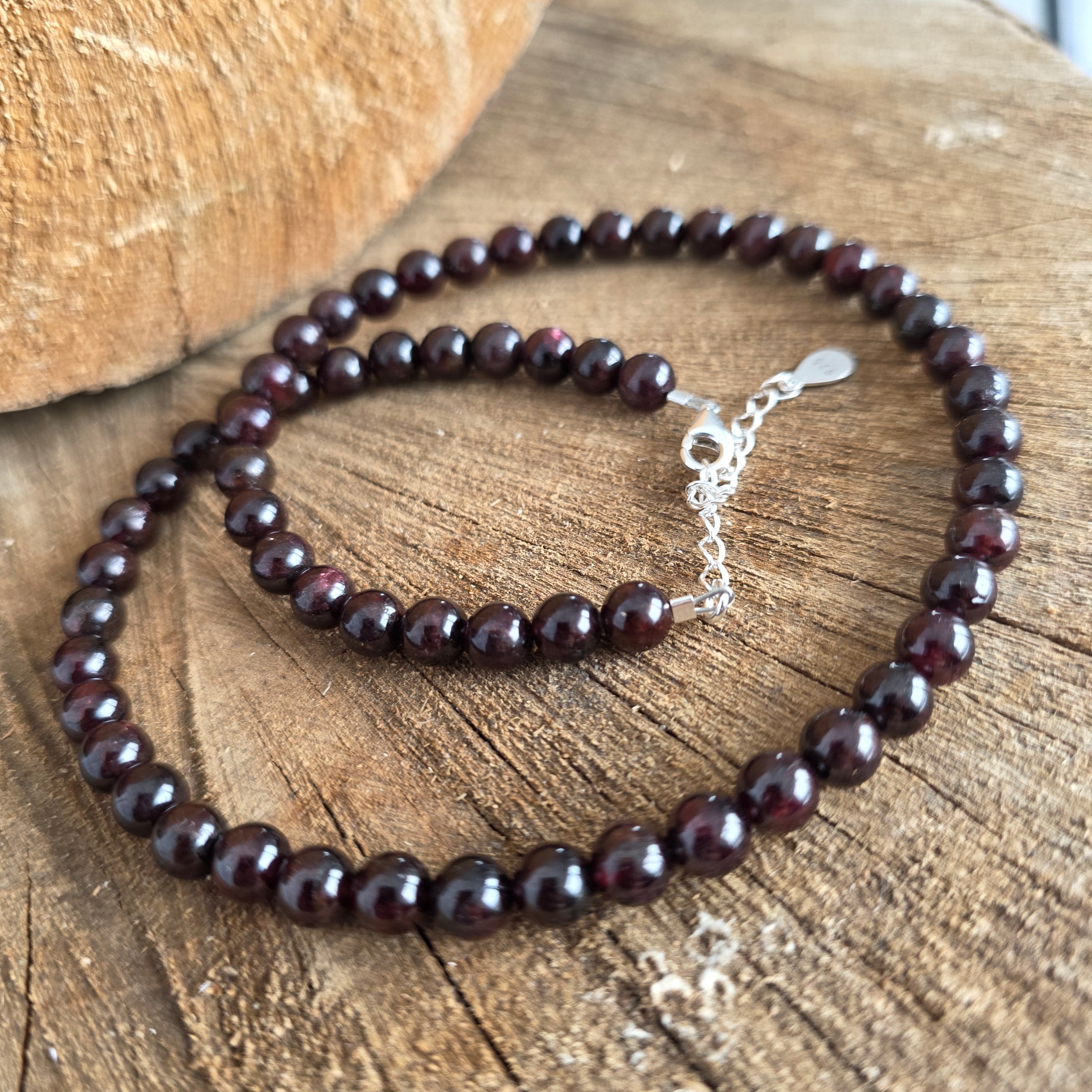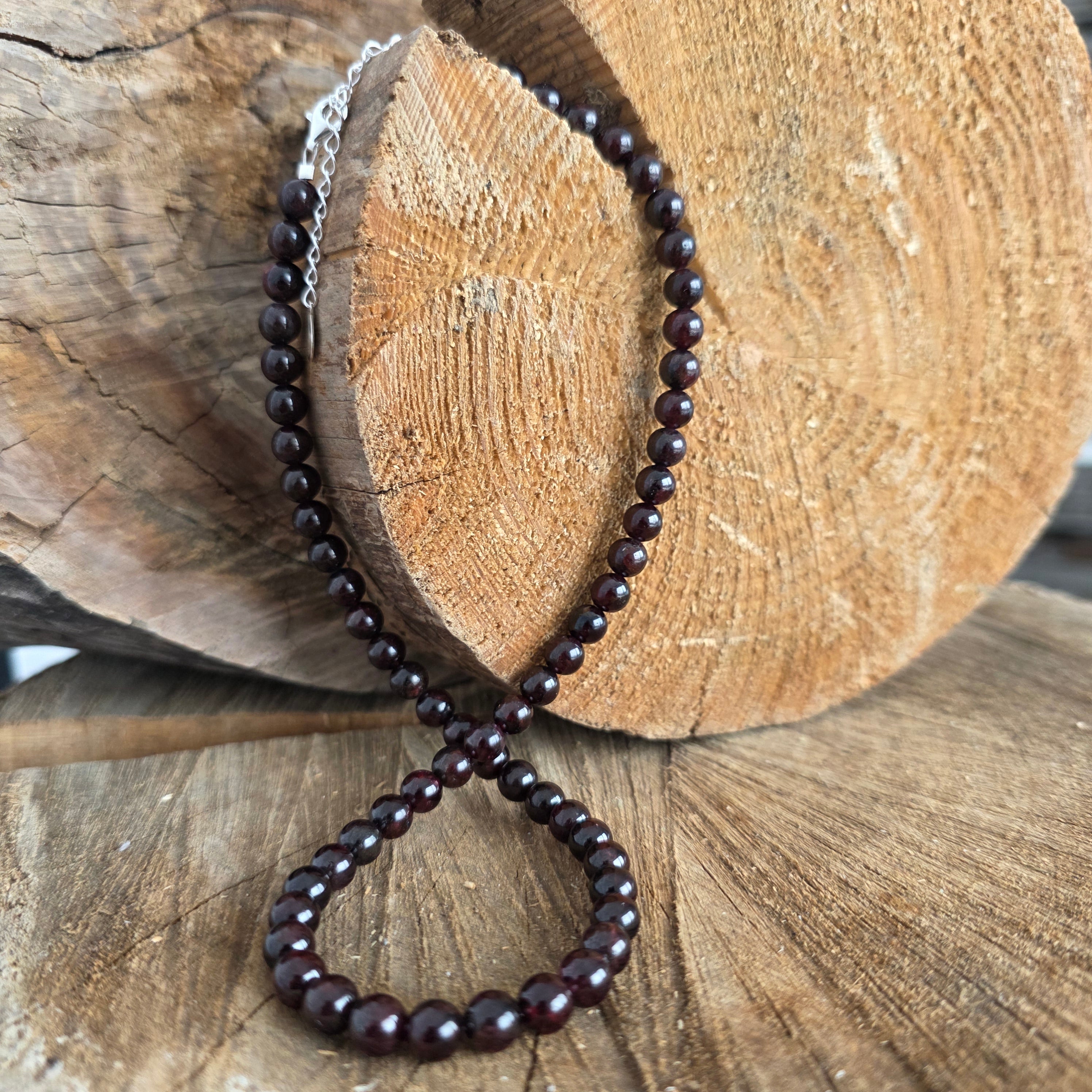 Naszyjnik, który oddaje istotę witalności i naturalnej elegancji. Dziki granat 6 mm, o głęboko czerwonych odcieniach, posiada subtelny blask, niczym serce bijące cicho w głębi ziemi. Prostota gładkich kul daje klasyczny i ponadczasowy wygląd, podkreślając autentyczne piękno kamienia.