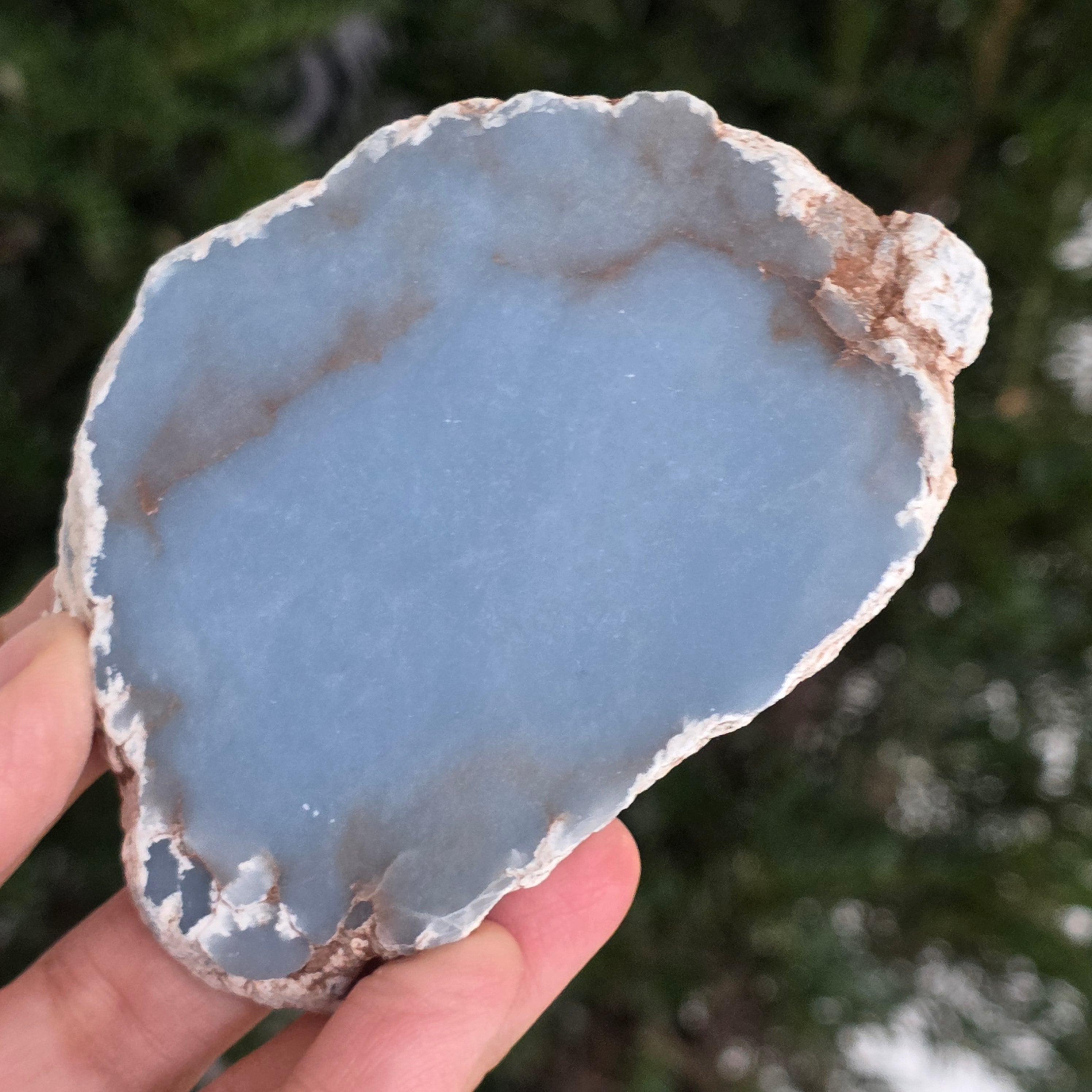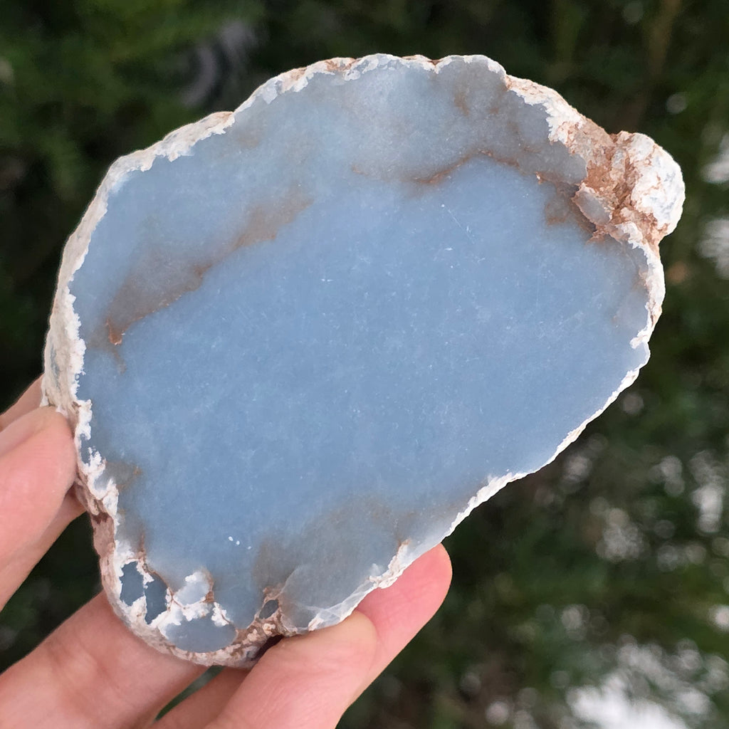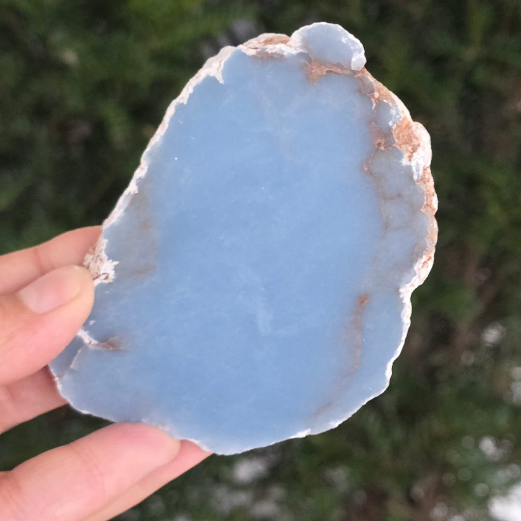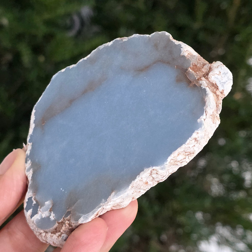 O piesă rară, ce pare desprinsă din seninul cerului. Această felie de angelit natural, dezvăluie un albastru delicat, lăptos, străbătut de nuanțe fine de gri și alb sidefat. Suprafața netedă și textura sa mată emană liniște și puritate – o bijuterie minerală a calmului și a echilibrului interior.