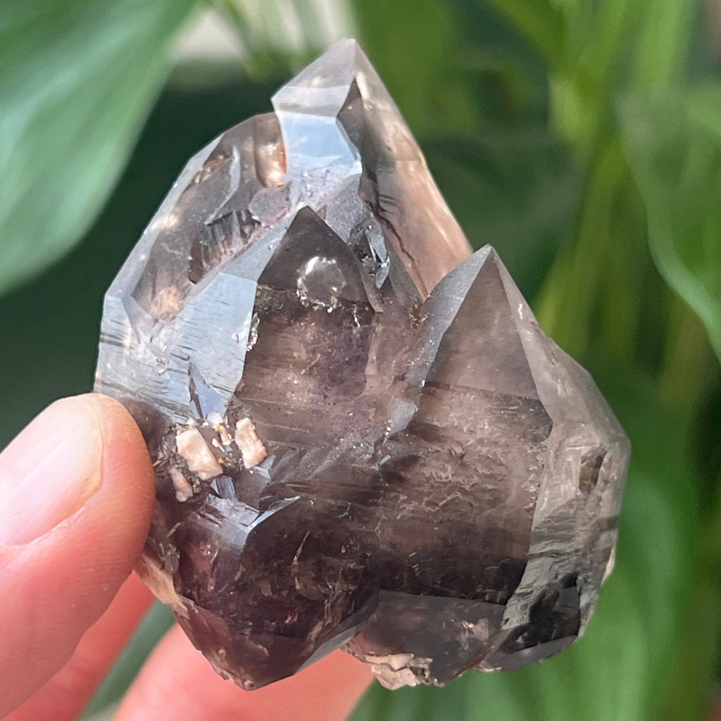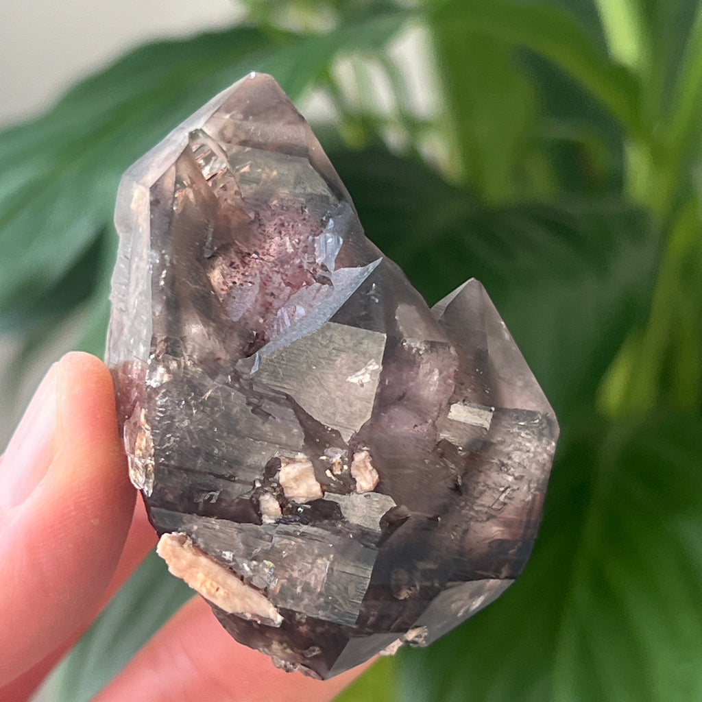Krystalizując w układzie trygonalnym, ta próbka TakO₂ (dwutlenek krzemu) wyróżnia się doskonałą przezroczystością i naturalnymi, sześciokątnymi kształtami. Niektóre fragmenty zawierają "duchy" – wewnętrzne kontury, które odzwierciedlają wcześniejsze etapy wzrostu – lub przedstawiają poruszające się pęcherzyki cieczy hydrotermalnej, hematytu lub getytu, wszystkie uchwycone wewnątrz kryształu miliony lat temu.