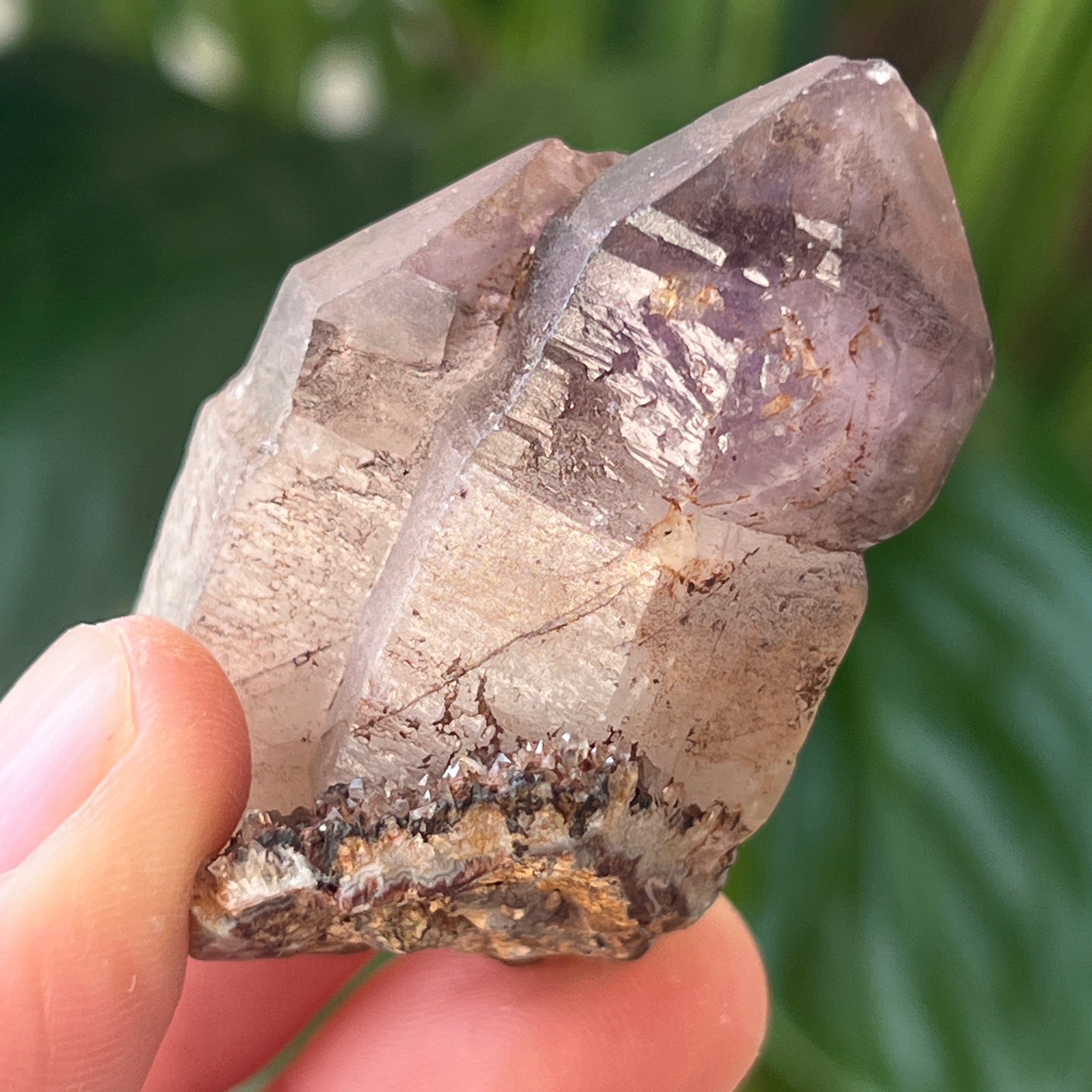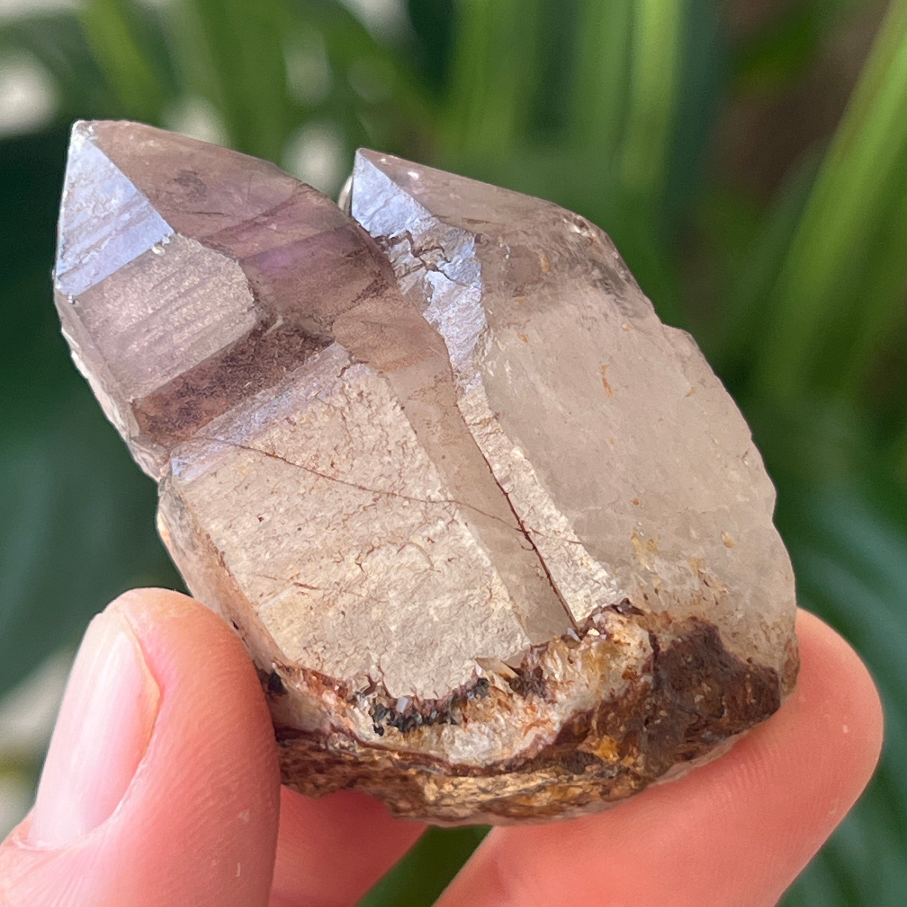 Krystalizacja w układzie trygonalnym, ten okaz SiO₂ (dwutlenek krzemu) wyróżnia się doskonałą przezroczystością i naturalnymi, sześciokątnymi kształtami. Niektóre prace zawierają „duchy” – wewnętrzne kontury odzwierciedlające wcześniejsze etapy wzrostu – lub przedstawiają ruchome bąbelki płynu hydrotermalnego, hematytu lub getytu, wszystkie uchwycone w krysztale miliony lat temu.