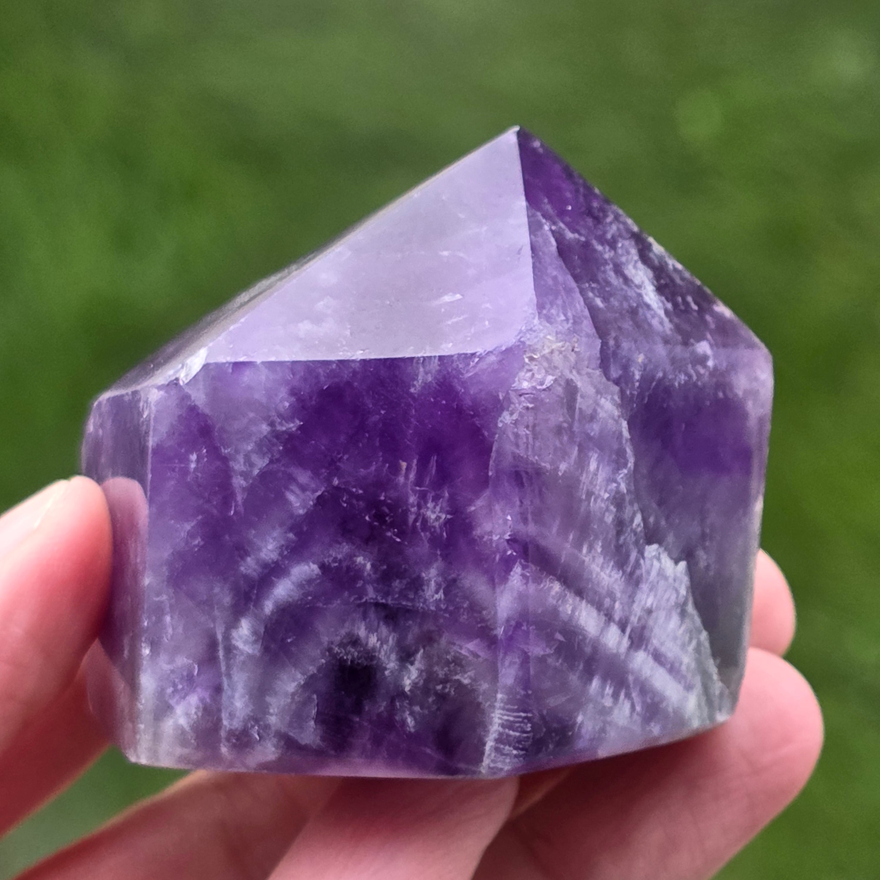 Ametyst Chevron jest znany ze swoich powiązań z czakrami korony i trzecim okiem, zwiększając intuicję i zdolność podejmowania decyzji.