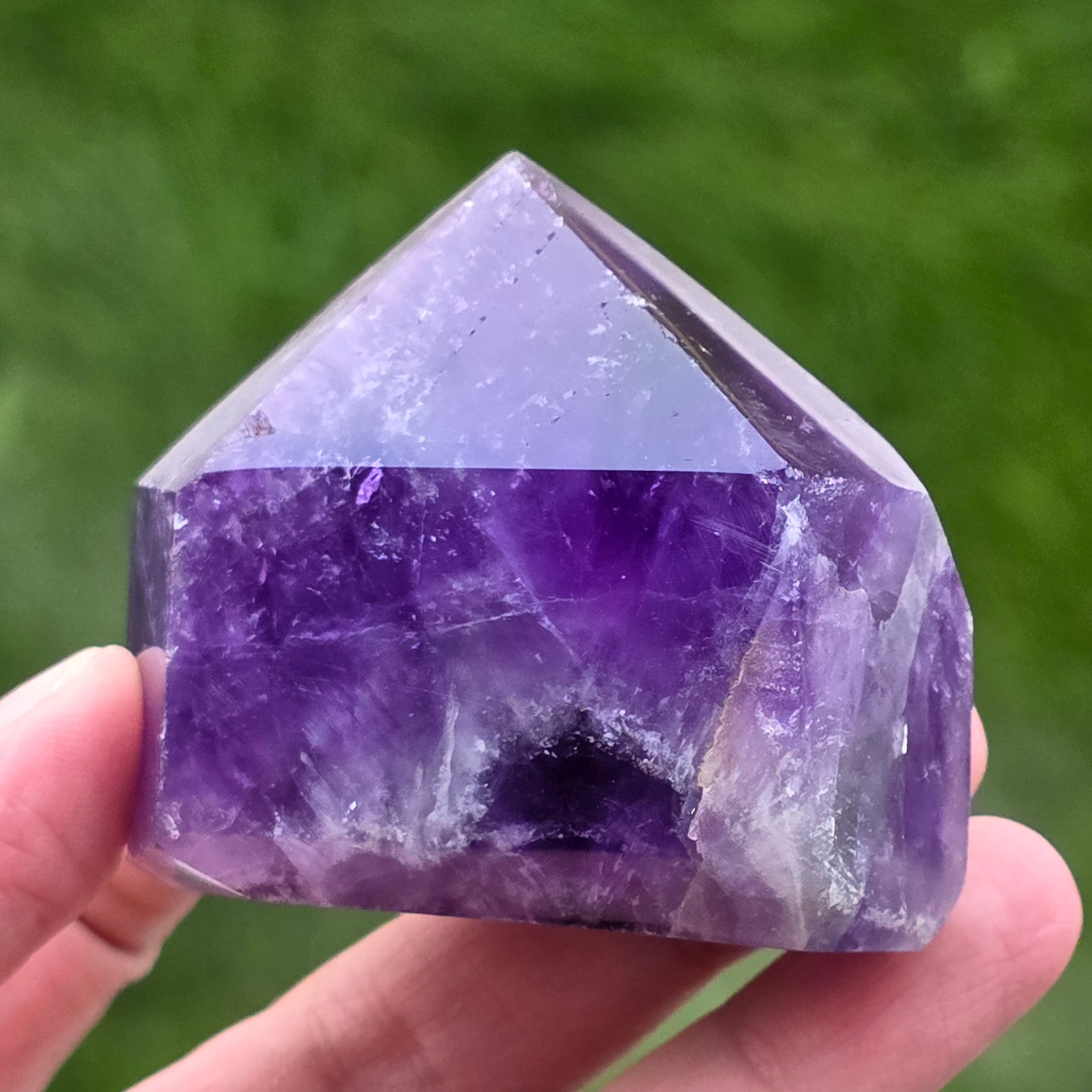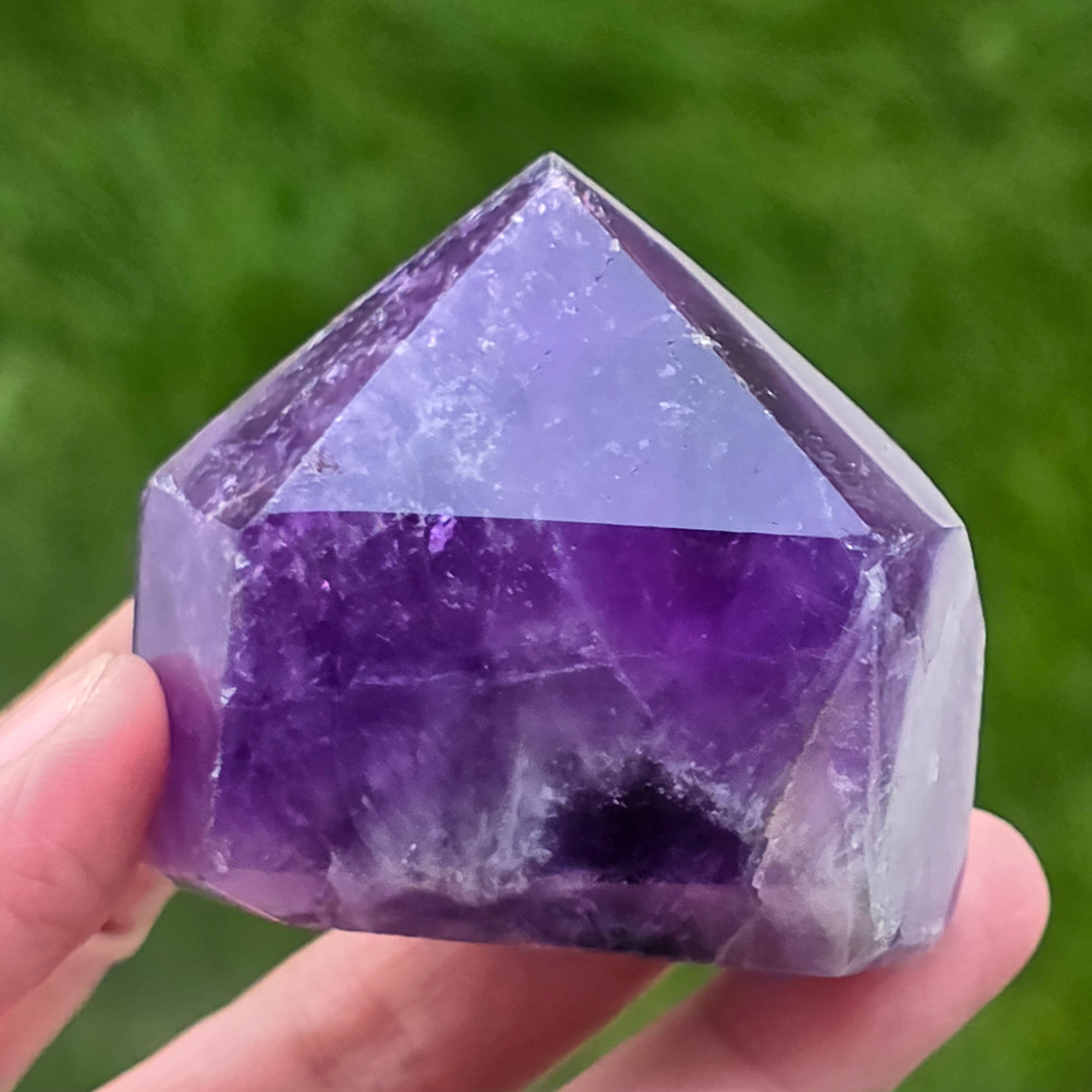 Ametyst Chevron jest znany ze swoich powiązań z czakrami korony i trzecim okiem, zwiększając intuicję i zdolność podejmowania decyzji.