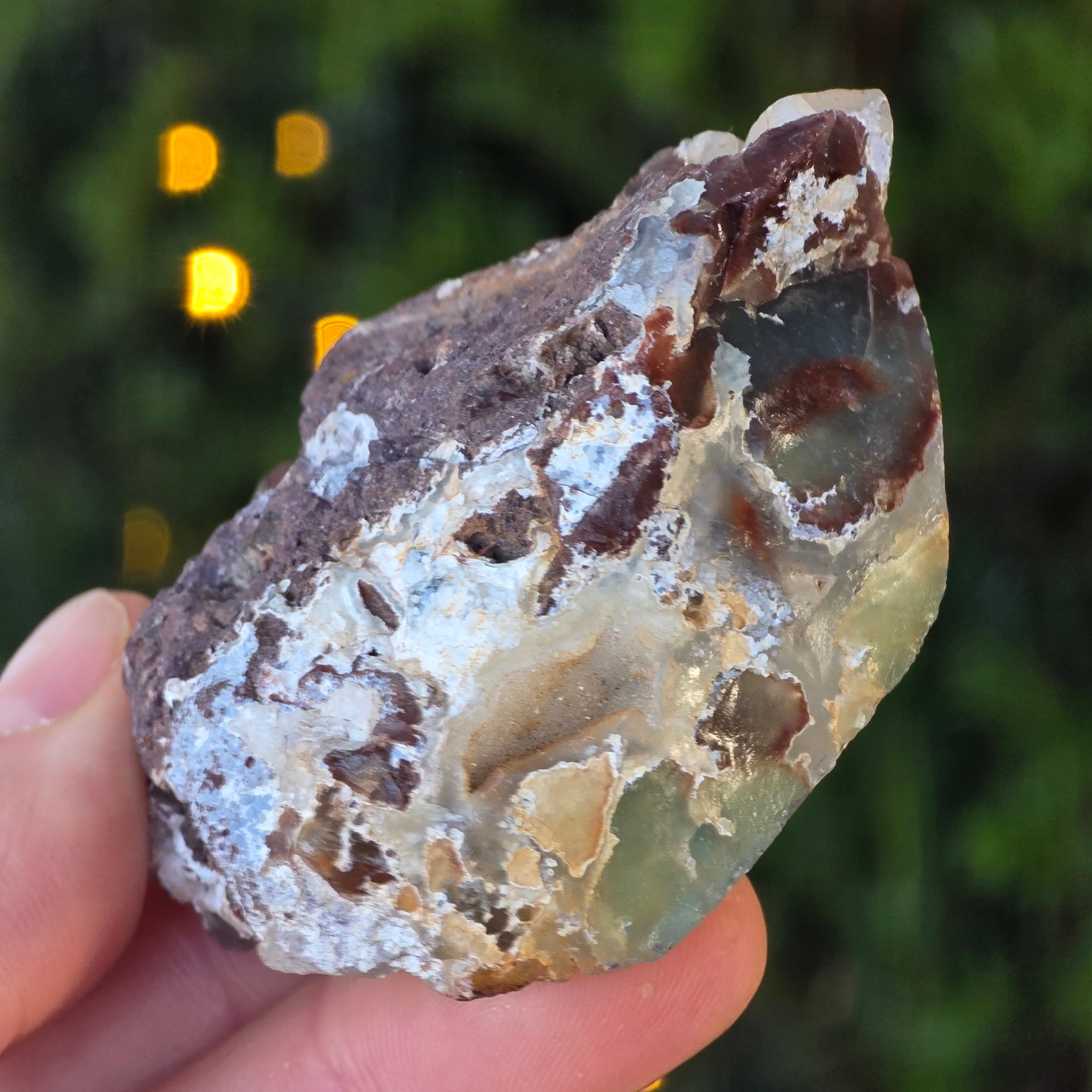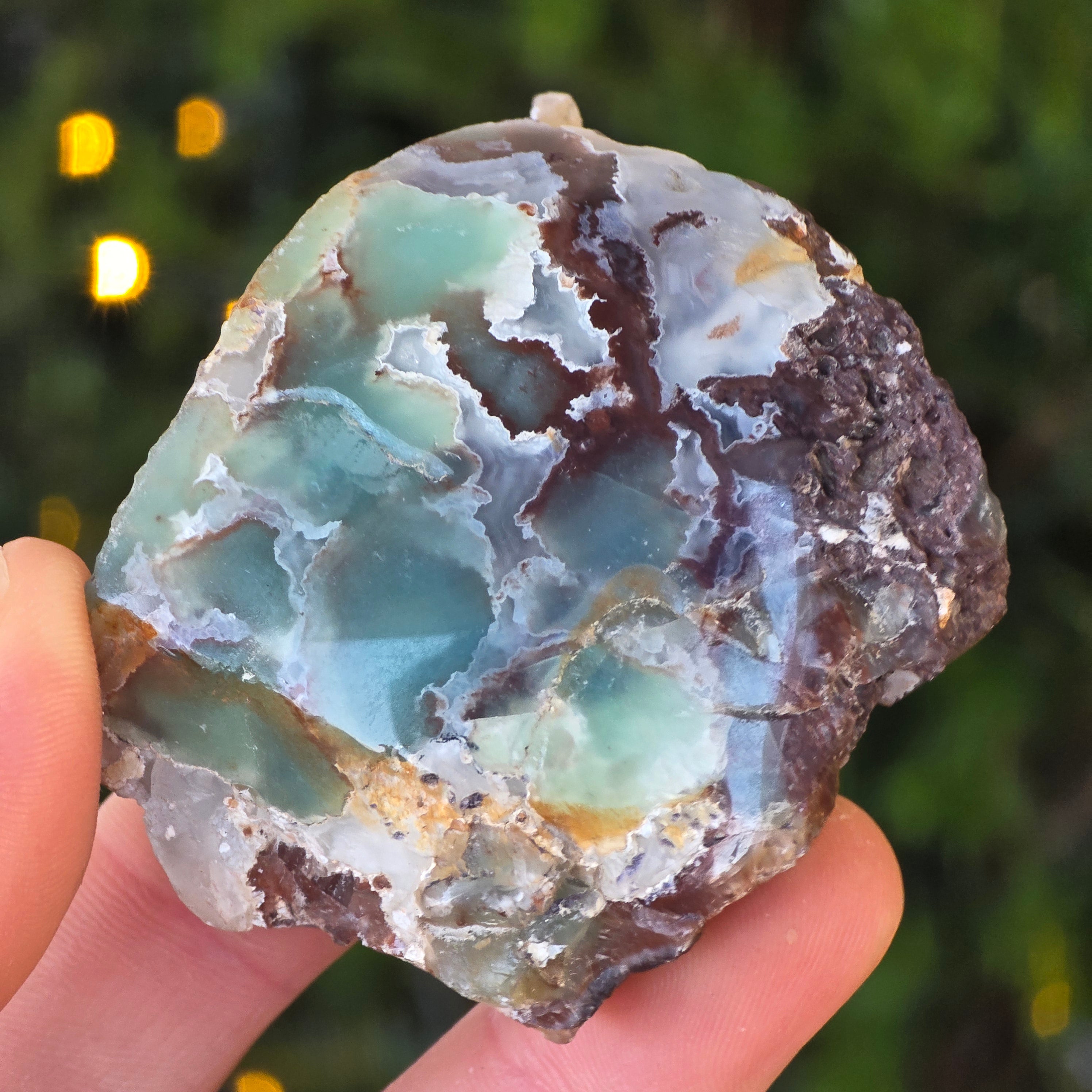 Jest to naturalna, niezmieniona forma chalcedonu chromifer - trudny do znalezienia minerał, wyłącznie z Zimbabwe, i doceniany za jej żywy kolor, który nie pochodzi z niklu (jak w Cisopraz), ale z chromu, który pulsuje głęboko w strukturę krystaliczną. W tym specjalnym wariancie niebieskie i zielone wkładki tworzą fascynującą grę chromatyczną, z płynnymi przejściami między półprzezroczystymi i nieprzejrzystych, między gęstym a napowietrzonym.