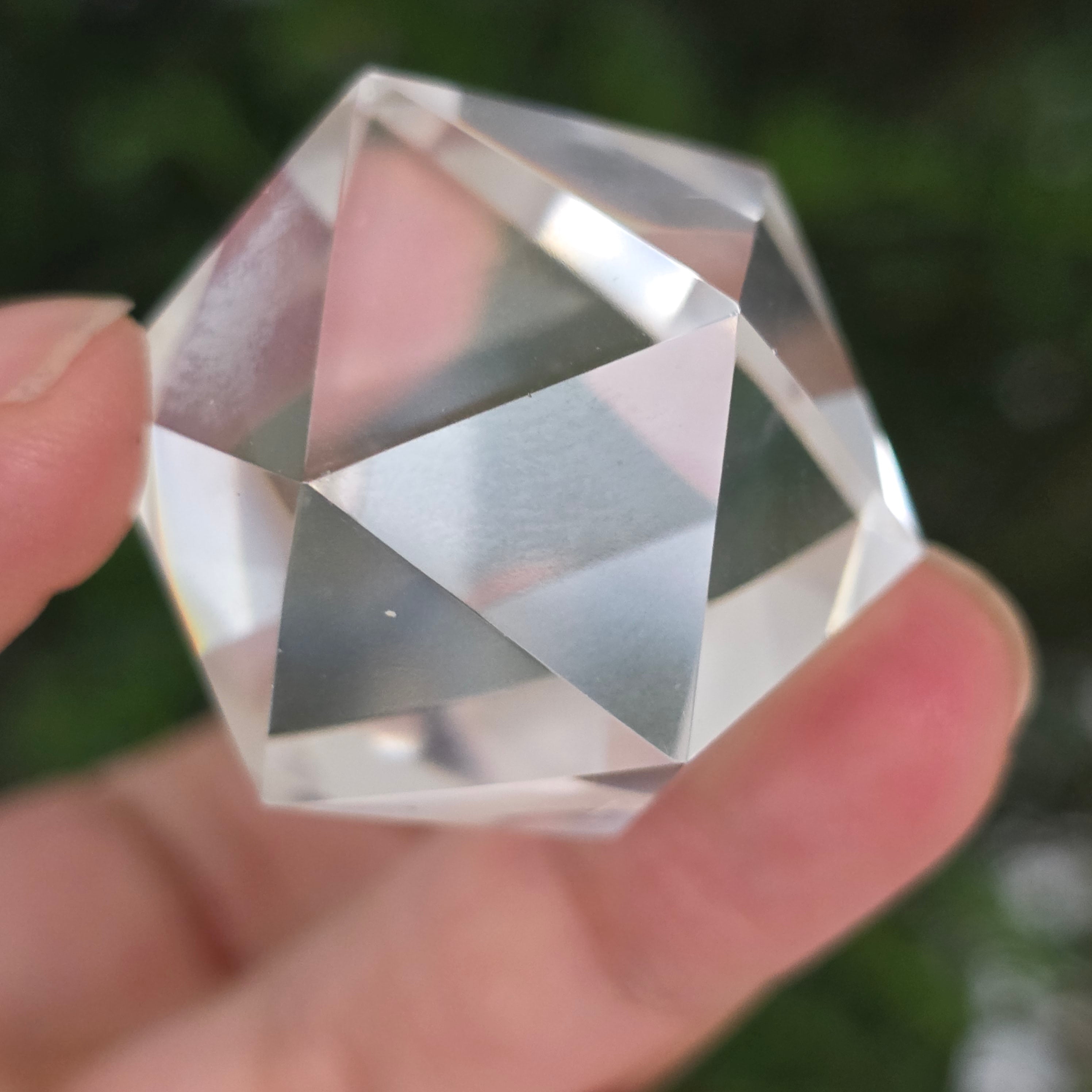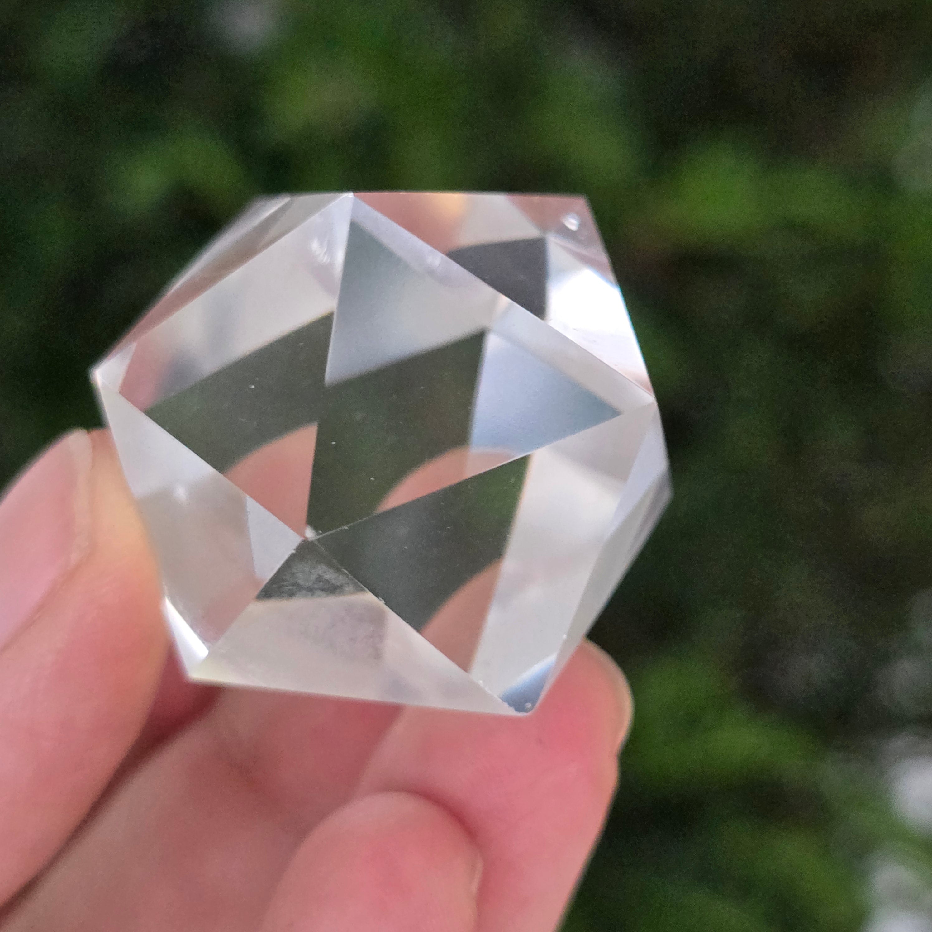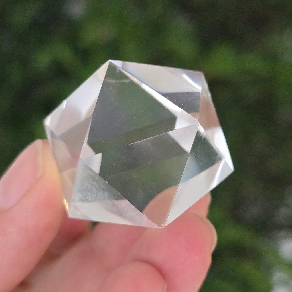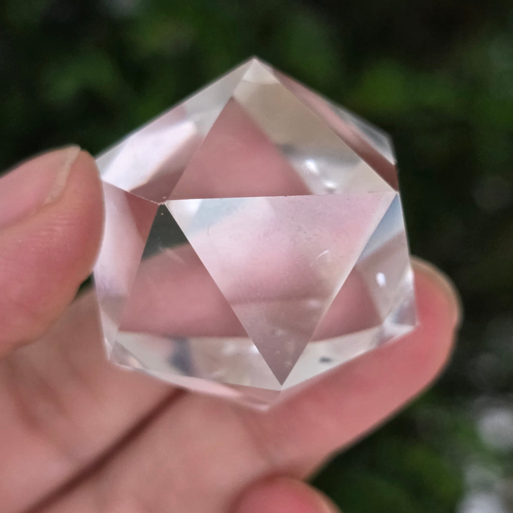 Ikosaedr z bezbarwnego kwarcu (kryształ górski), precyzyjnie ręcznie szlifowany w kształt ciała platońskiego z 20 równobocznymi trójkątnymi ścianami.