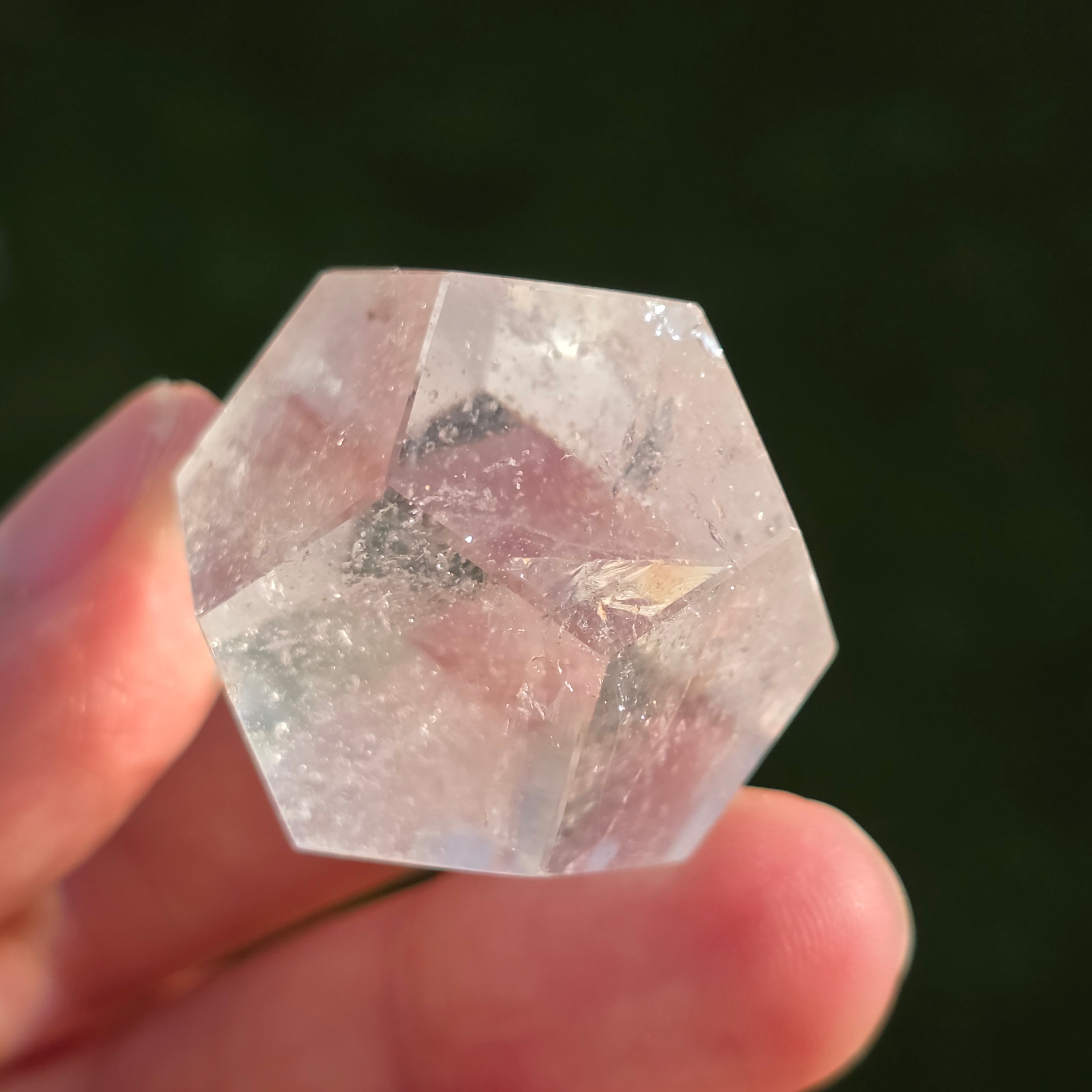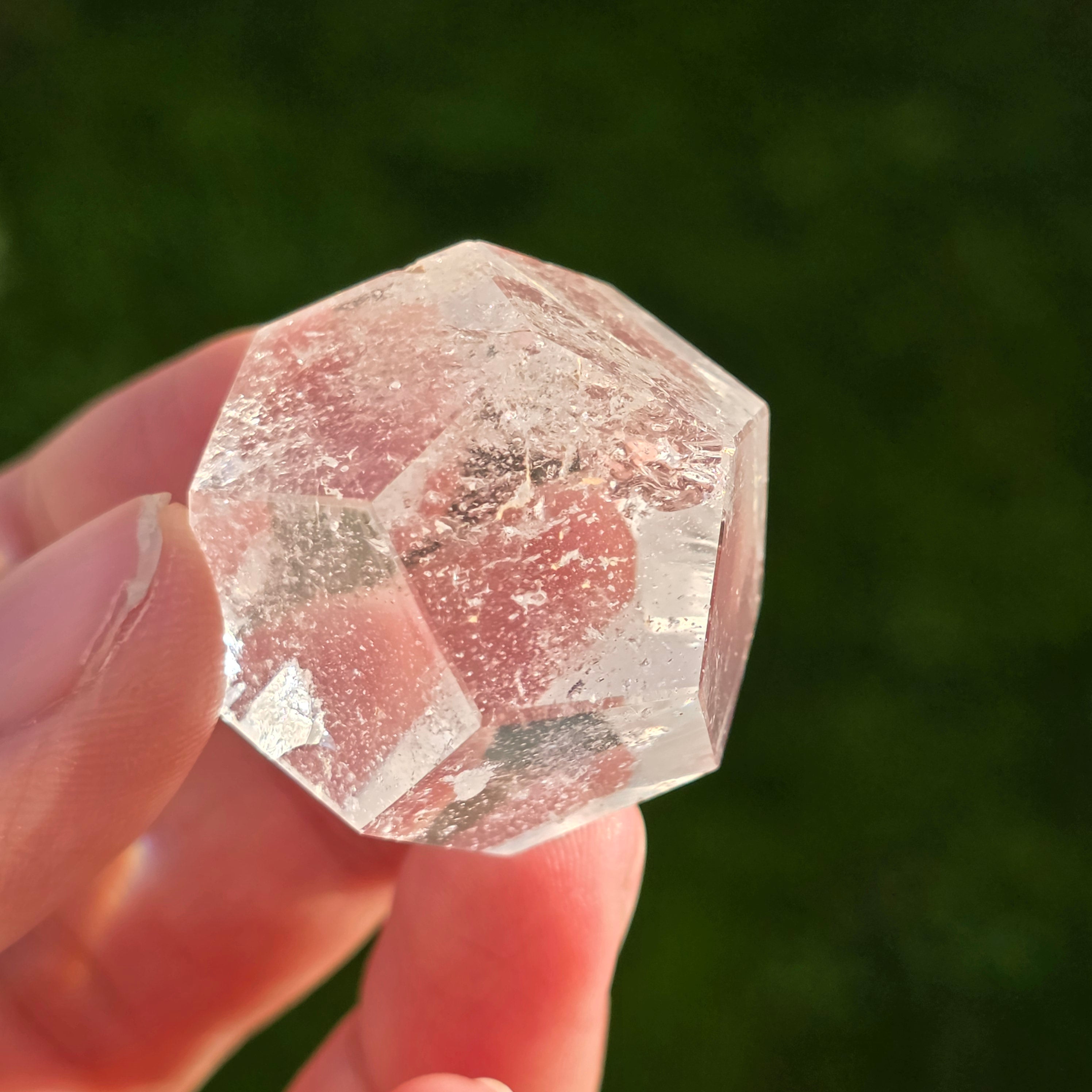 Icosaedr z bezbarwnego kwarcu (kryształ górski), precyzyjnie ręcznie szlifowany w kształt Platonicznego ciała o 20 równobocznych trójkątnych ścianach.