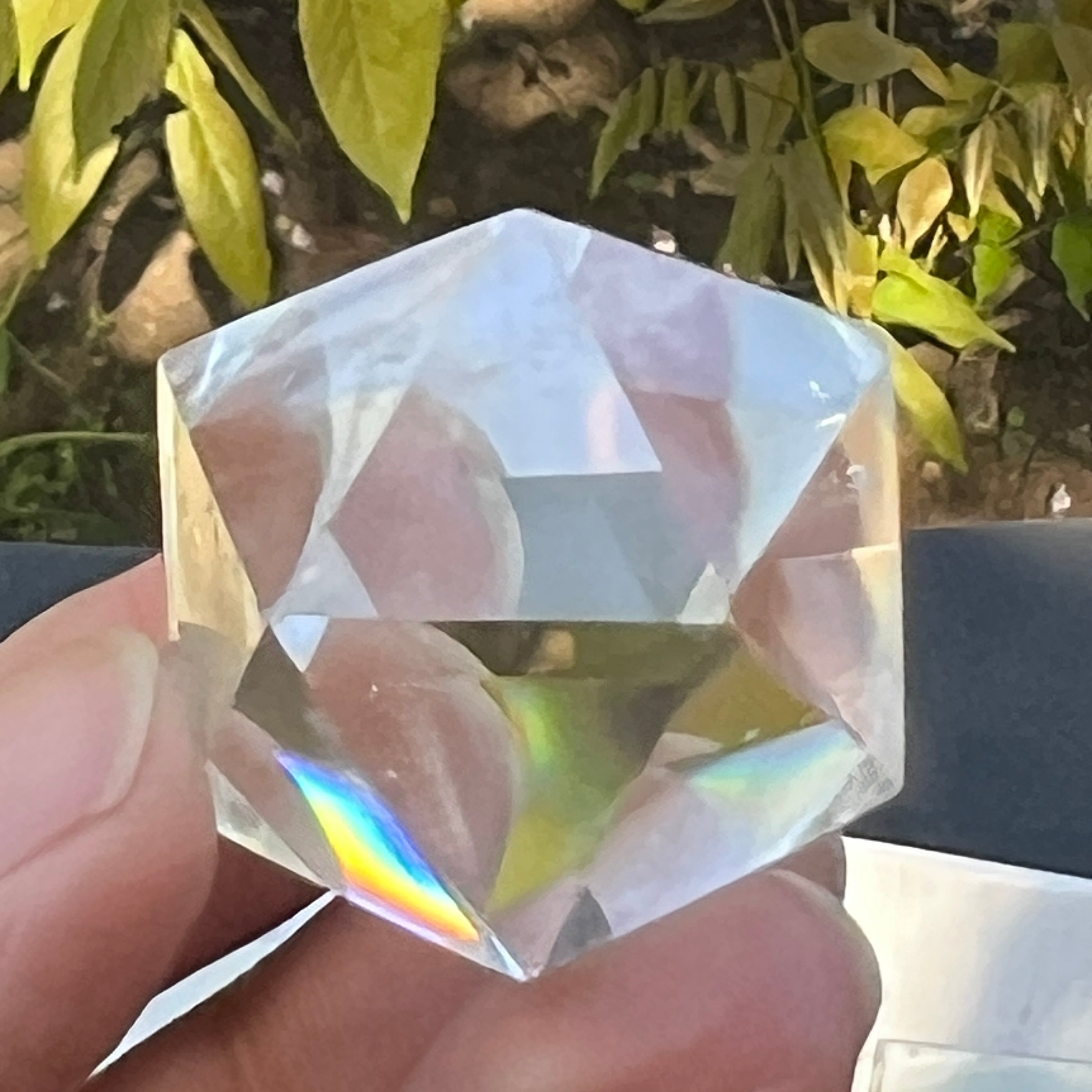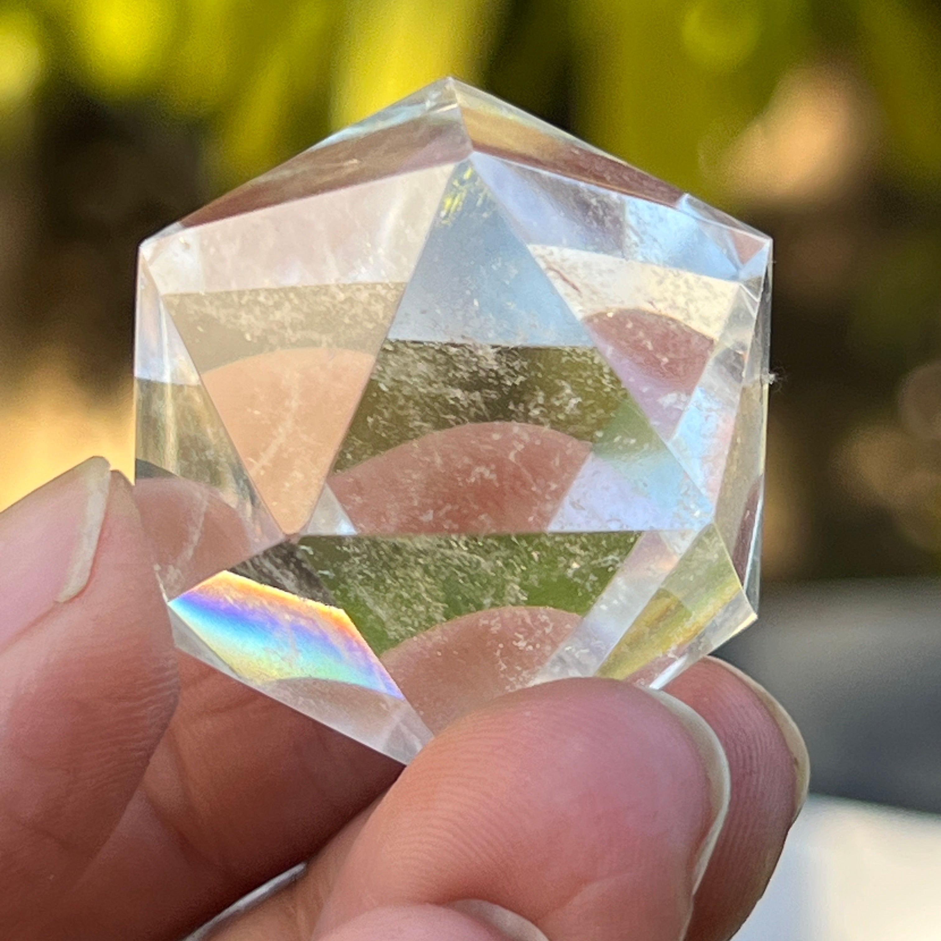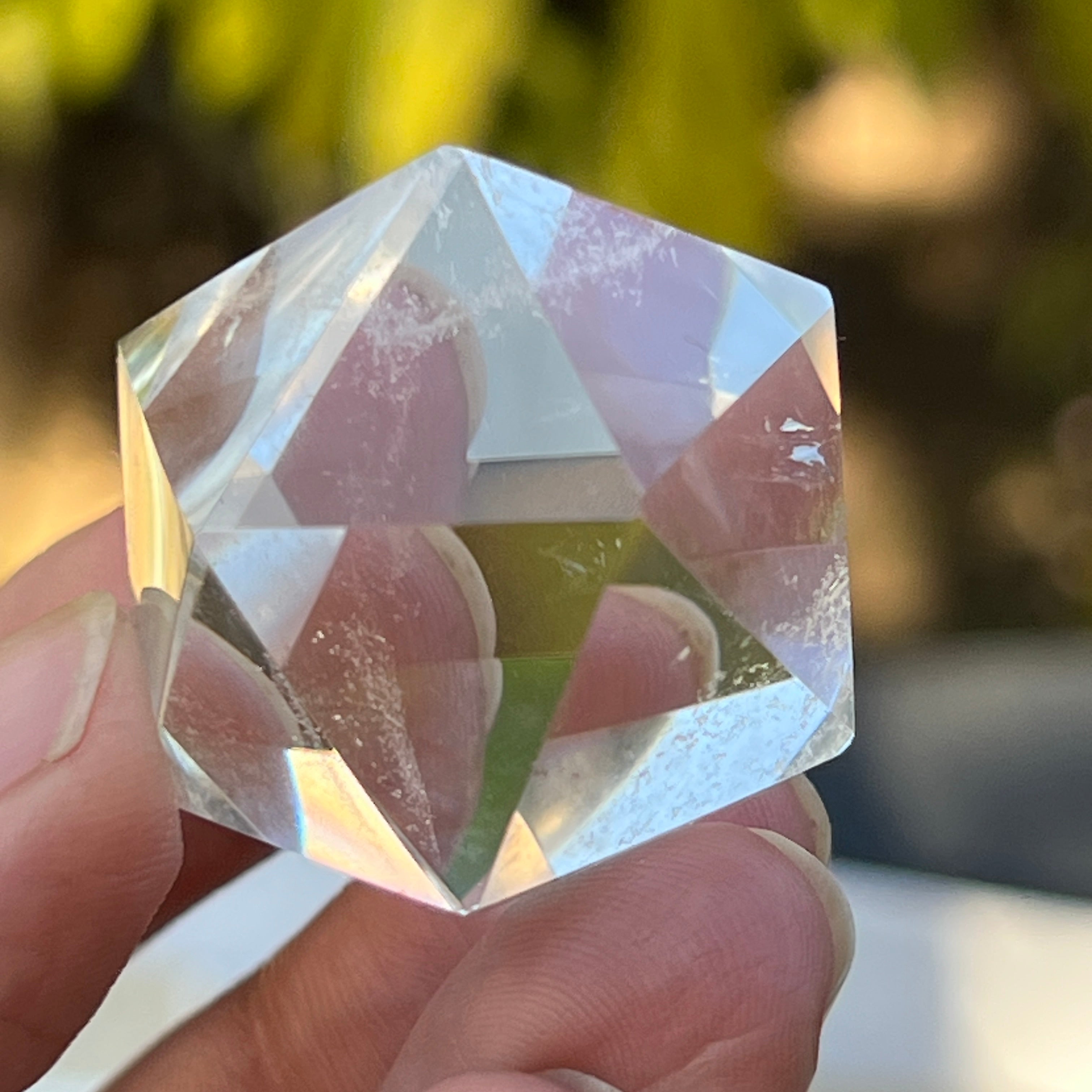 Ikosaedr z bezbarwnego kwarcu (kryształ górski), ręcznie szlifowany precyzyjnie w kształt ciała platońskiego z 20 równobocznymi trójkątnymi ścianami.