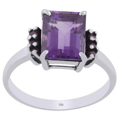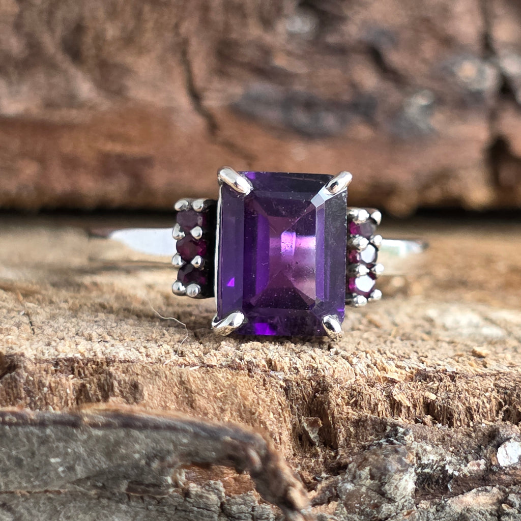 Un echilibru perfect între forță și rafinament – acest inel din argint 925 combină noblețea ametistului natural cu intensitatea pasională a rubinului.