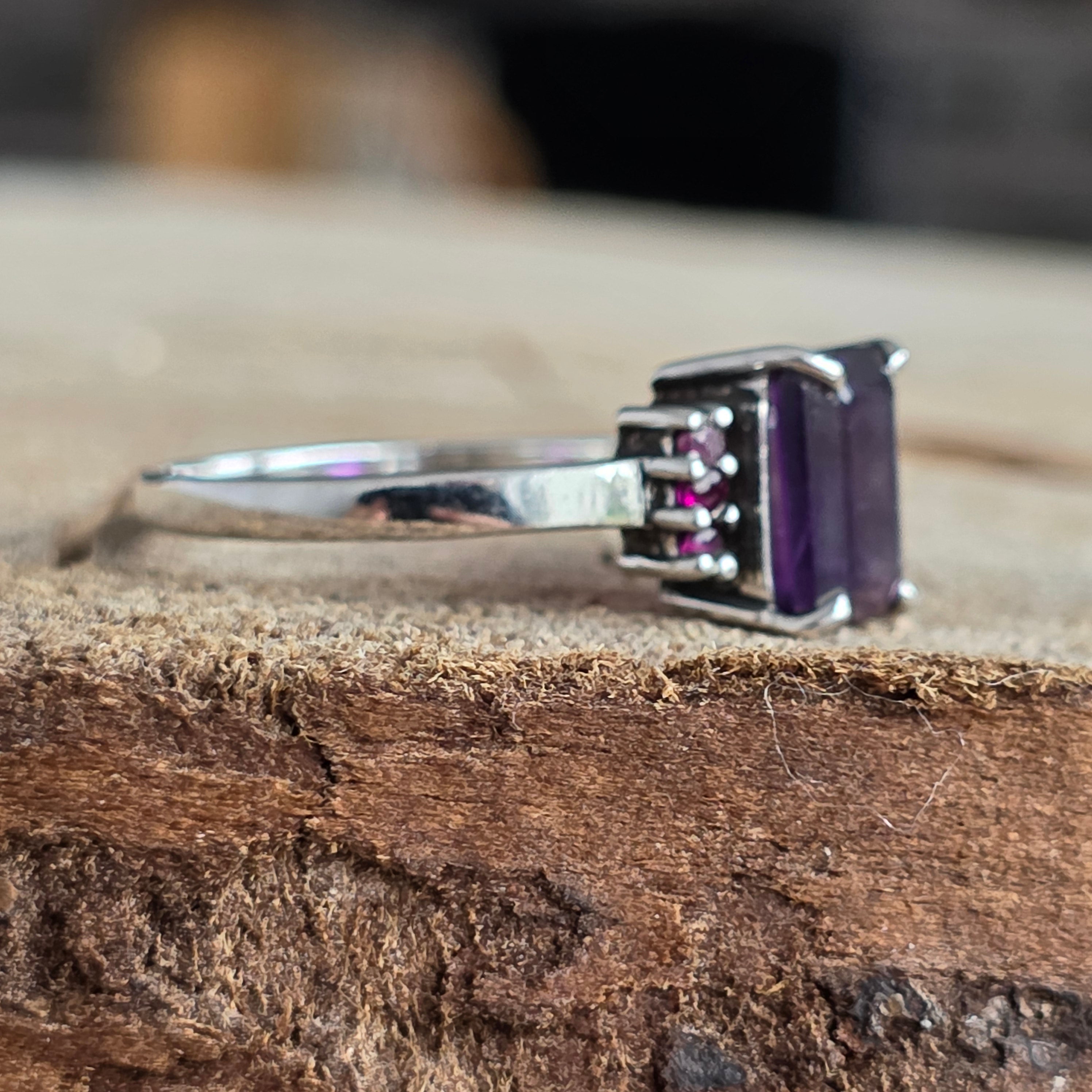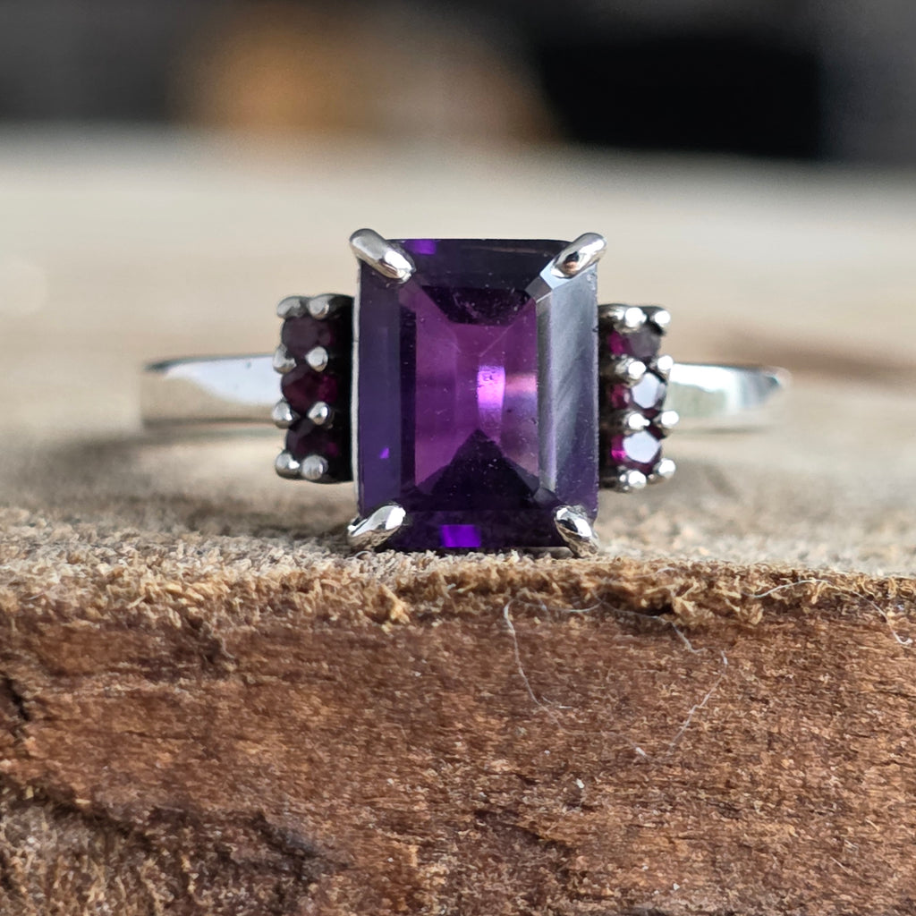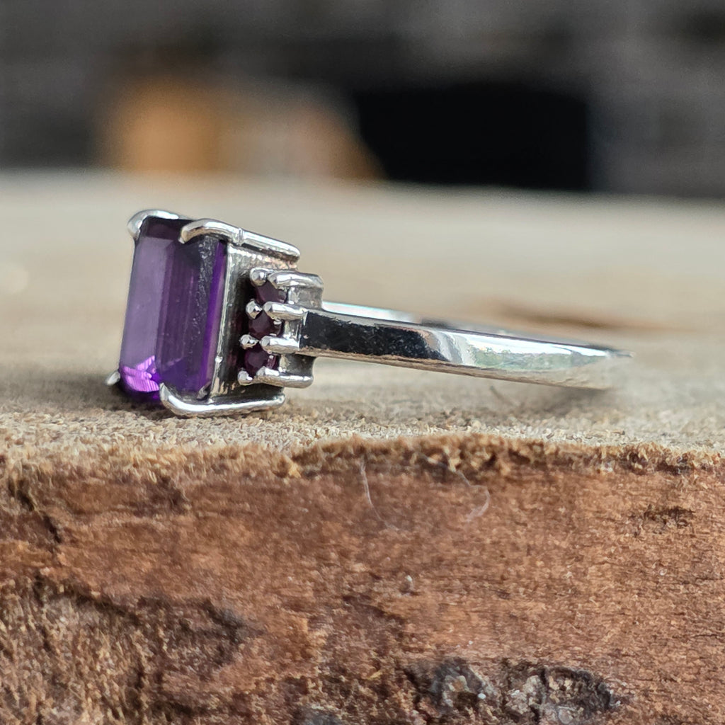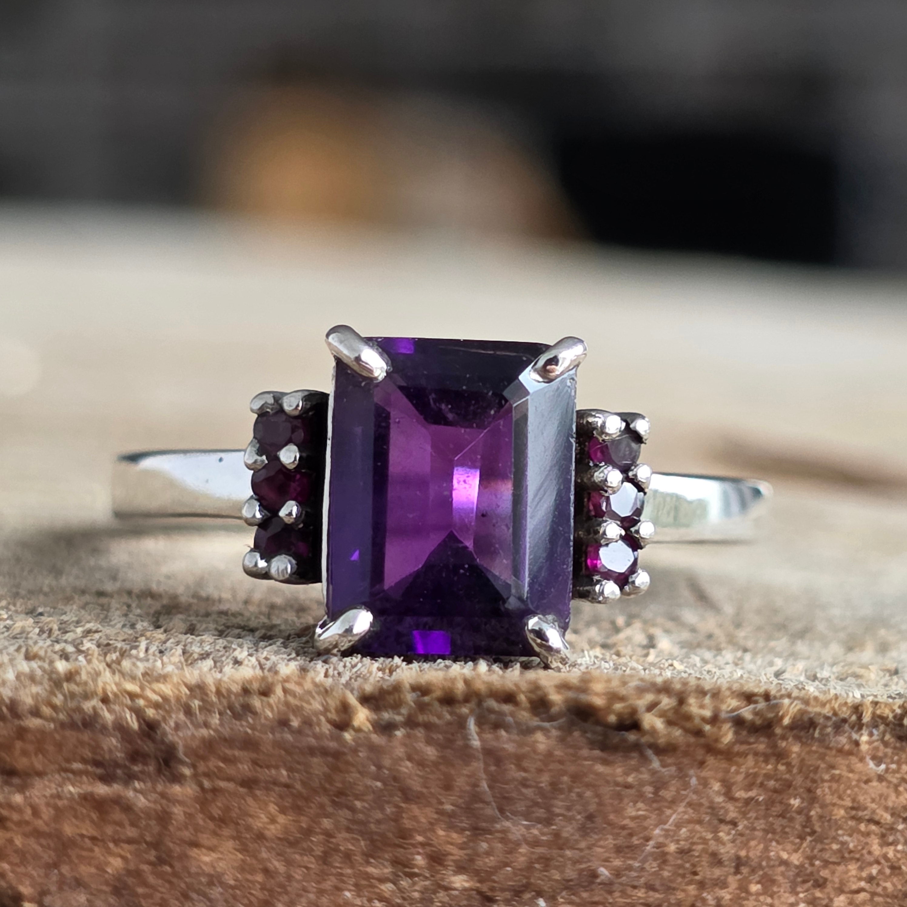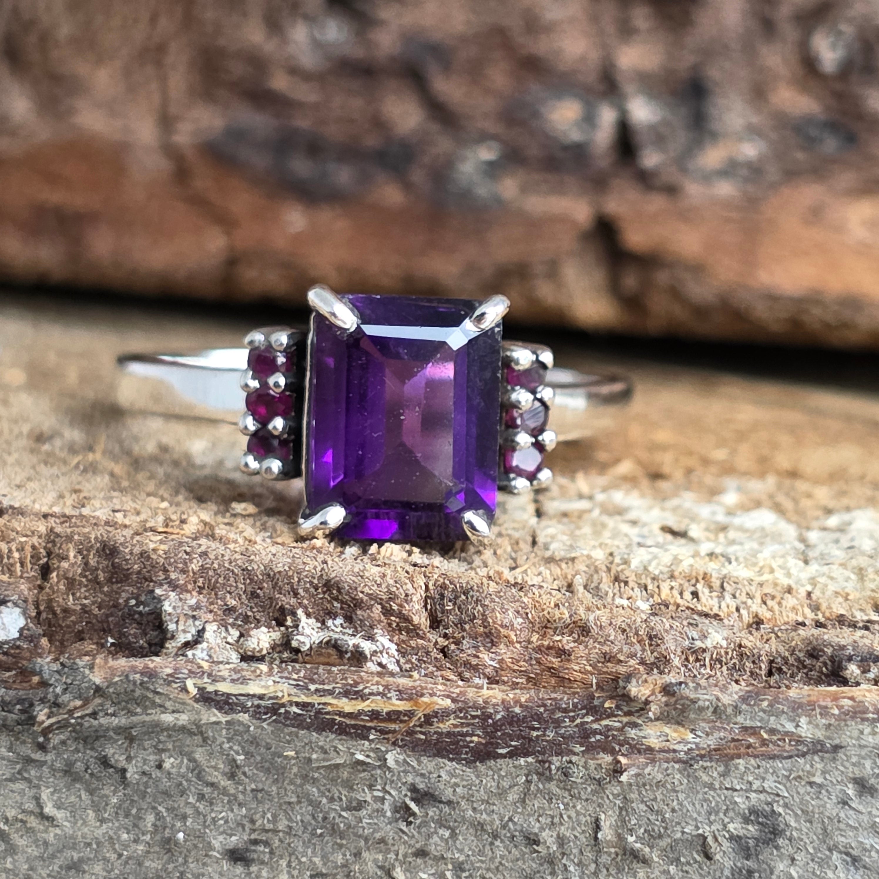 Tăietura rectangulară a ametistului reflectă lumina cu precizie geometrică, în timp ce rubinele rotunde de pe laterale adaugă o notă regală și profundă.