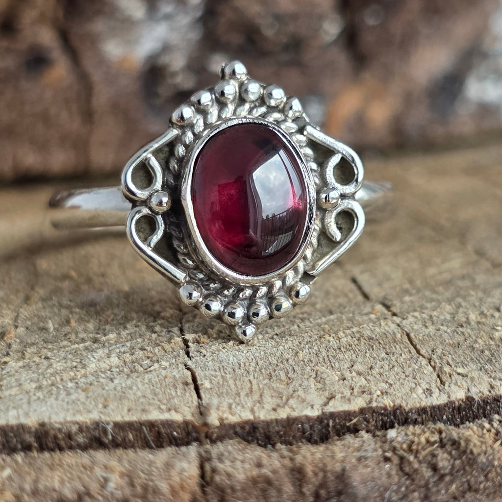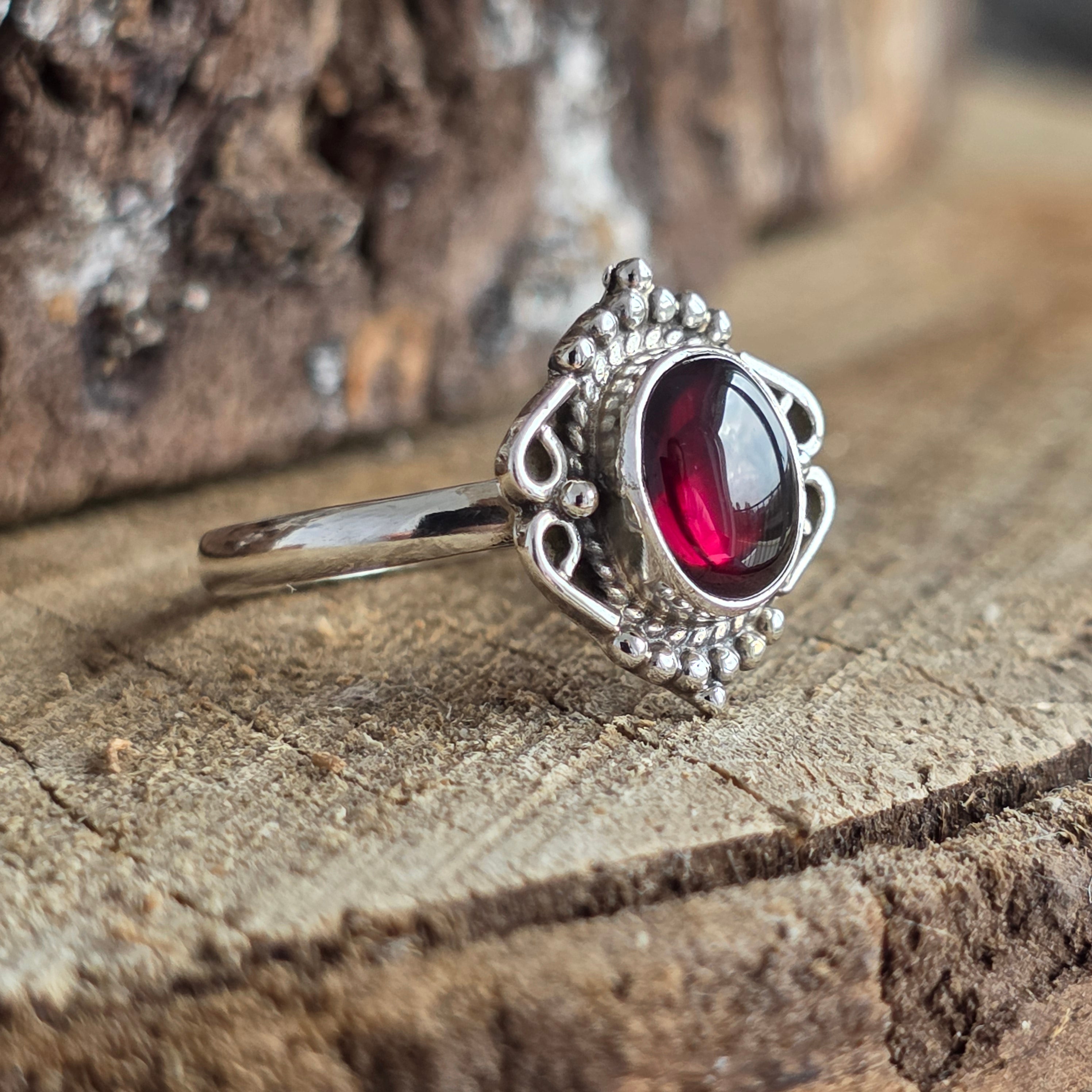 Un inel elegant și plin de caracter, lucrat din argint 925 și împodobit cu o piatră naturală de granat, cu nuanțe profunde de roșu rubiniu, ce prind viață în lumină.