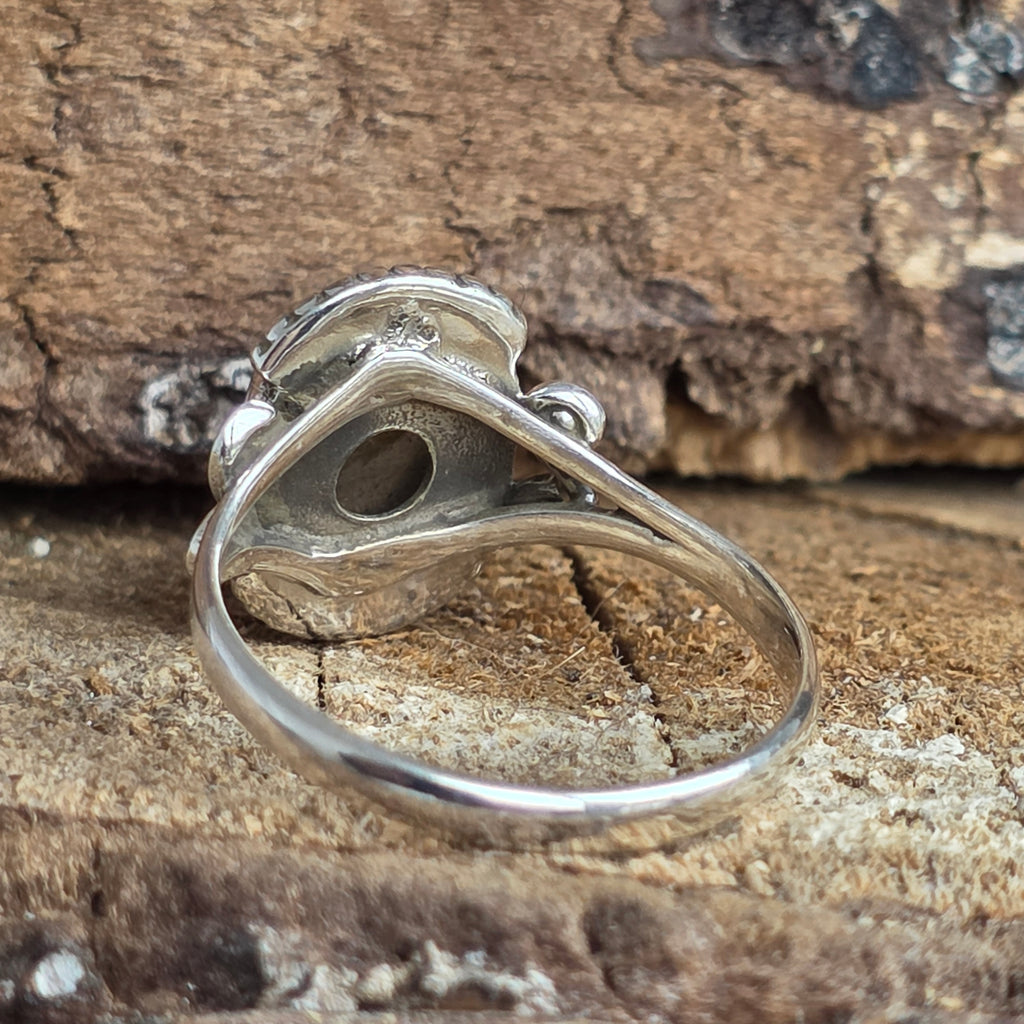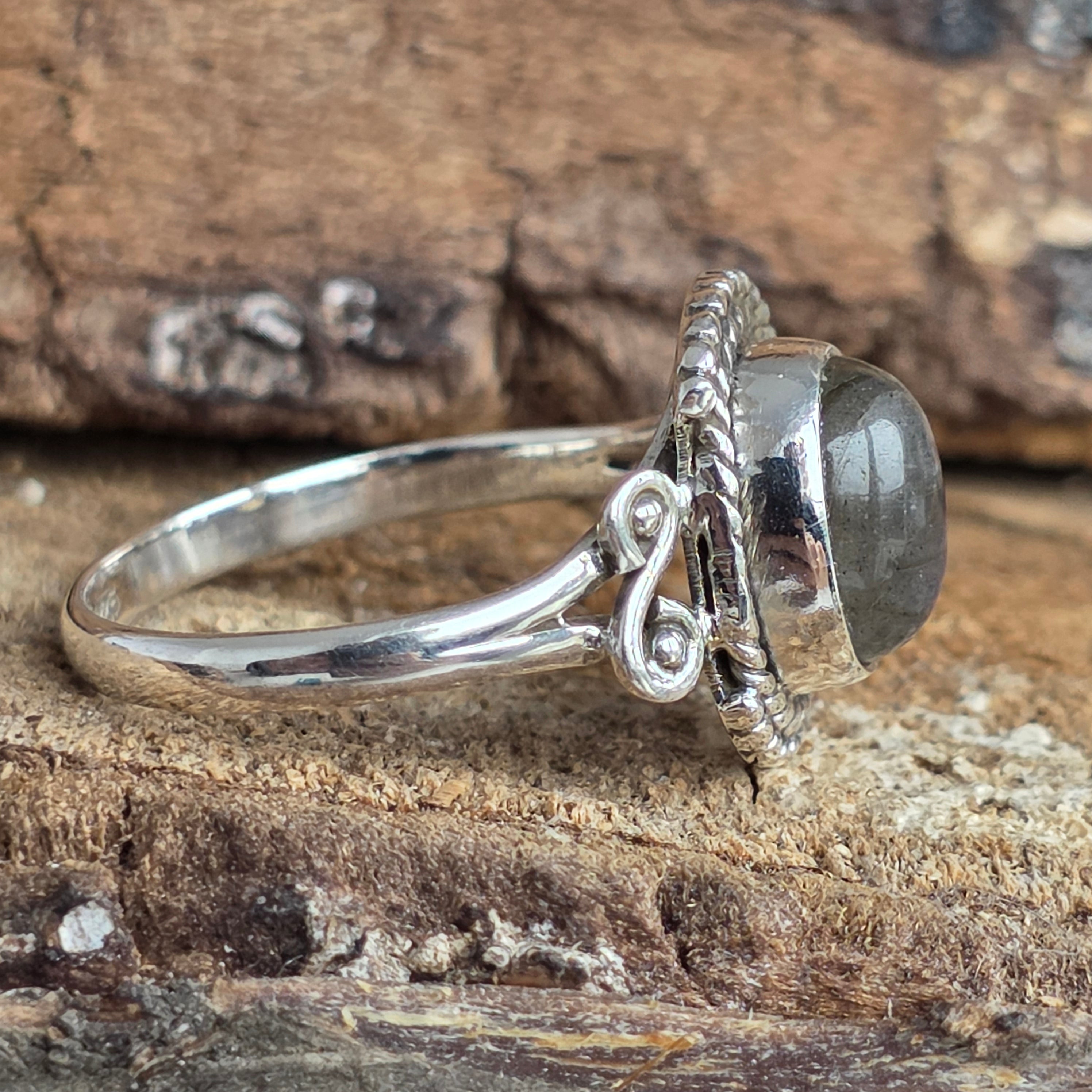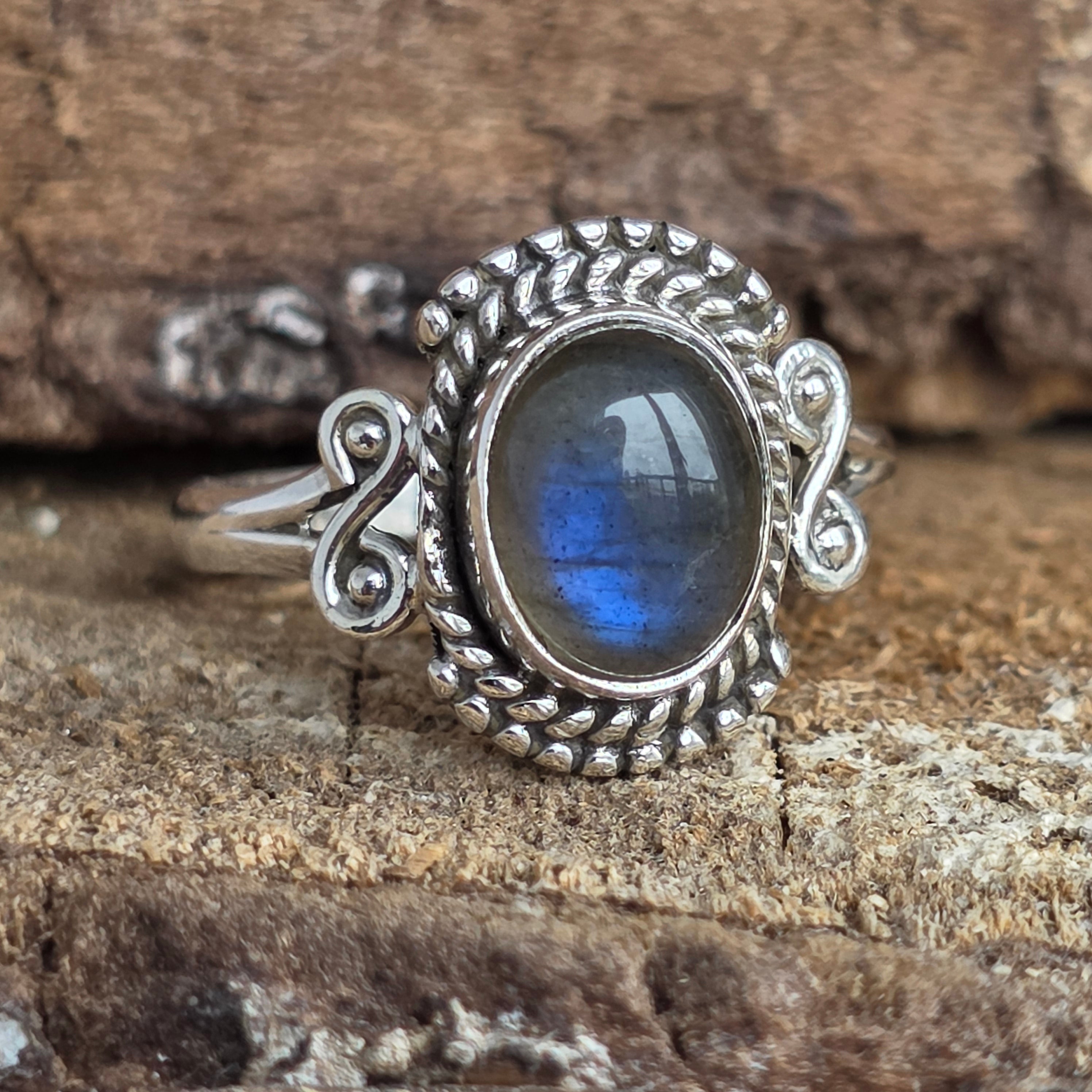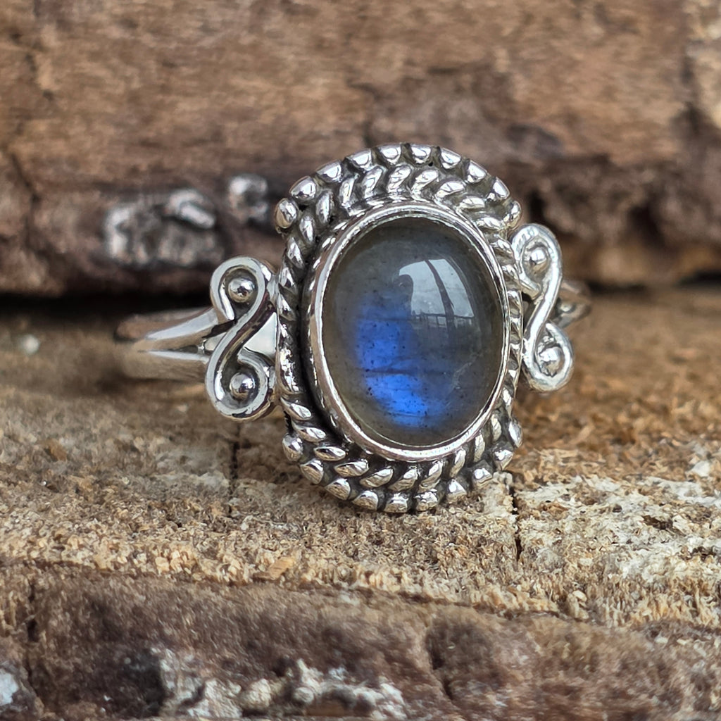 Un inel cu adevărat fermecător din argint 925, încrustat cu un labradorit natural ce dezvăluie reflexe albastre și aurii în funcție de lumină. Montura lucrată manual combină detalii fine rawa work cu accente sculptate în argint, rezultând o bijuterie cu aer boem și rafinat.