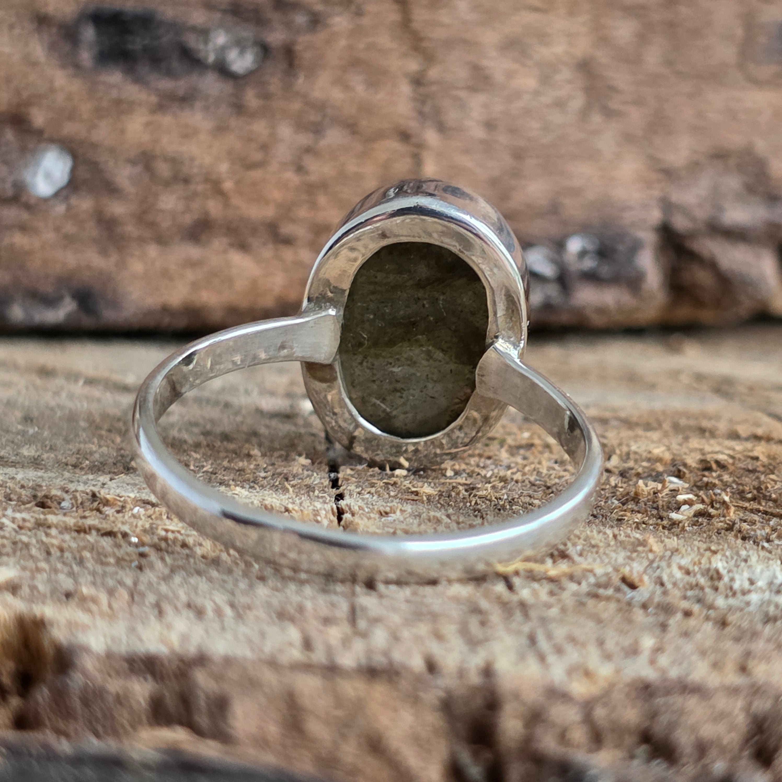 Un inel elegant din argint 925 cu labradorit natural, o piatră fascinantă cunoscută pentru irizațiile sale albastre și gri-aurii care par să danseze sub lumină. Designul minimalist pune în valoare frumusețea naturală a pietrei, oferindu-i o strălucire misterioasă și rafinată.