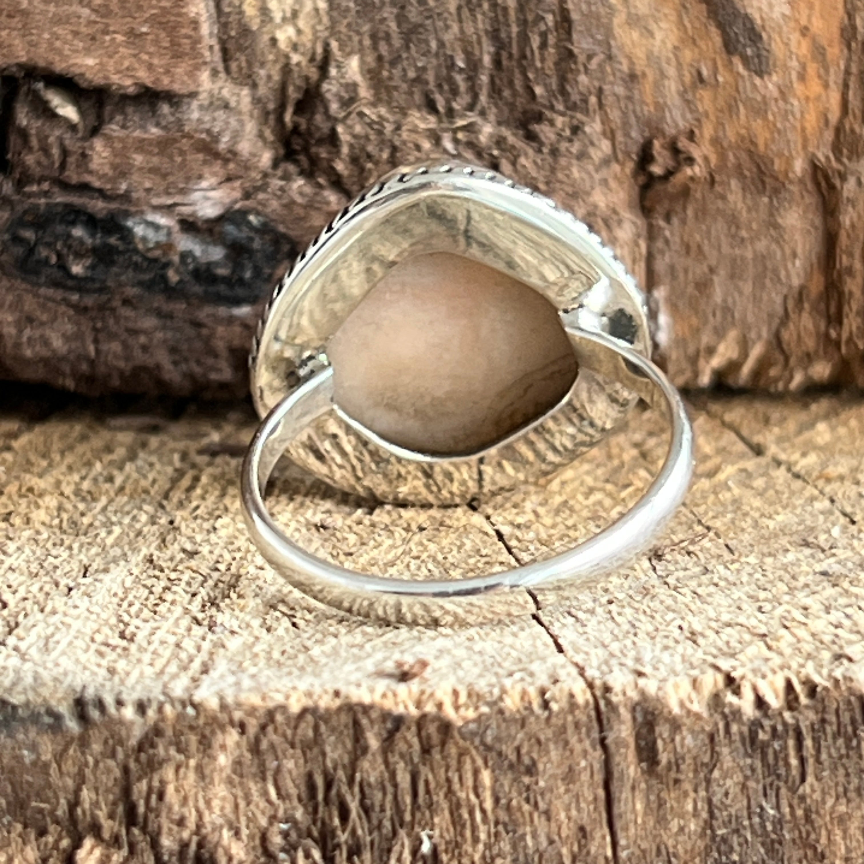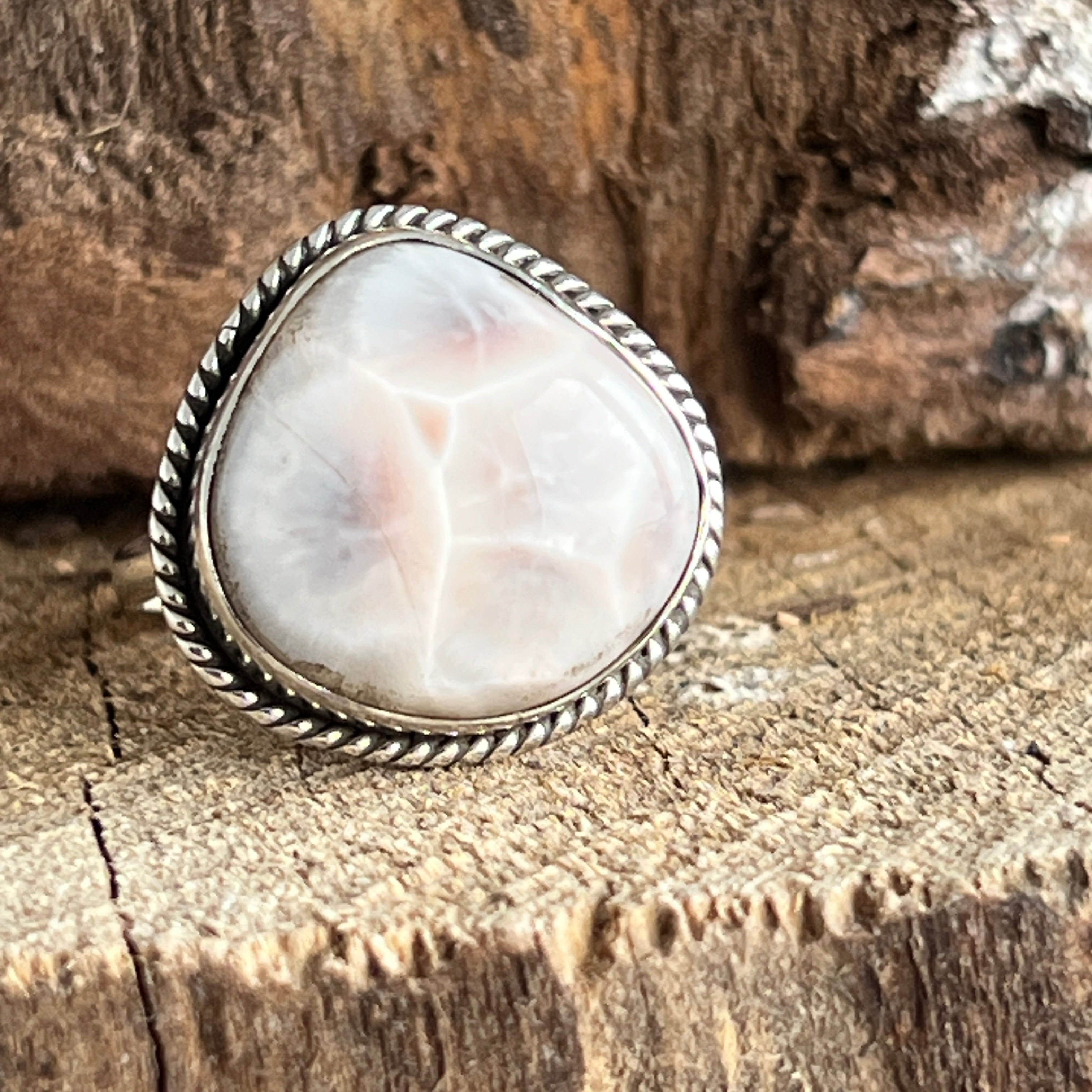 Acest inel din argint 925 emană o frumusețe delicată și calmă, grație pietrei de Pink Larimar, o varietate rară și rafinată, cu tonuri catifelate de roz pudrat și reflexe lăptoase.