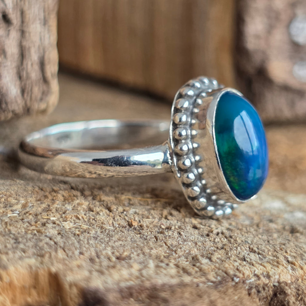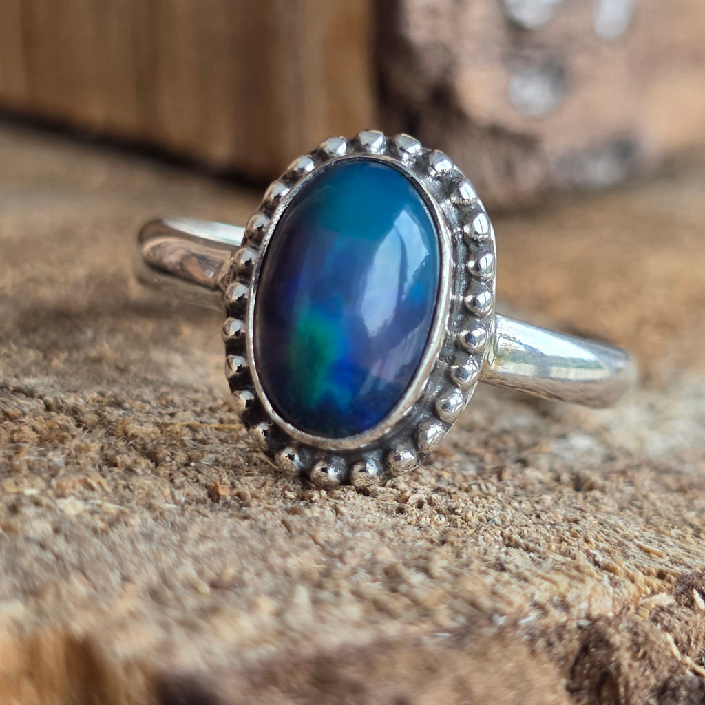 Un inel elegant și rafinat, realizat din argint 925, cu o piatră naturală de opal etiopian, cunoscută pentru reflexele sale irizante în nuanțe de verde, roșu și albastru. Designul minimalist plain wire setting permite pietrei să fie în centrul atenției, captând lumina din orice unghi.