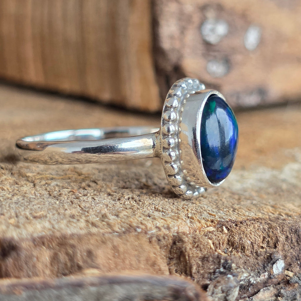 Un inel elegant și rafinat, realizat din argint 925, cu o piatră naturală de opal etiopian, cunoscută pentru reflexele sale irizante în nuanțe de verde, roșu și albastru. Designul minimalist plain wire setting permite pietrei să fie în centrul atenției, captând lumina din orice unghi.