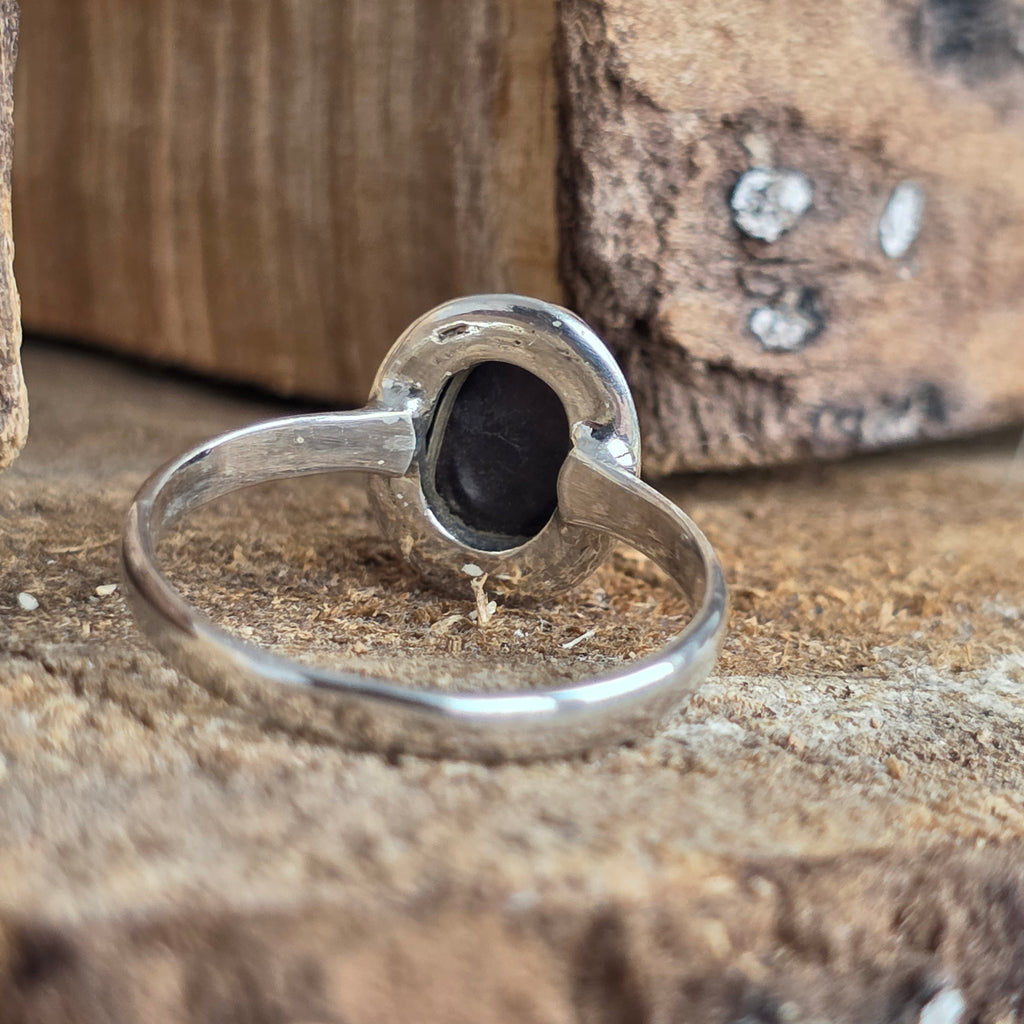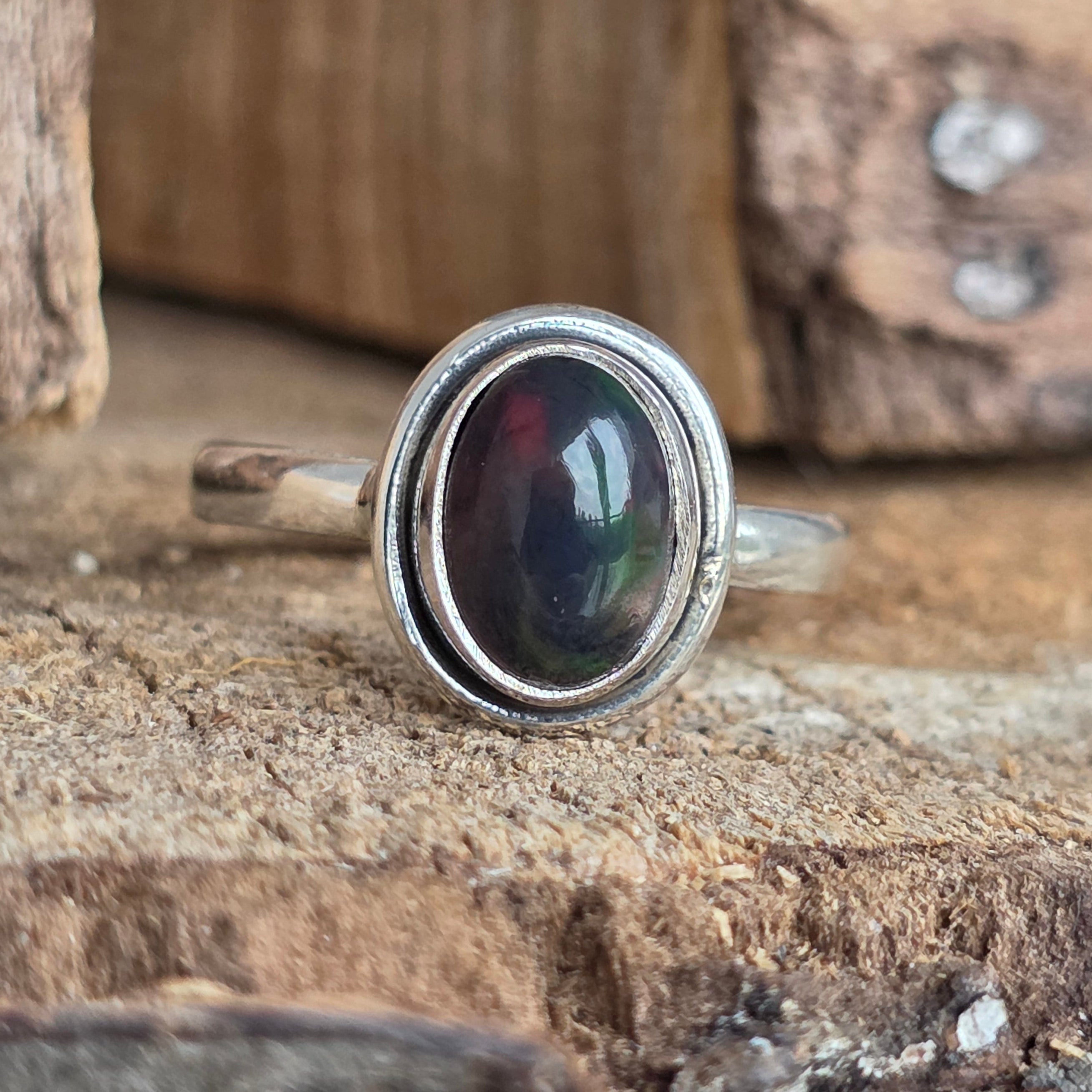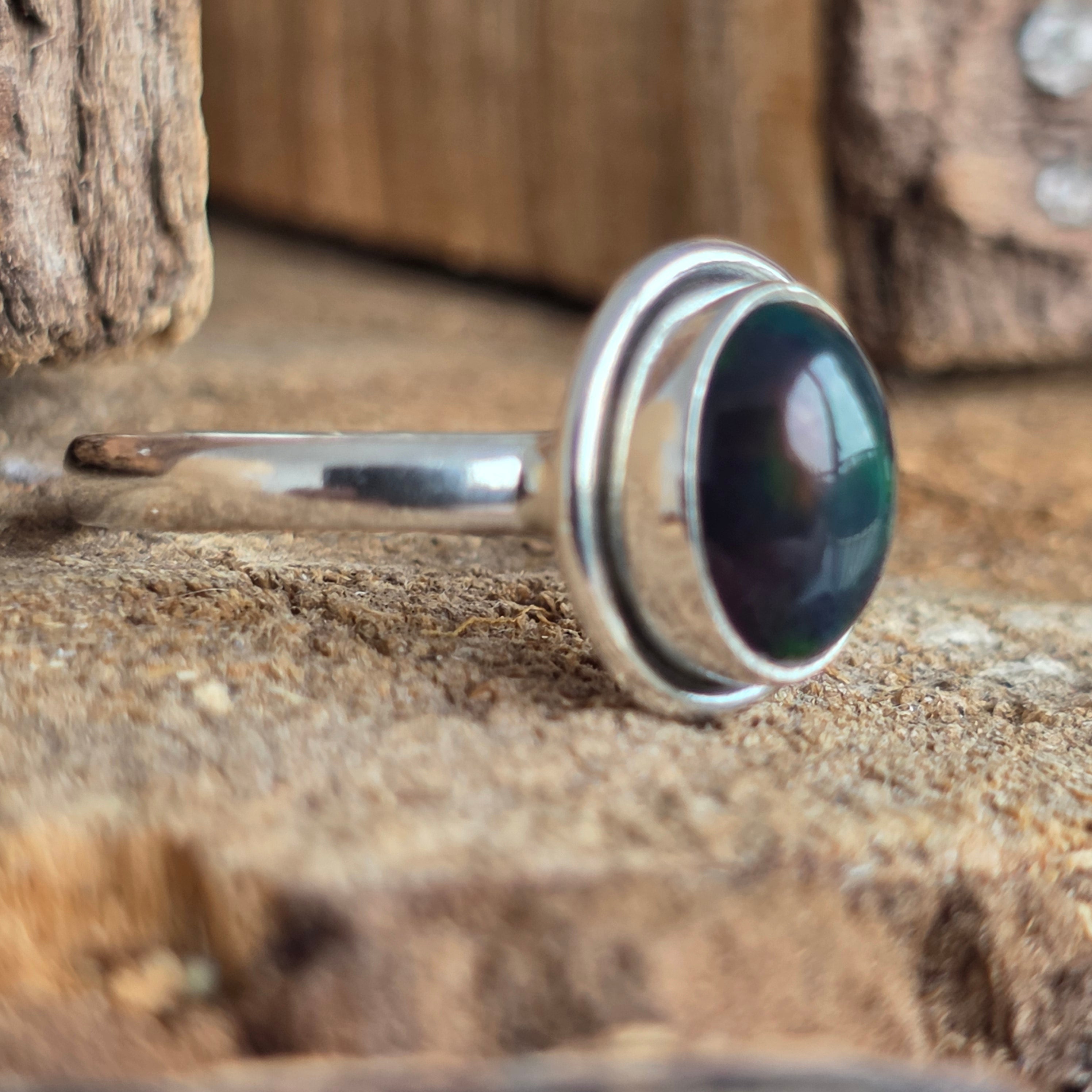 Un inel elegant și rafinat, realizat din argint 925, cu o piatră naturală de opal etiopian, cunoscută pentru reflexele sale irizante în nuanțe de verde, roșu și albastru. Designul minimalist plain wire setting permite pietrei să fie în centrul atenției, captând lumina din orice unghi.