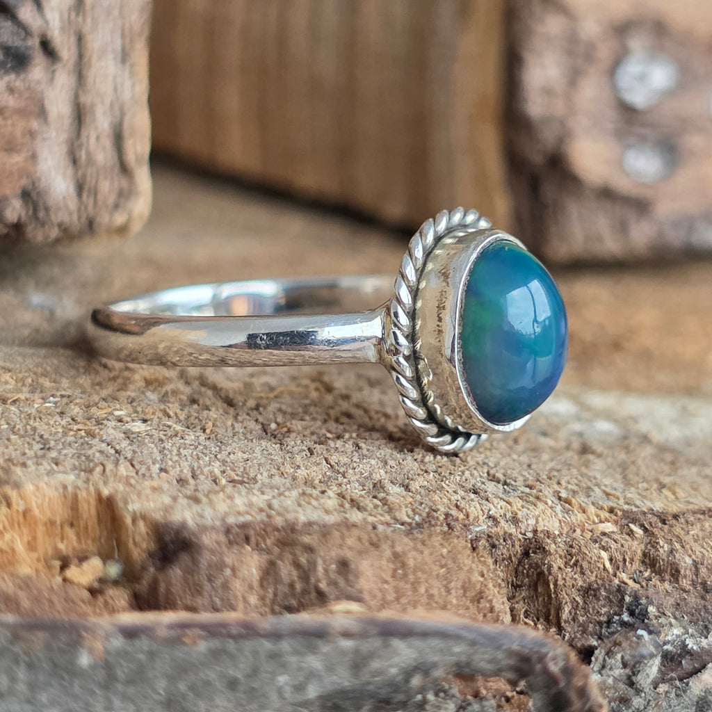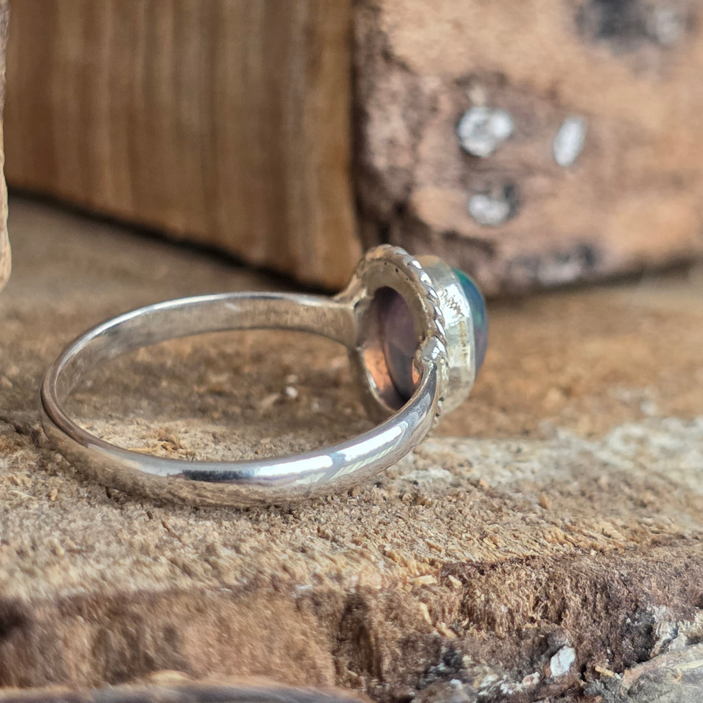 Un inel elegant și rafinat, realizat din argint 925, cu o piatră naturală de opal etiopian, cunoscută pentru reflexele sale irizante în nuanțe de verde, roșu și albastru. Designul minimalist plain wire setting permite pietrei să fie în centrul atenției, captând lumina din orice unghi.