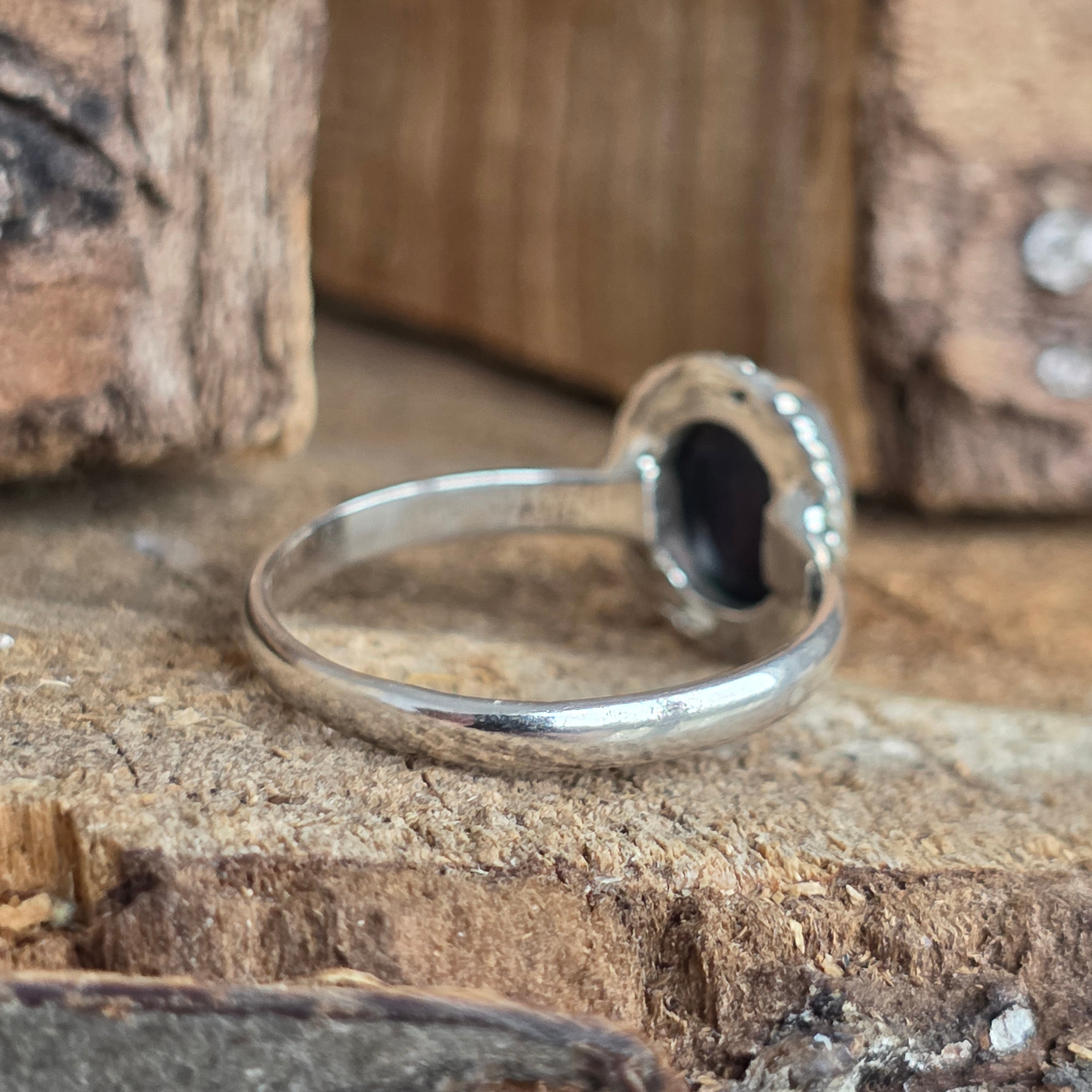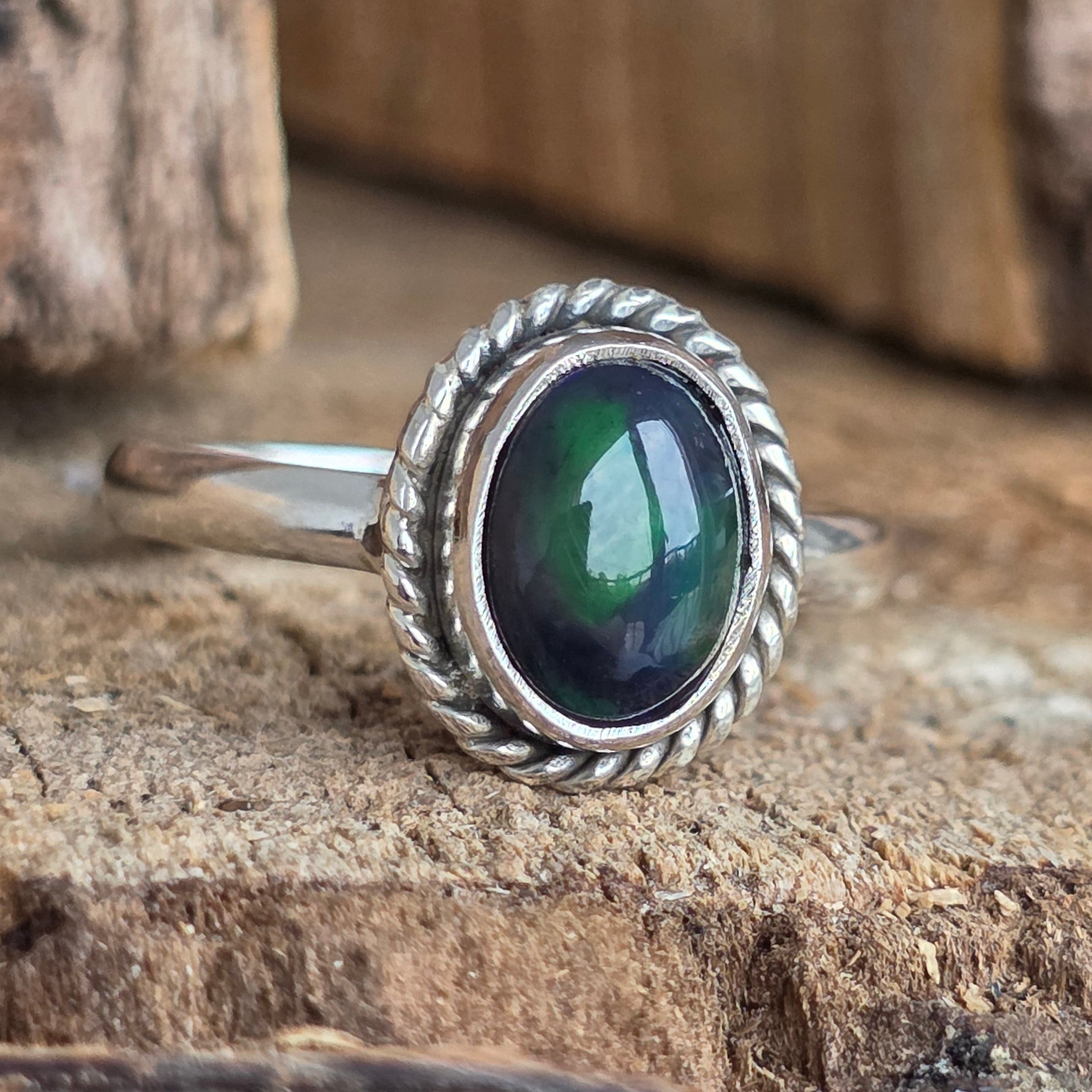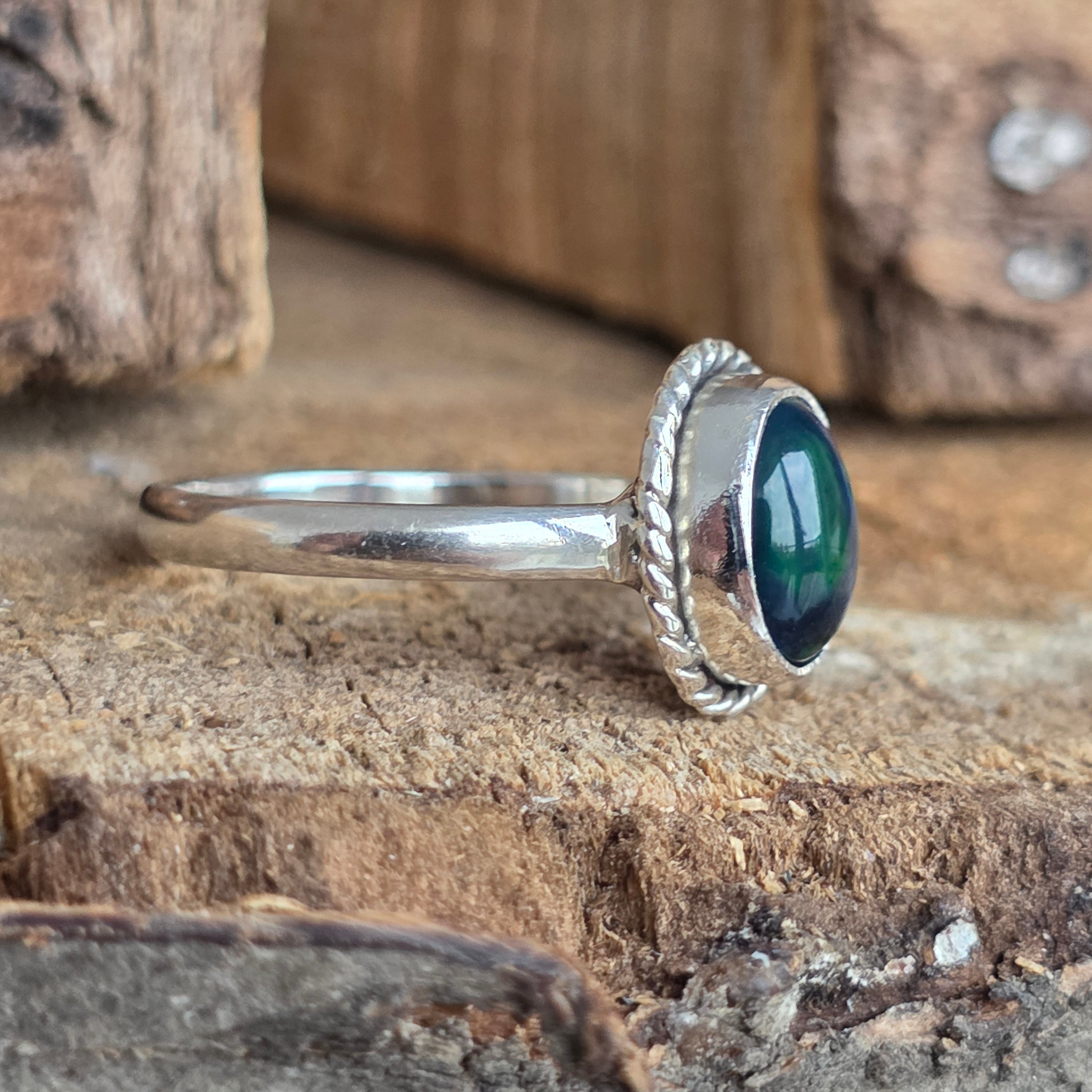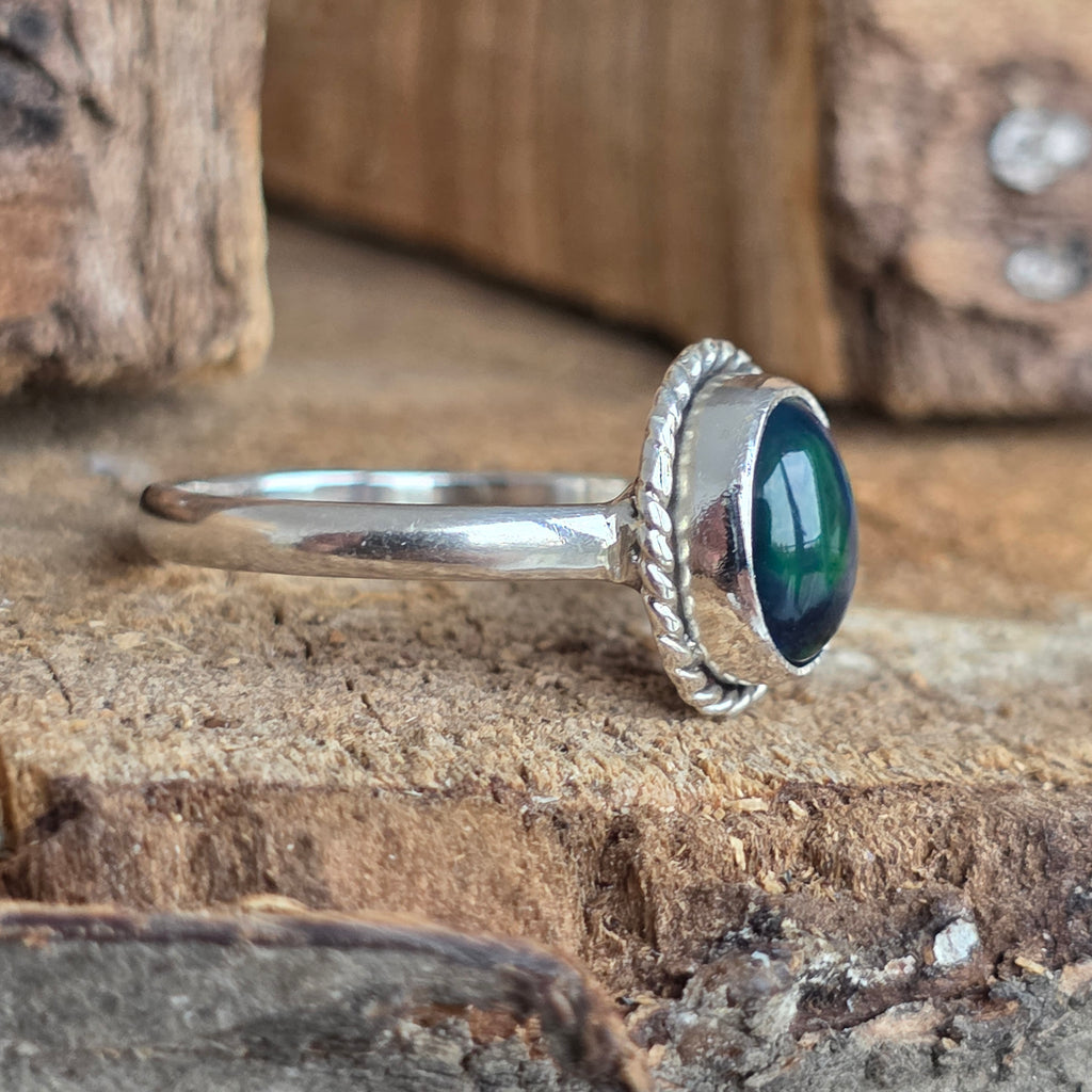 Un inel elegant și rafinat, realizat din argint 925, cu o piatră naturală de opal etiopian, cunoscută pentru reflexele sale irizante în nuanțe de verde, roșu și albastru. Designul minimalist plain wire setting permite pietrei să fie în centrul atenției, captând lumina din orice unghi.