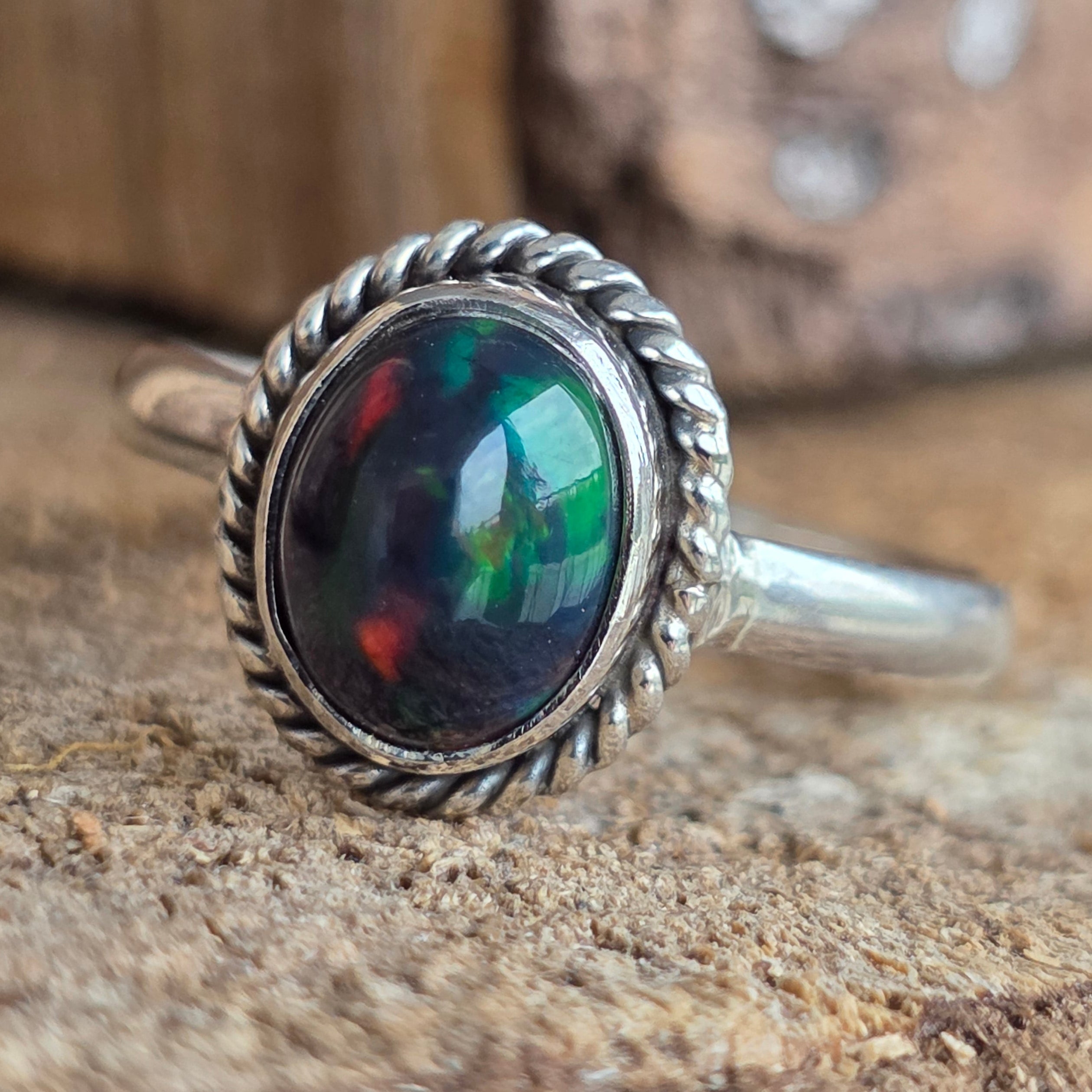 Un inel elegant și rafinat, realizat din argint 925, cu o piatră naturală de opal etiopian, cunoscută pentru reflexele sale irizante în nuanțe de verde, roșu și albastru. Designul minimalist plain wire setting permite pietrei să fie în centrul atenției, captând lumina din orice unghi.
