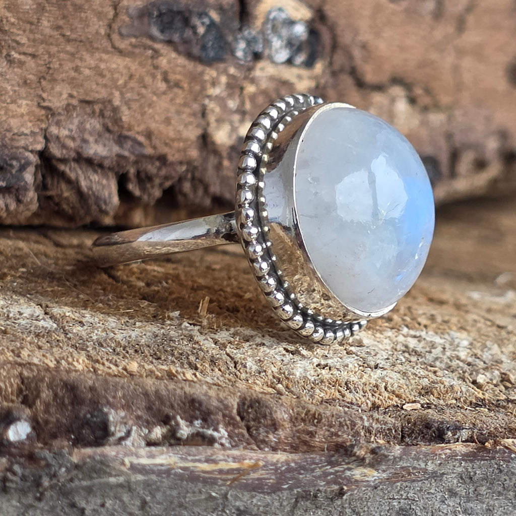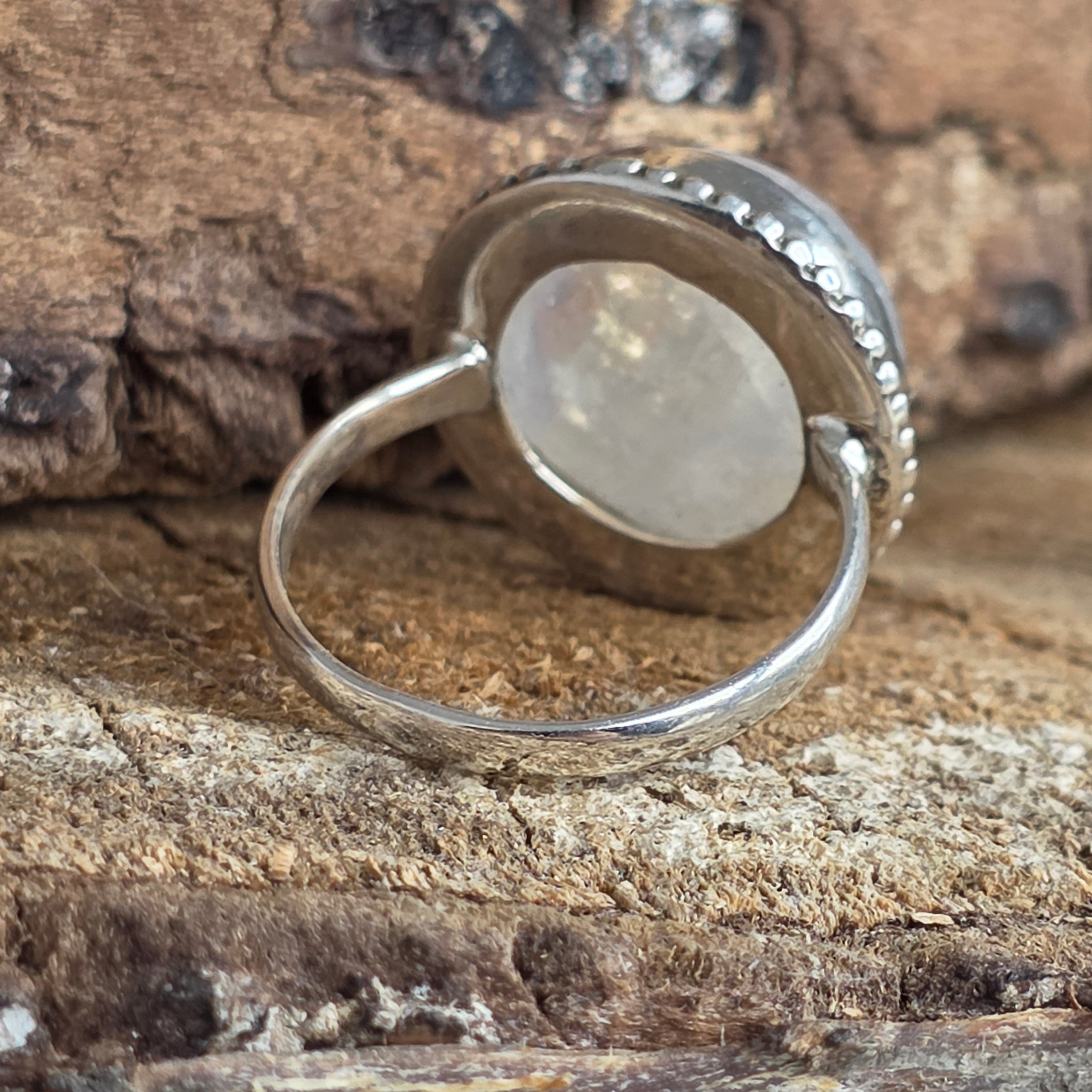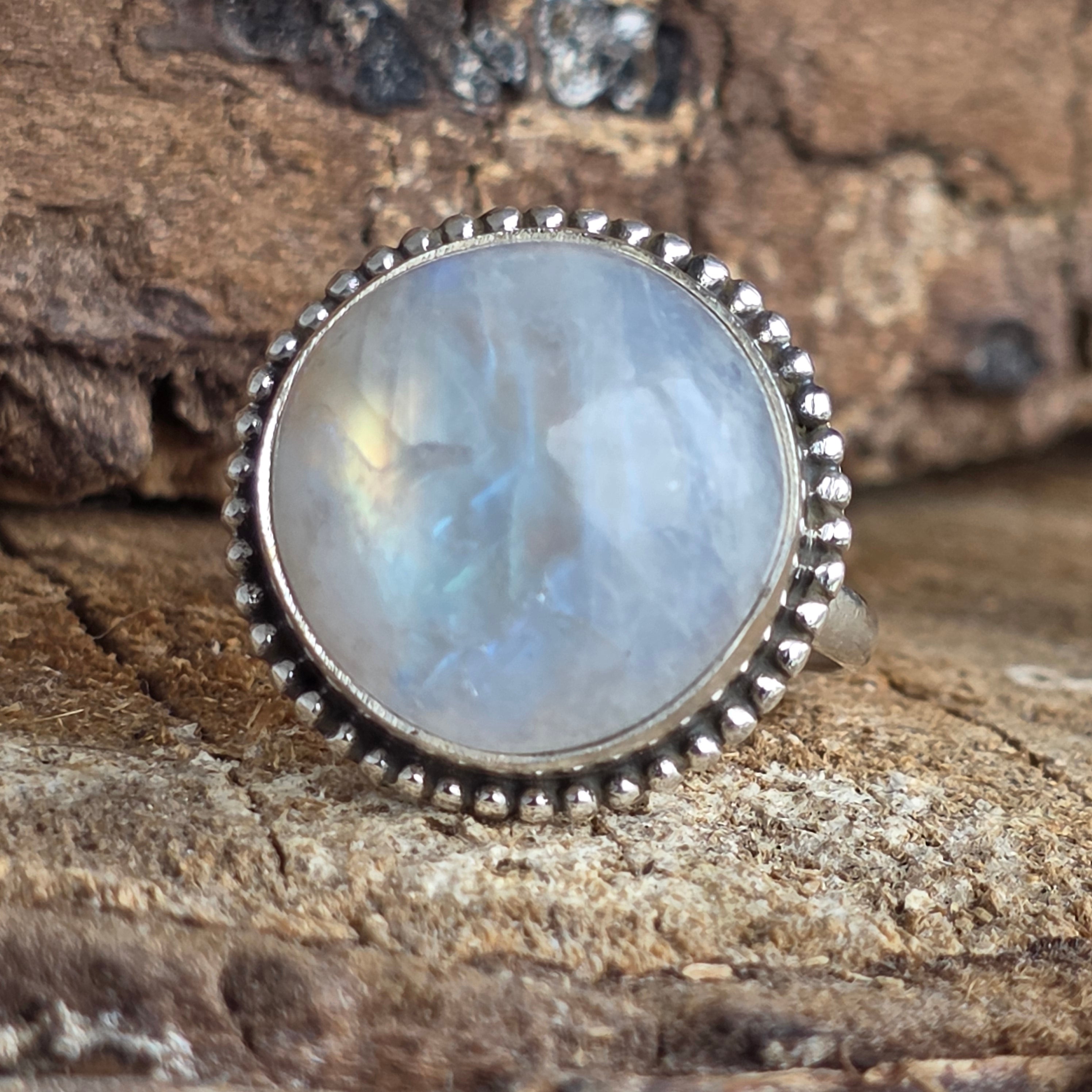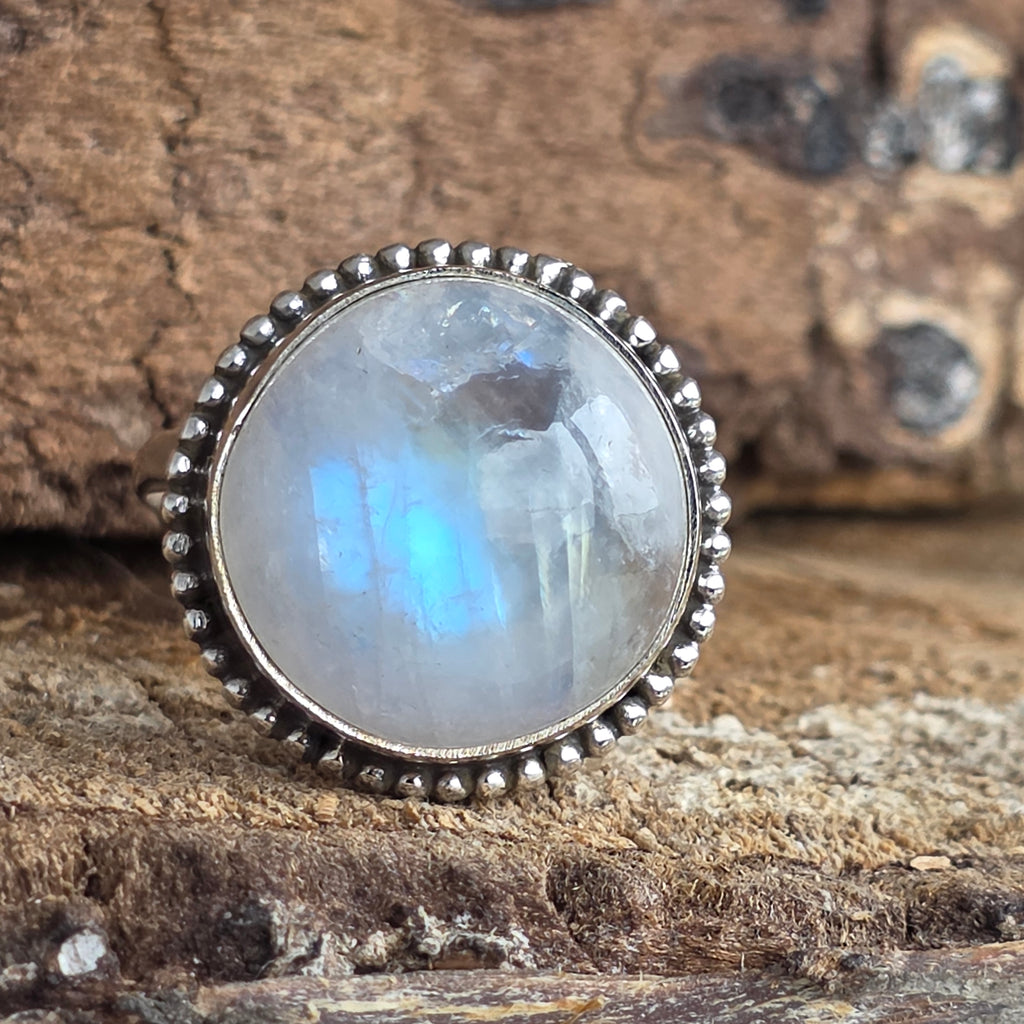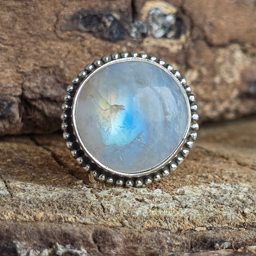 Un inel spectaculos din argint 925, cu piatră lunii curcubeu naturală, a cărei strălucire translucidă dezvăluie tonuri albastre și argintii la fiecare mișcare. Montura rawa work, lucrată manual, oferă un aer boem și sofisticat, făcând din această piesă o bijuterie cu adevărat unică.