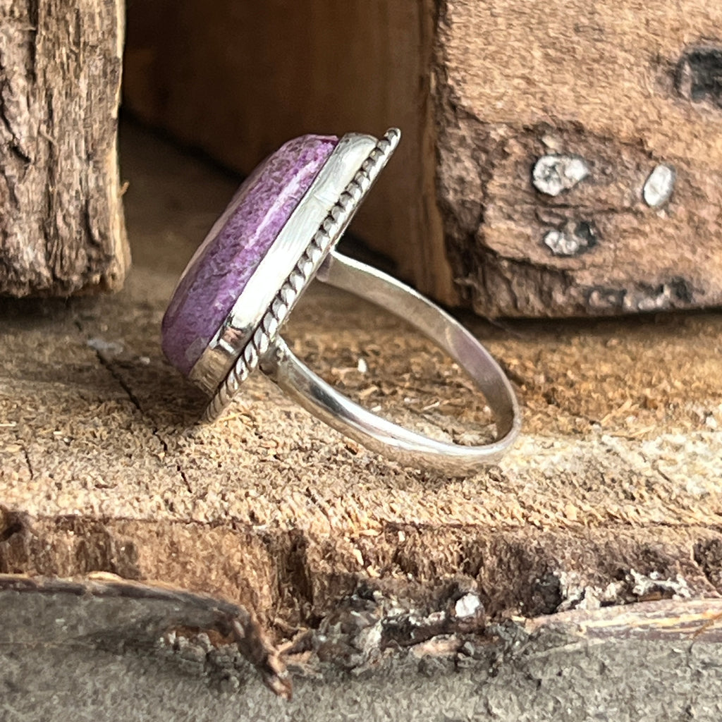 Un inel elegant și expresiv, realizat manual din argint 925 și decorat cu o piatră naturală de Purpurit, cu nuanțe de violet intens și reflexe mate specifice acestei pietre rare. Designul twisted wire încadrează piatra cu finețe, punând în valoare textura sa brută și autentică.
