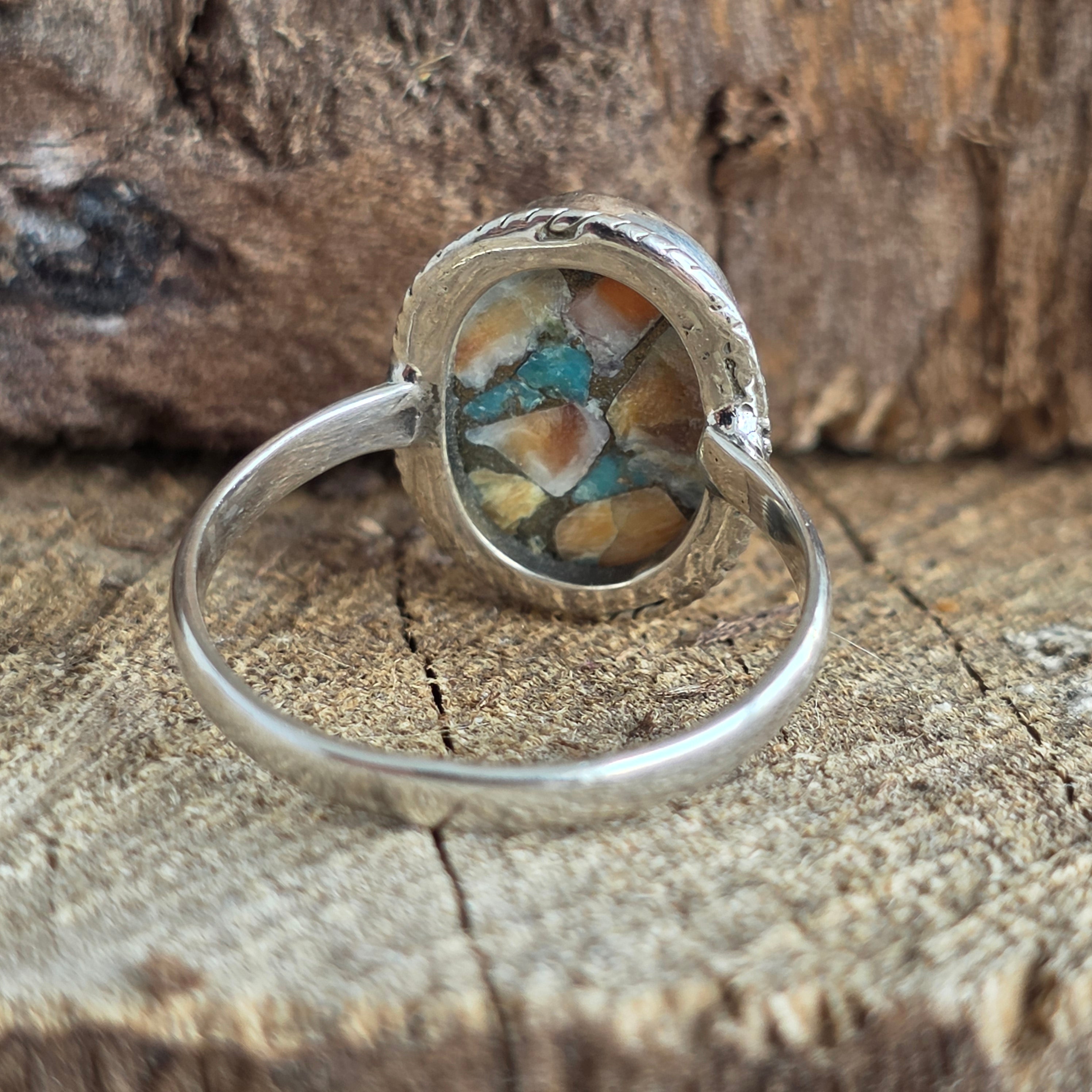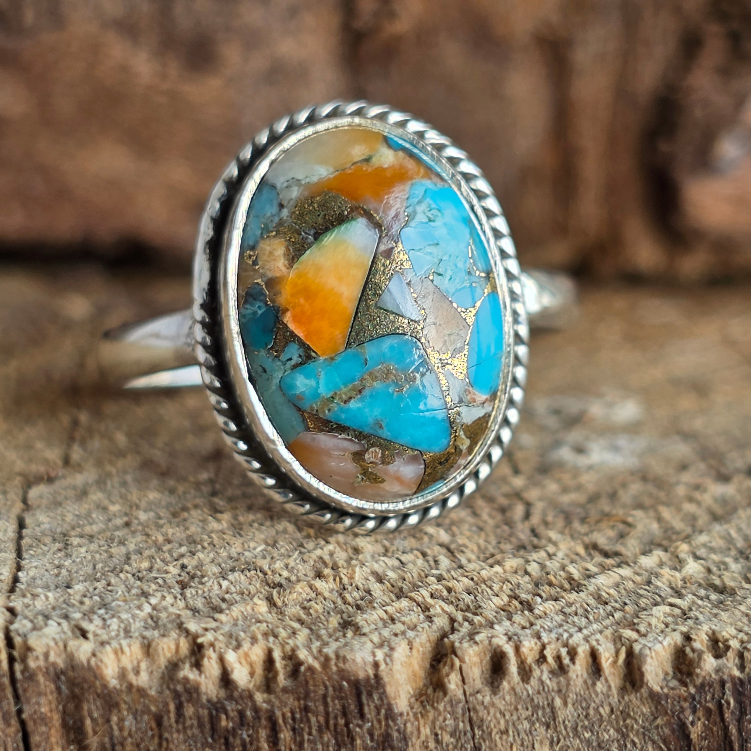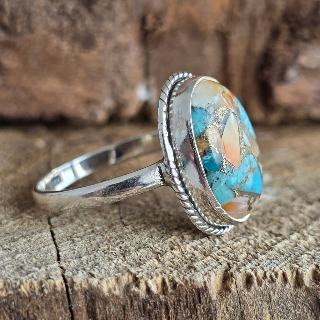Acest inel din argint 925 aduce în prim-plan o piatră fascinantă – Oyster Copper Turquoise, o combinație naturală de turcoaz, scoică și inserții fine de cupru, ce creează un mozaic viu de culori: albastru cer, portocaliu coral, alb sidefat și reflexe metalice aurii.