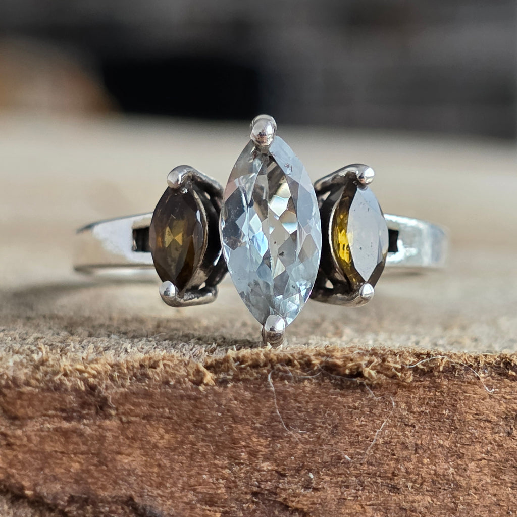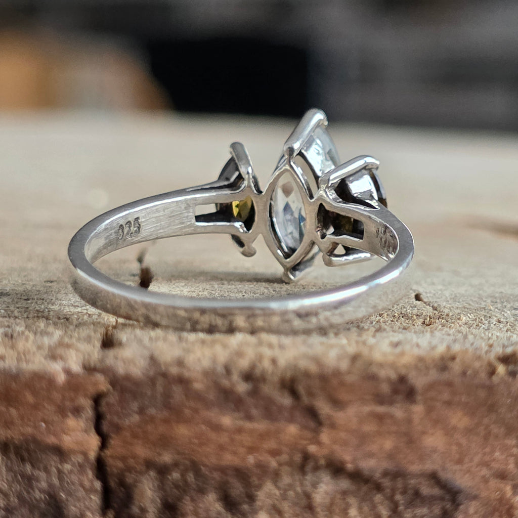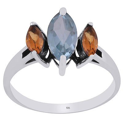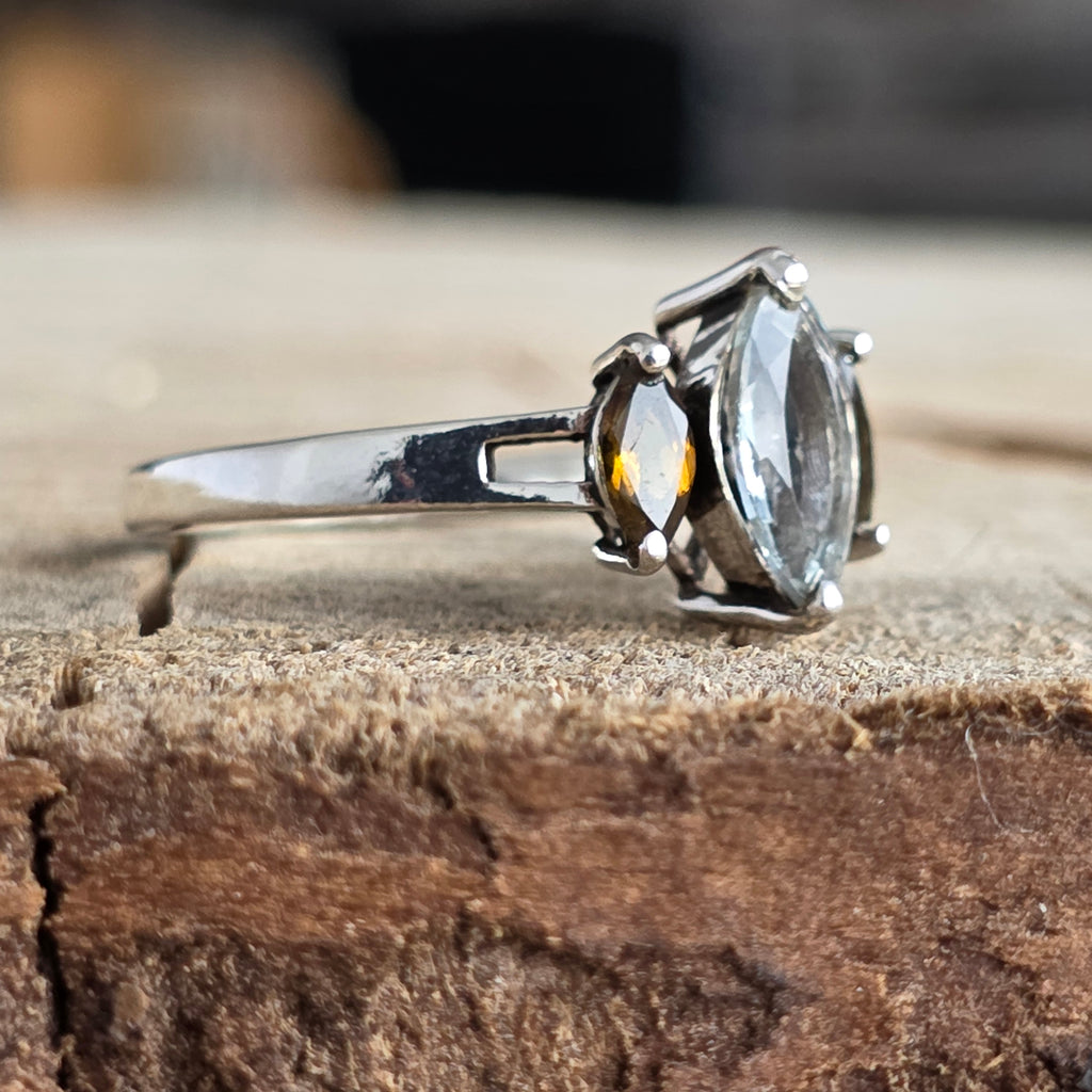 • Pietre: Topaz natural și cuart natural, tăietură marquise (navetă)