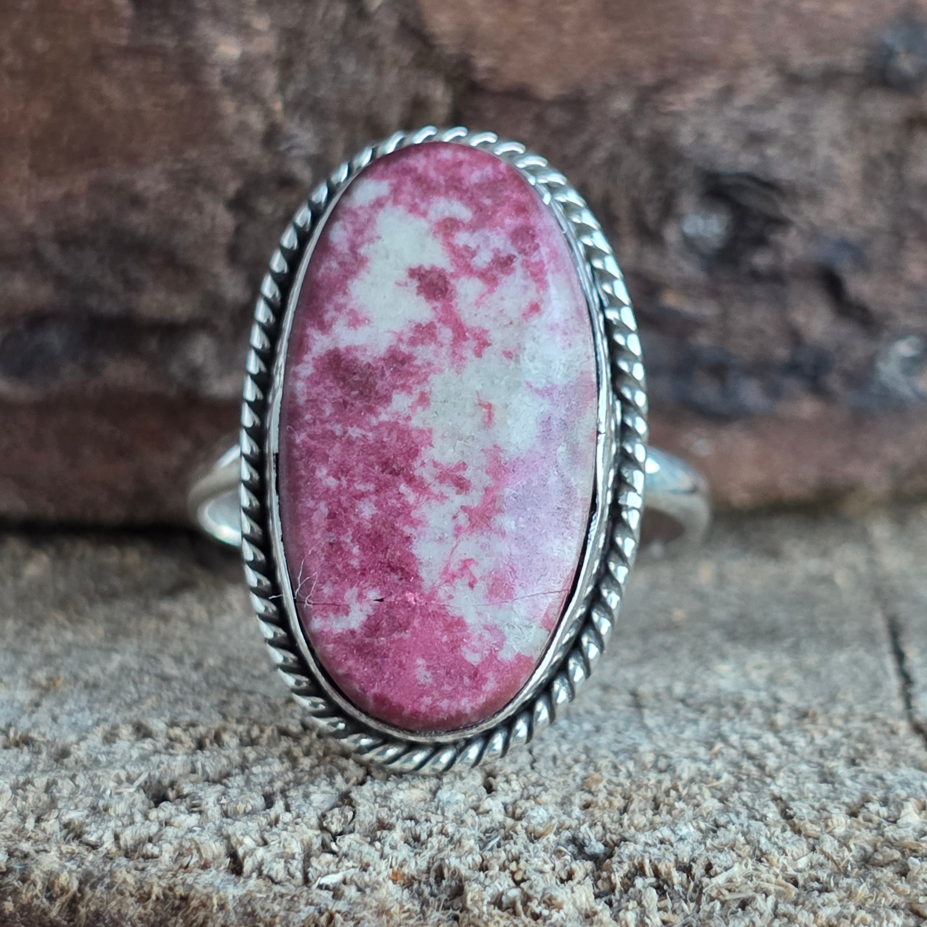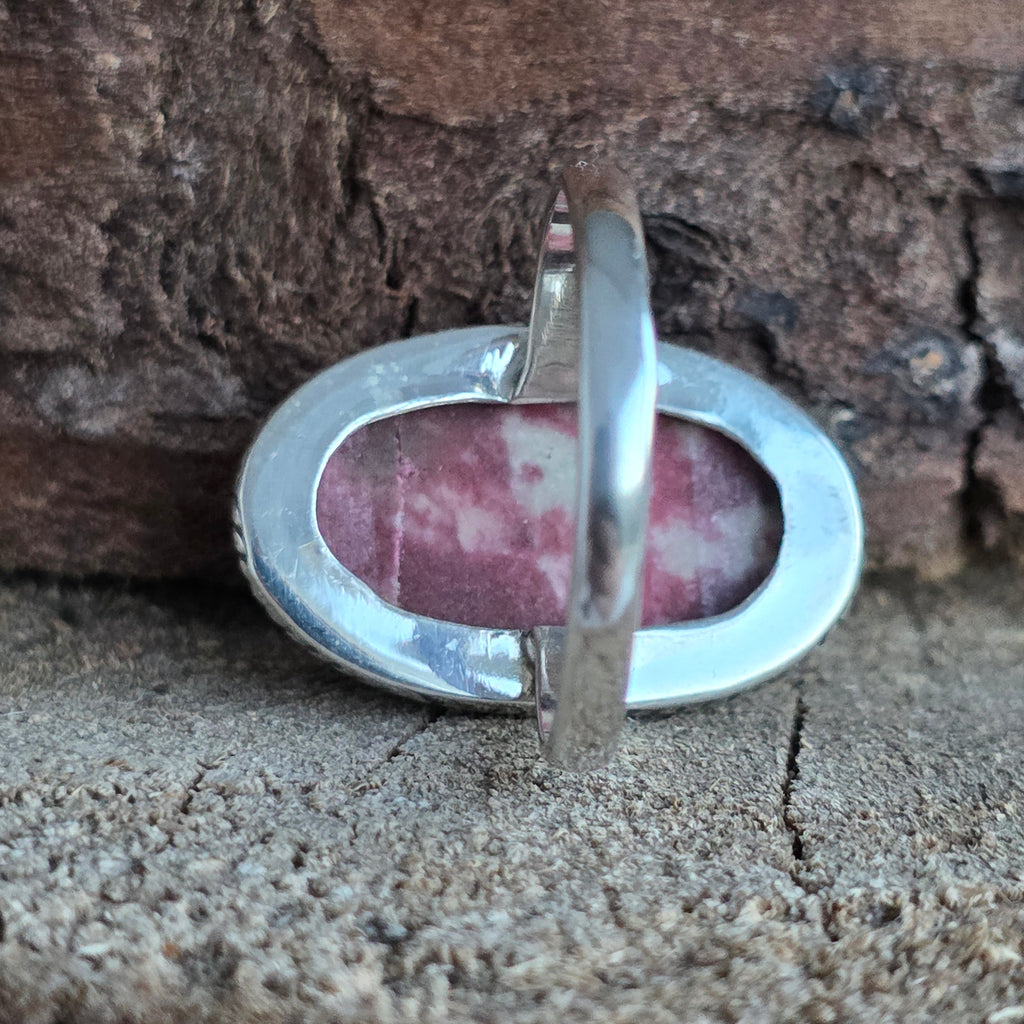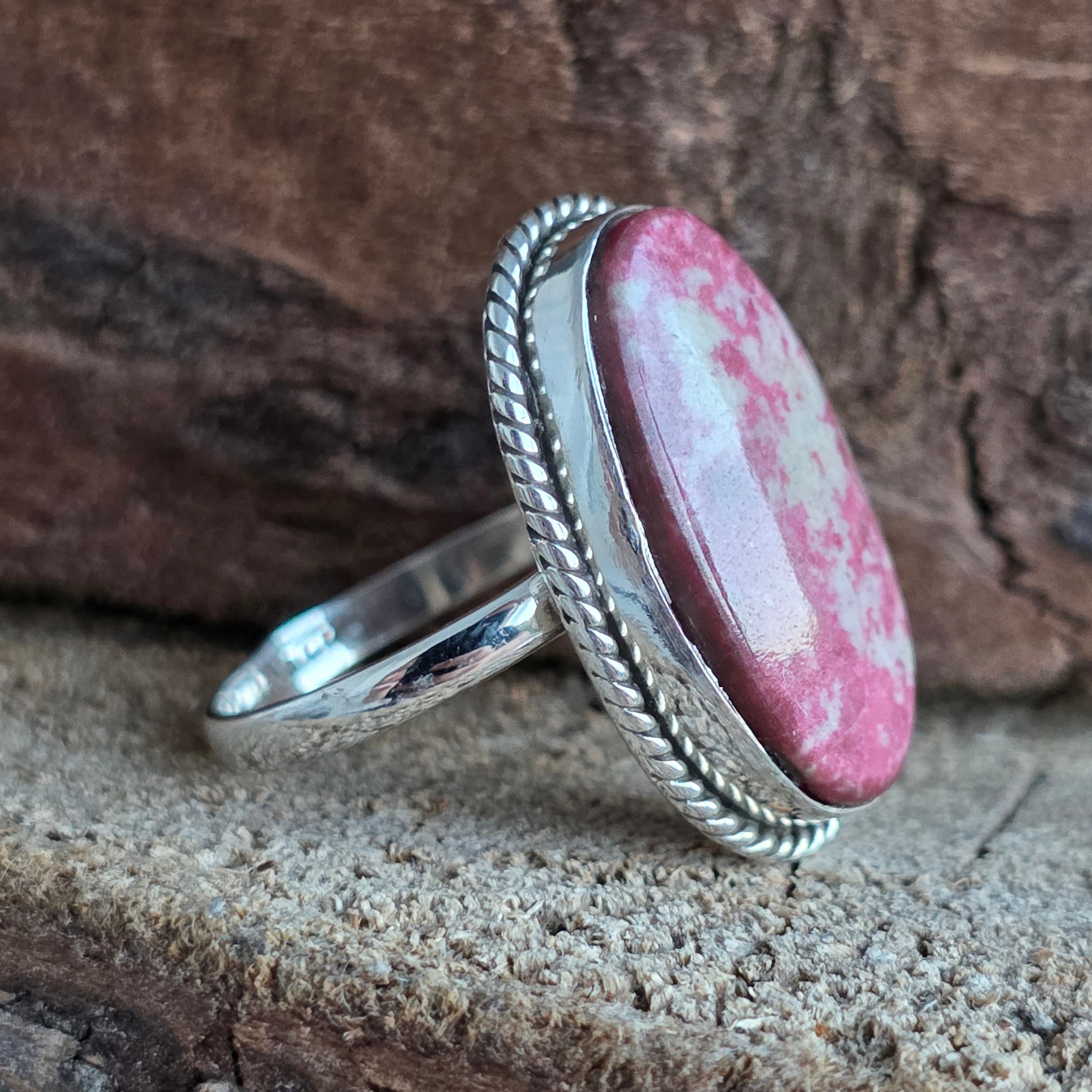 Un inel din argint 925 ce poartă în sine energia pământului nordic – Tulitul, o varietate roz de zoisit, cu textură naturală și variații fine de culoare între roz somon, fucsia și alb calcaros.