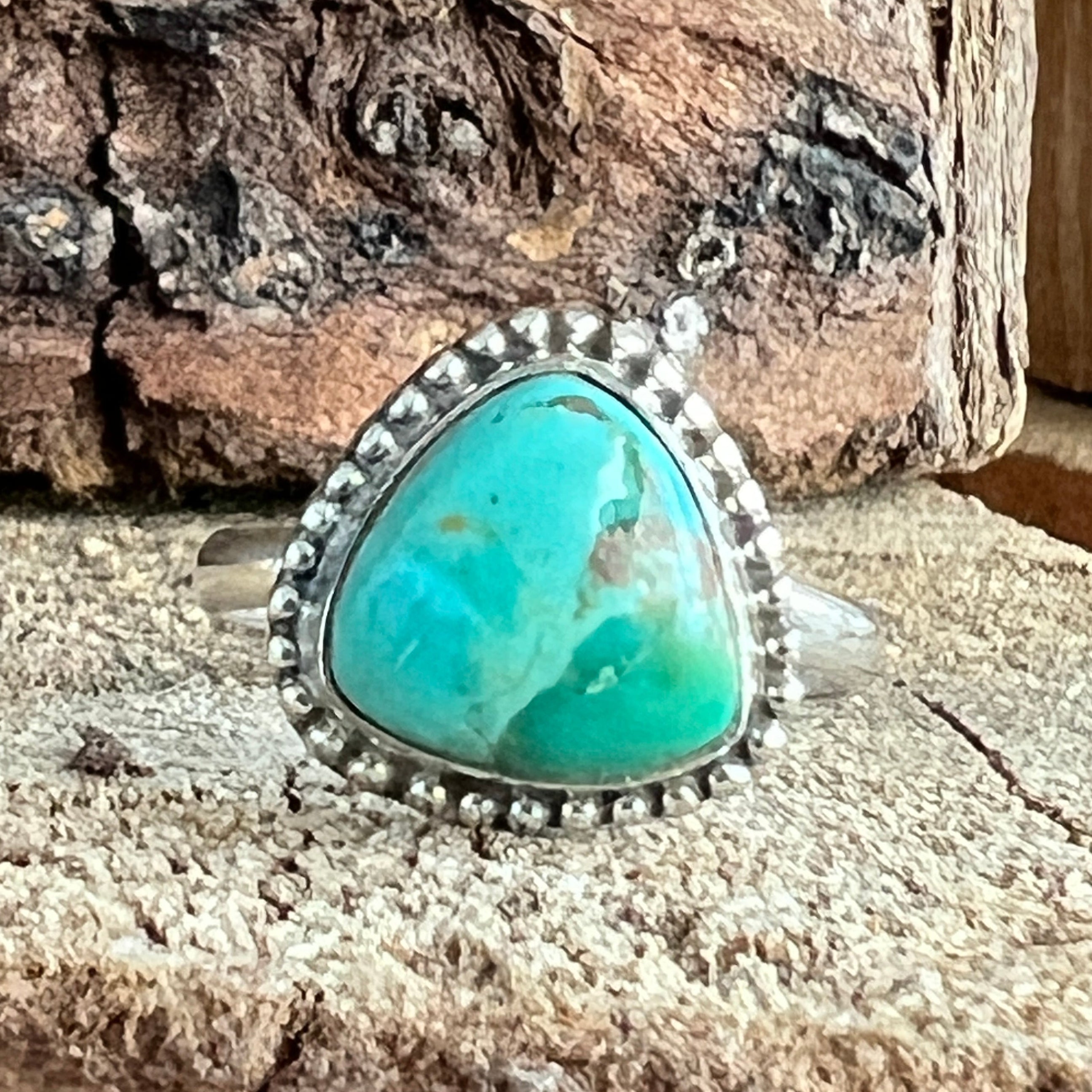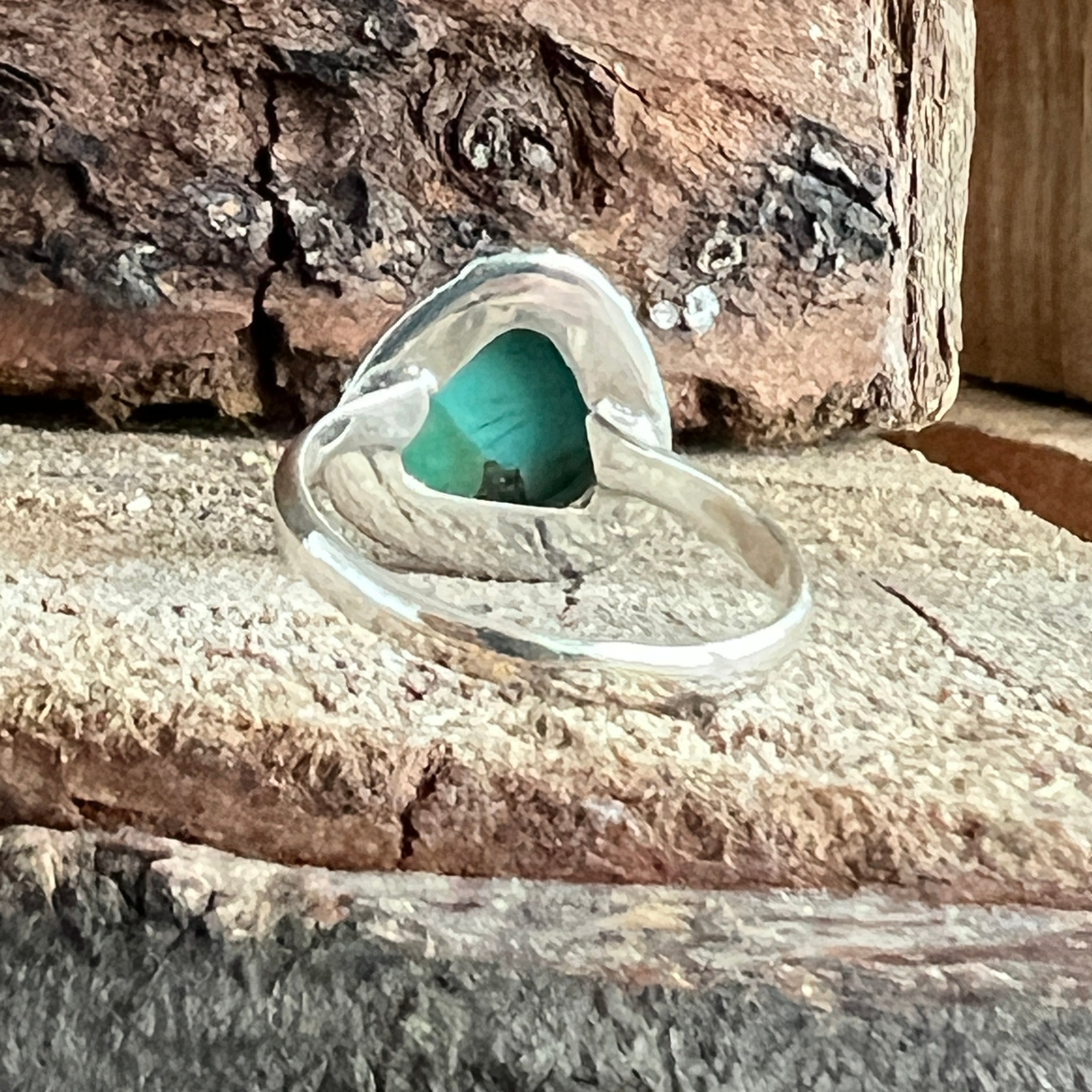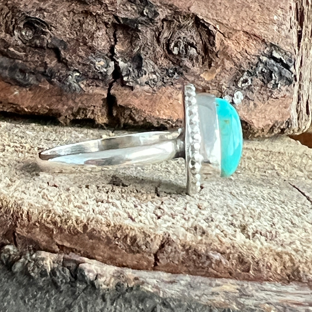 Un inel elegant din argint 925, cu o piatră naturală de turcoaz cu nuanțe variind între albastru cer și verde acvatic, străbătută de vene fine maronii și gri. Designul minimalist tip plain collet lasă întreaga atenție pietrei, punând în valoare frumusețea ei organică și textura autentică.