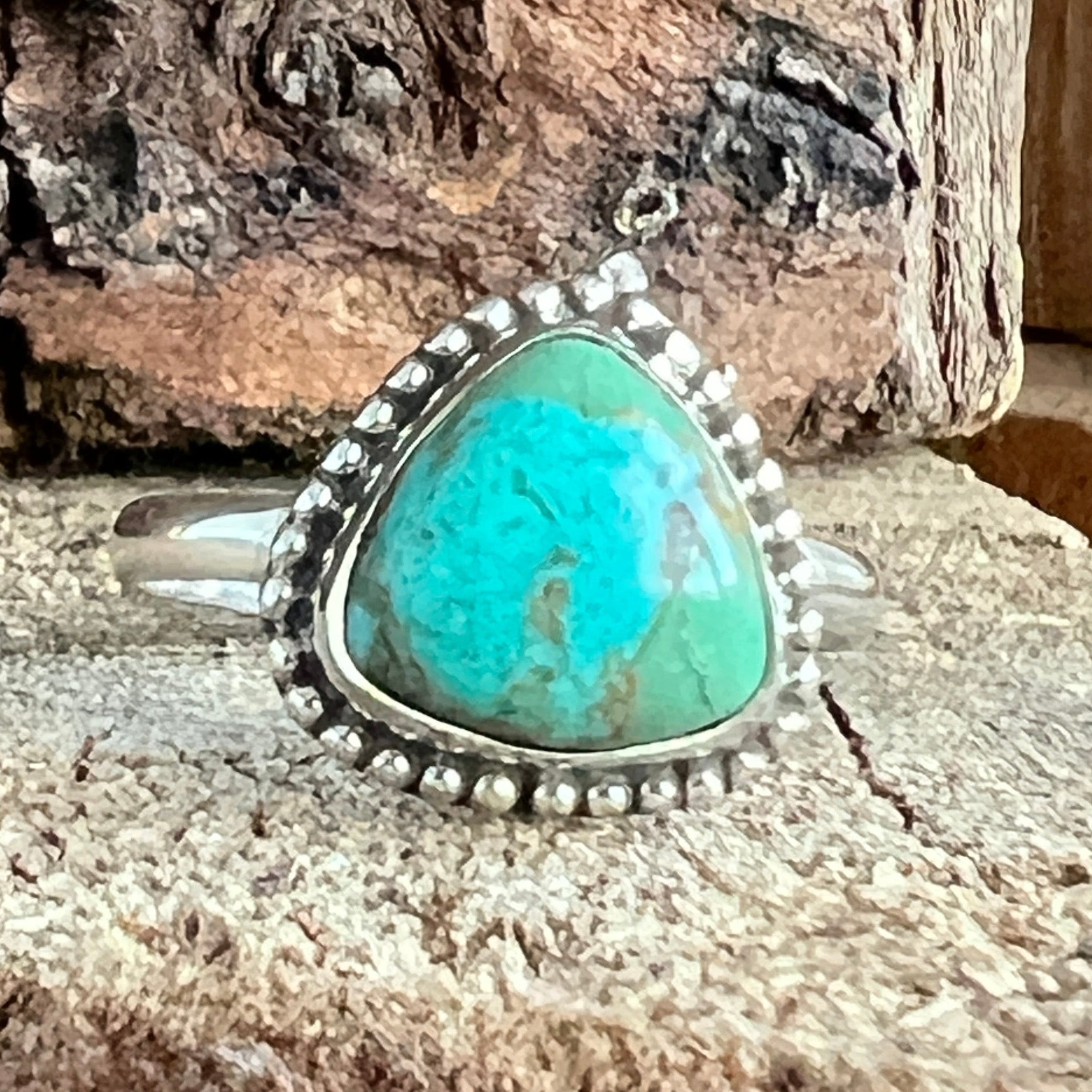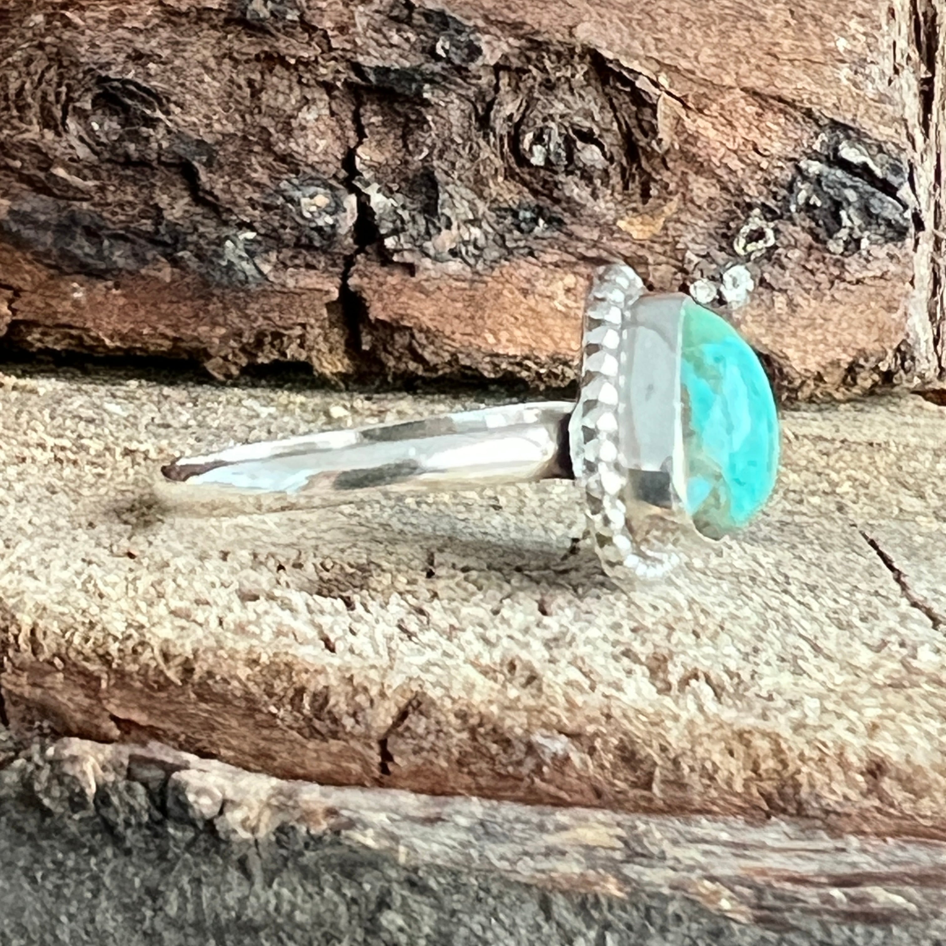 Un inel elegant din argint 925, cu o piatră naturală de turcoaz cu nuanțe variind între albastru cer și verde acvatic, străbătută de vene fine maronii și gri. Designul minimalist tip plain collet lasă întreaga atenție pietrei, punând în valoare frumusețea ei organică și textura autentică.