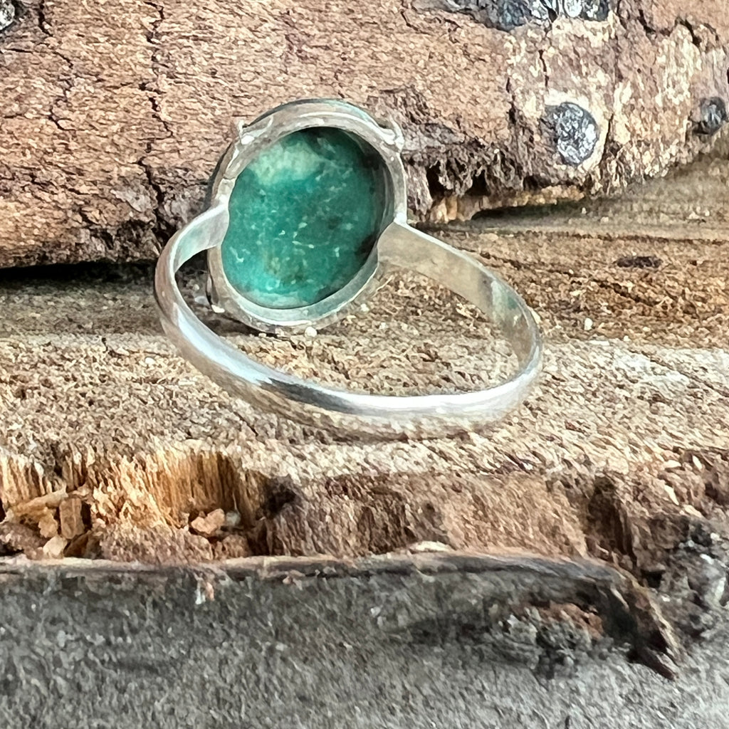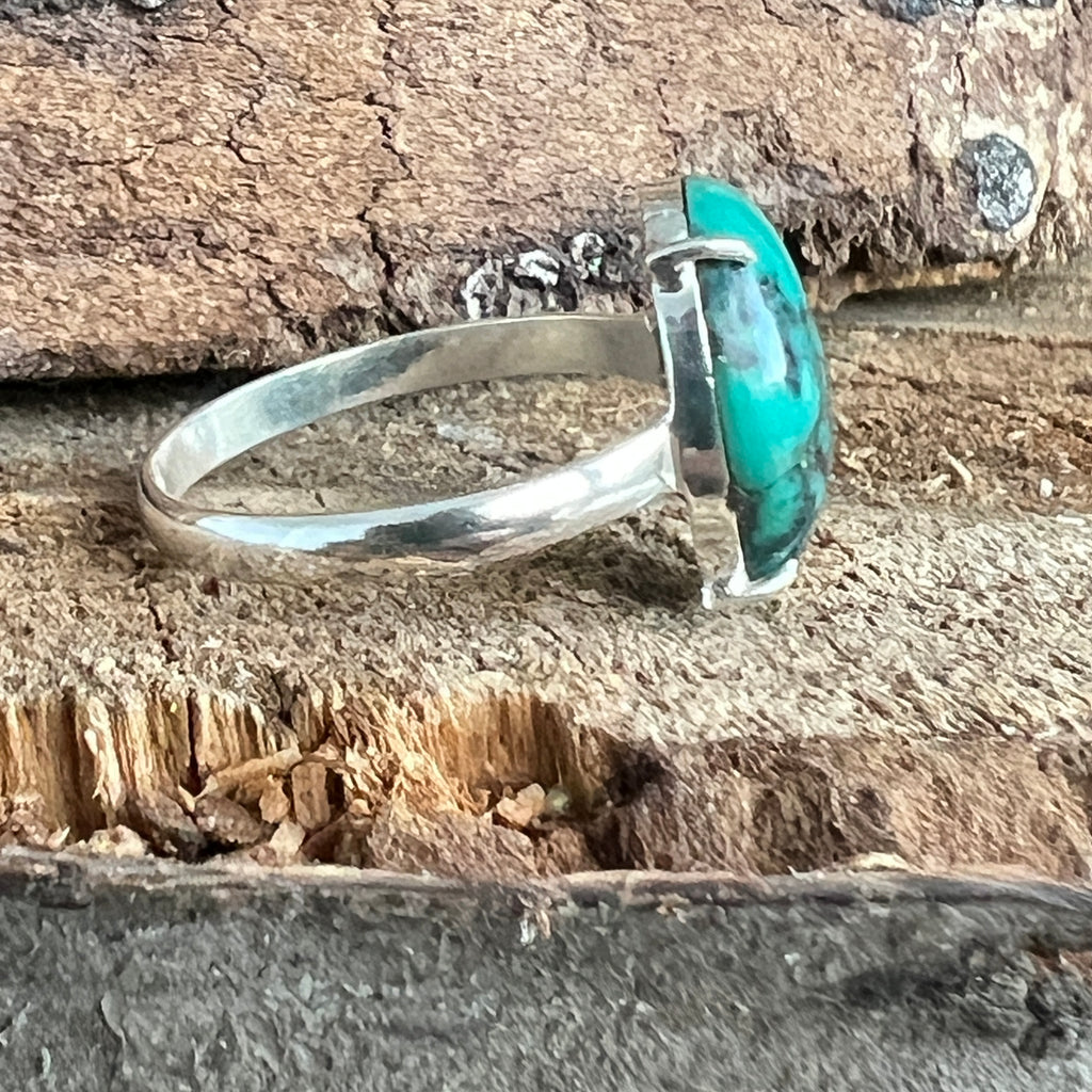 Un inel elegant din argint 925, cu o piatră naturală de turcoaz cu nuanțe variind între albastru cer și verde acvatic, străbătută de vene fine maronii și gri. Designul minimalist tip plain collet lasă întreaga atenție pietrei, punând în valoare frumusețea ei organică și textura autentică.