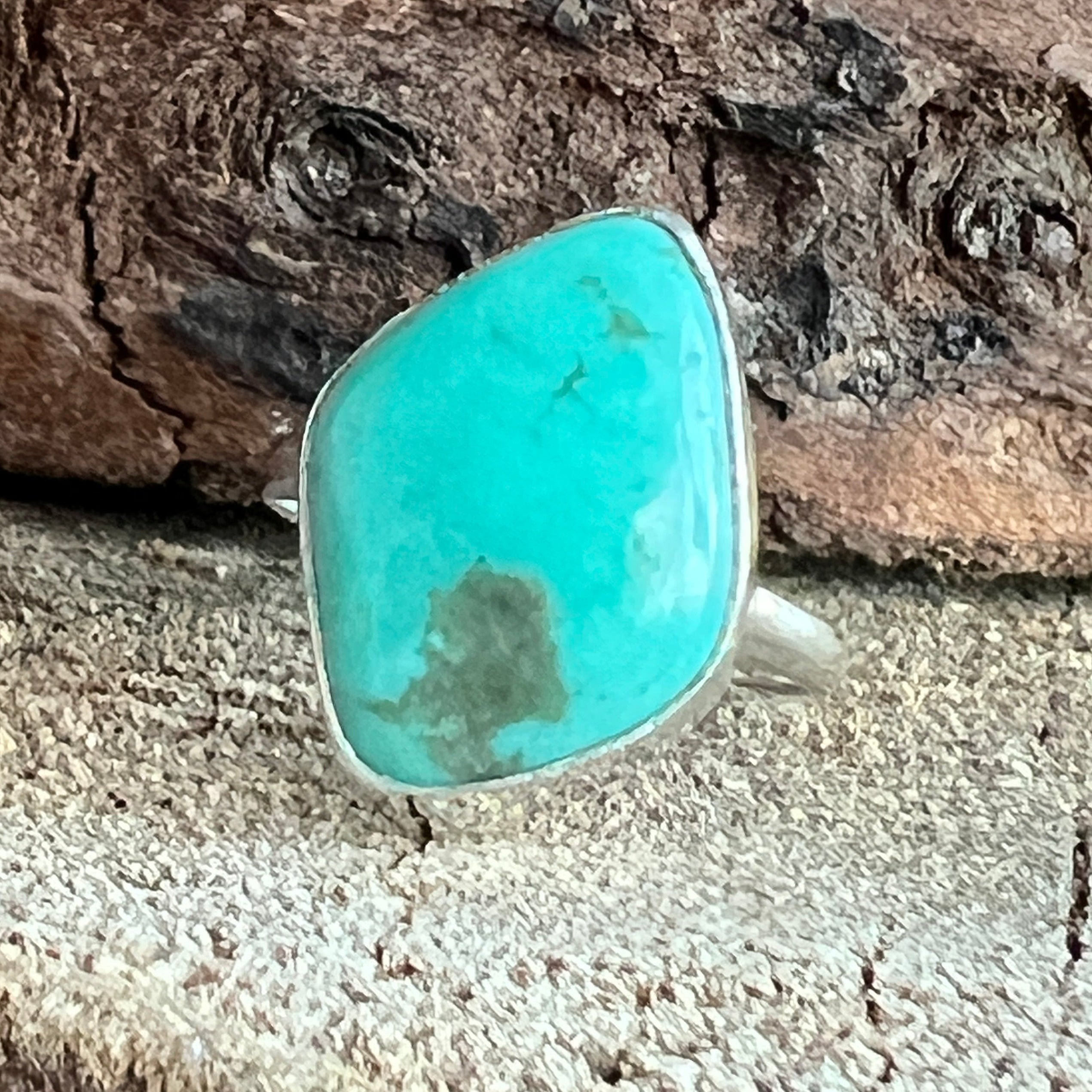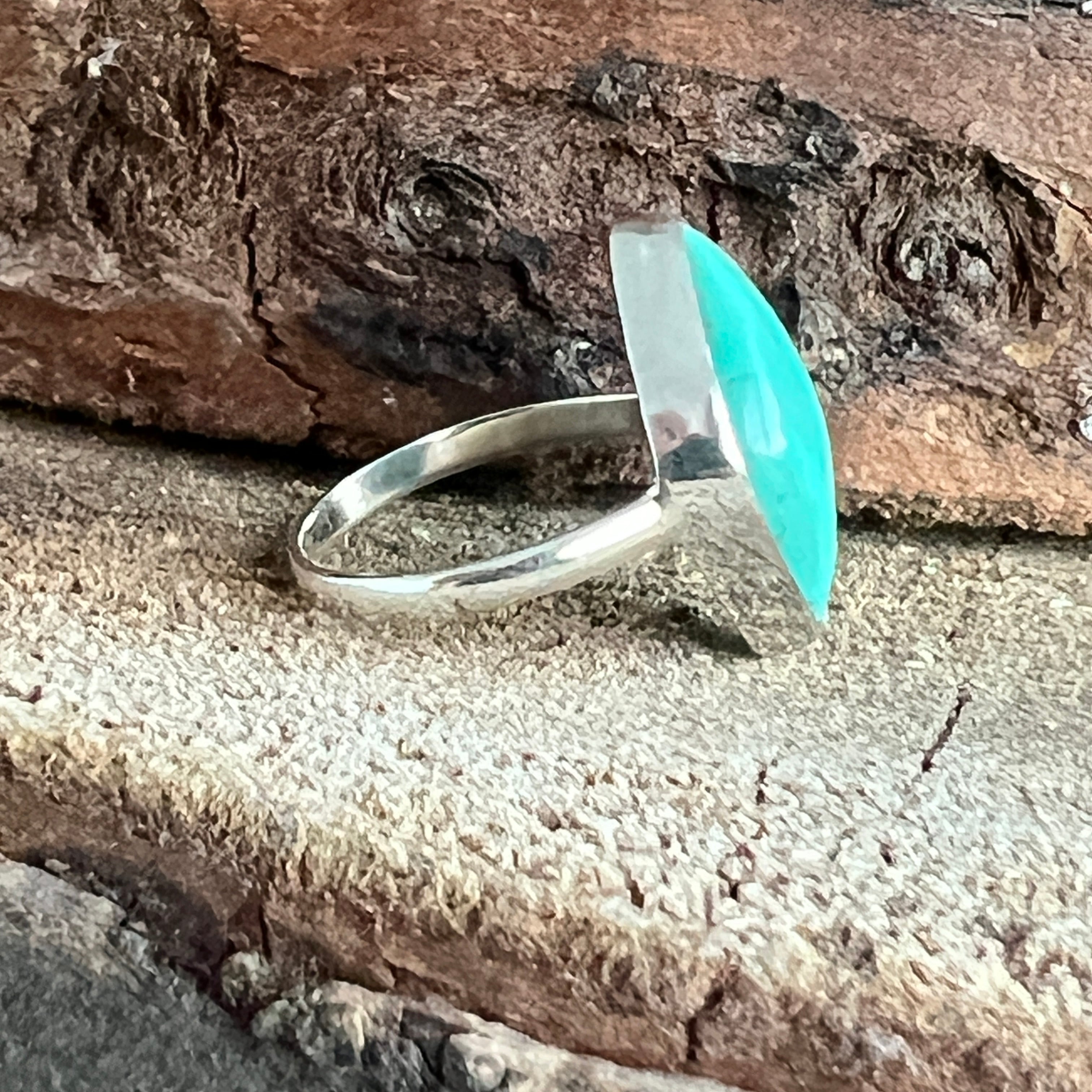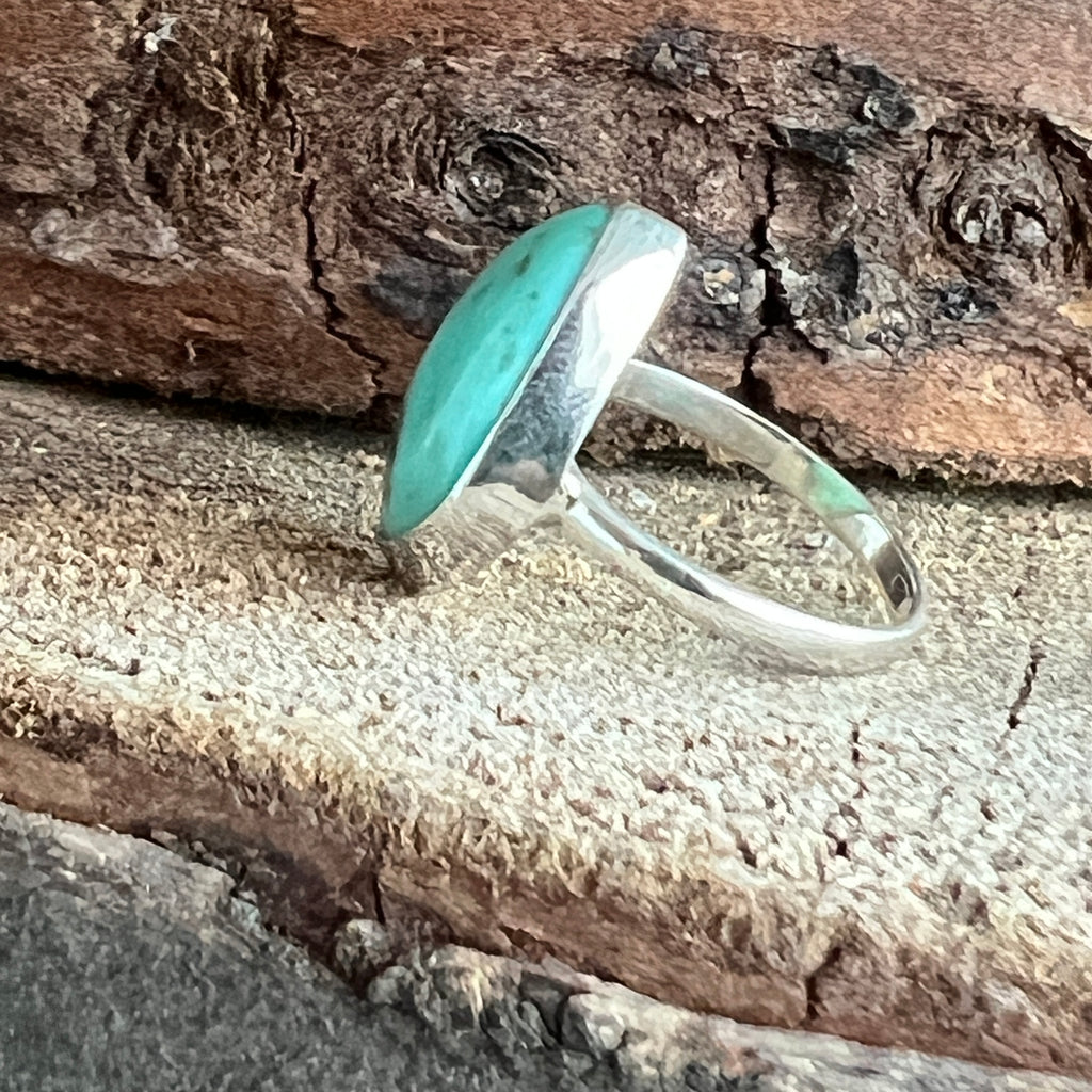 Un inel elegant din argint 925, cu o piatră naturală de turcoaz cu nuanțe variind între albastru cer și verde acvatic, străbătută de vene fine maronii și gri. Designul minimalist tip plain collet lasă întreaga atenție pietrei, punând în valoare frumusețea ei organică și textura autentică.