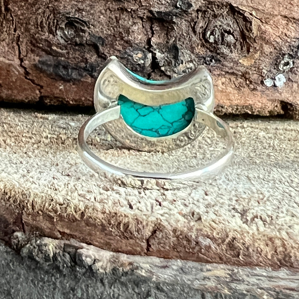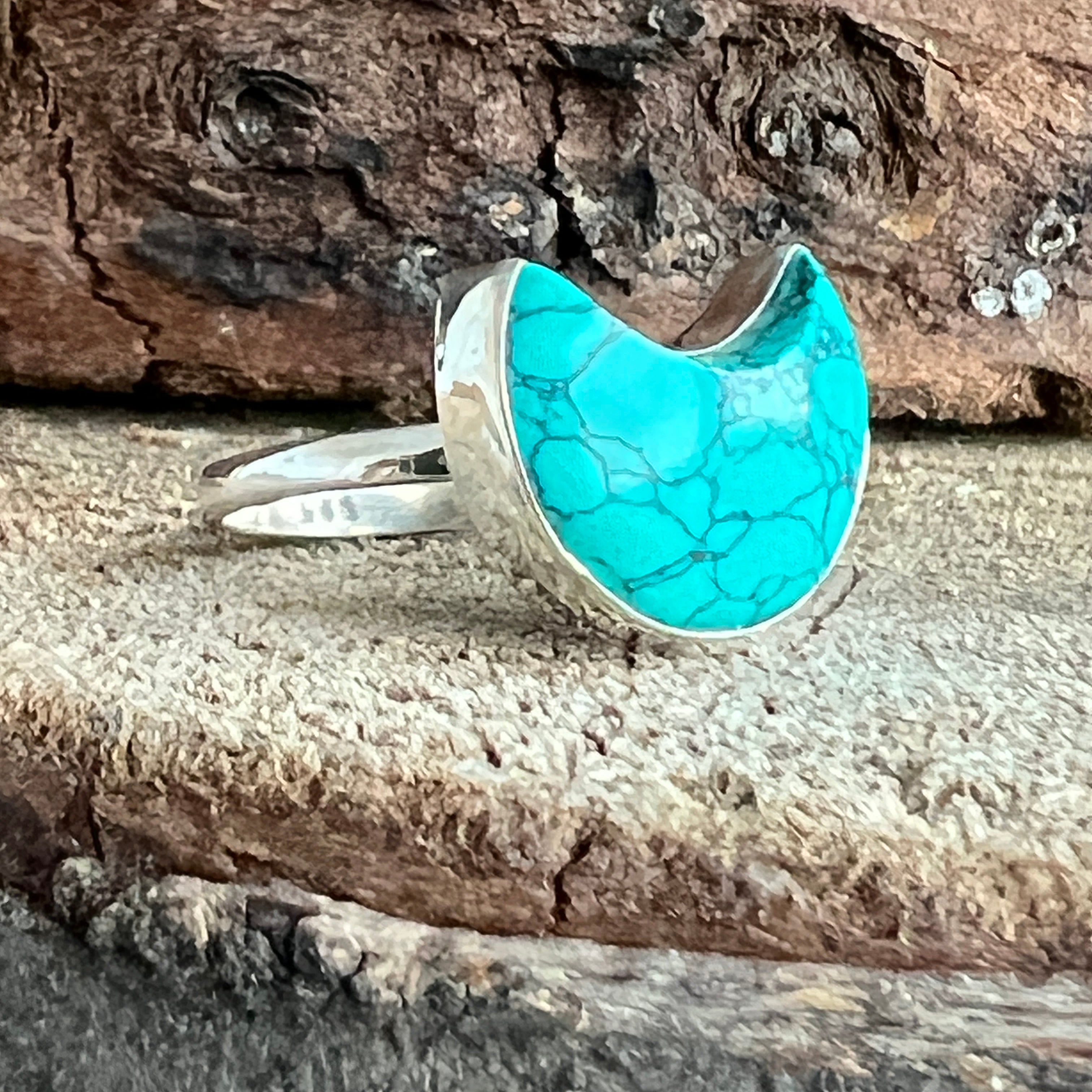 Un inel elegant din argint 925, cu o piatră naturală de turcoaz cu nuanțe variind între albastru cer și verde acvatic, străbătută de vene fine maronii și gri. Designul minimalist tip plain collet lasă întreaga atenție pietrei, punând în valoare frumusețea ei organică și textura autentică.