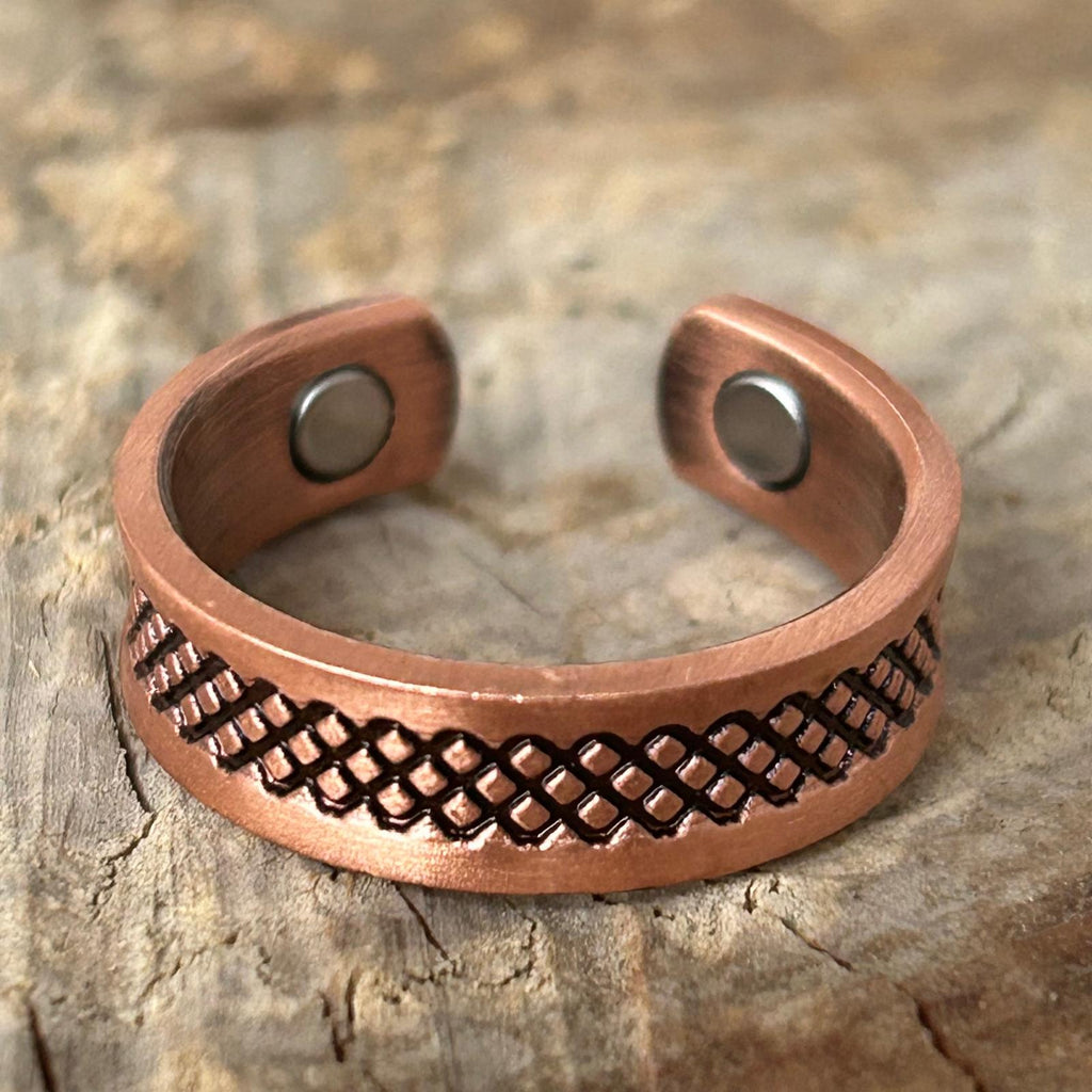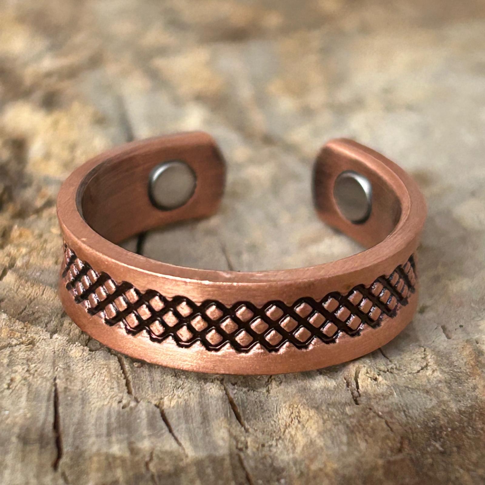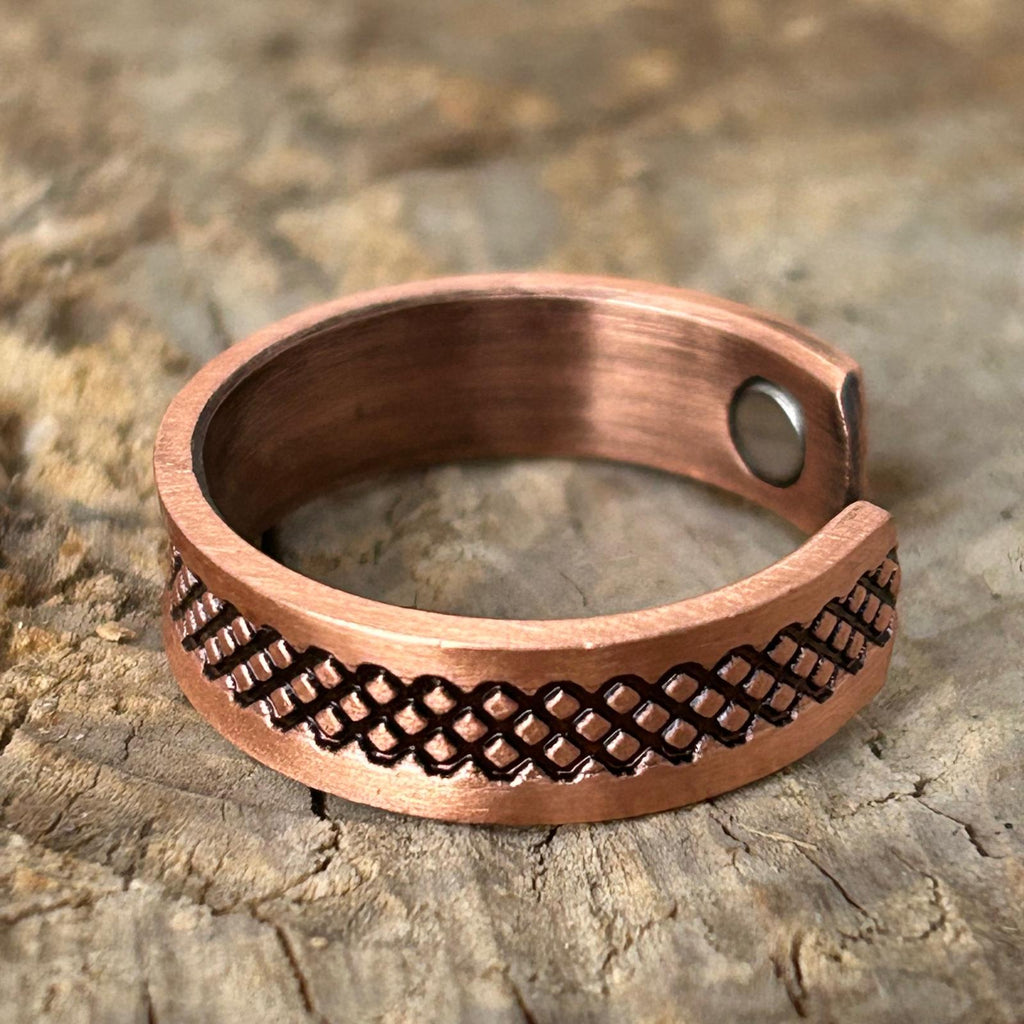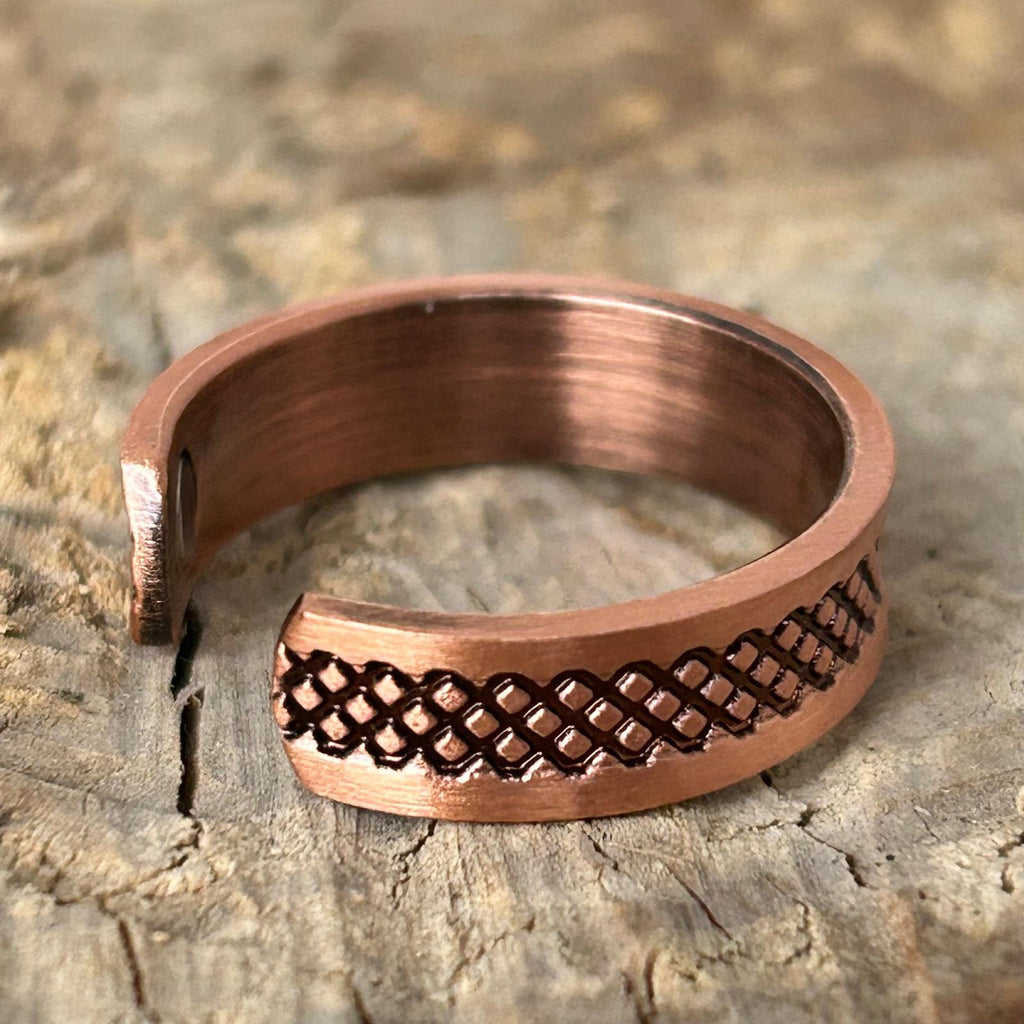 Cuprul, purtat din vechime ca metal protector și vindecător, este considerat un catalizator al energiei vitale și al echilibrului interior. În combinație cu forma ajustabilă, inelul devine nu doar o bijuterie, ci și un simbol al adaptabilității și al curgerii armonioase prin viață.