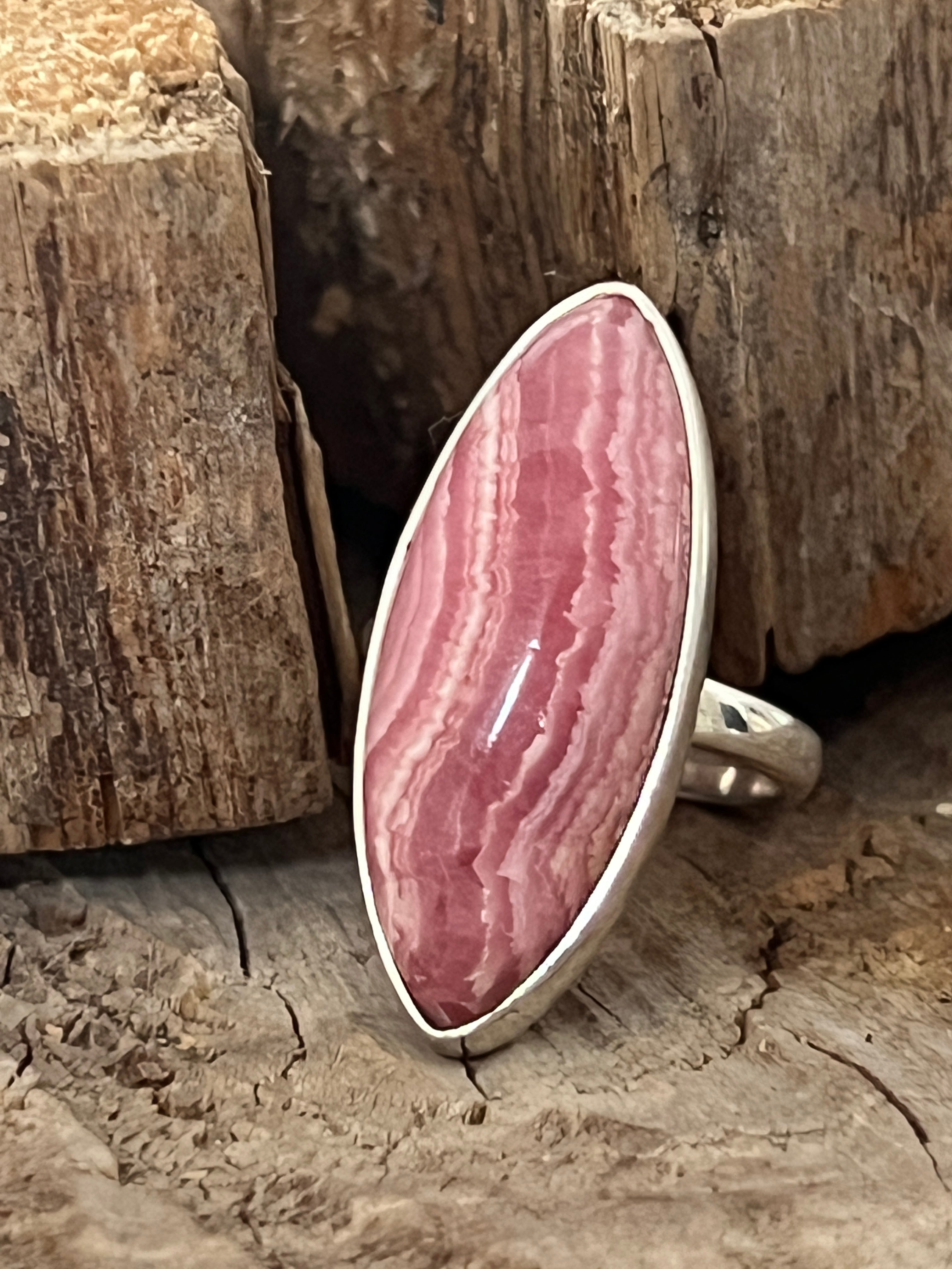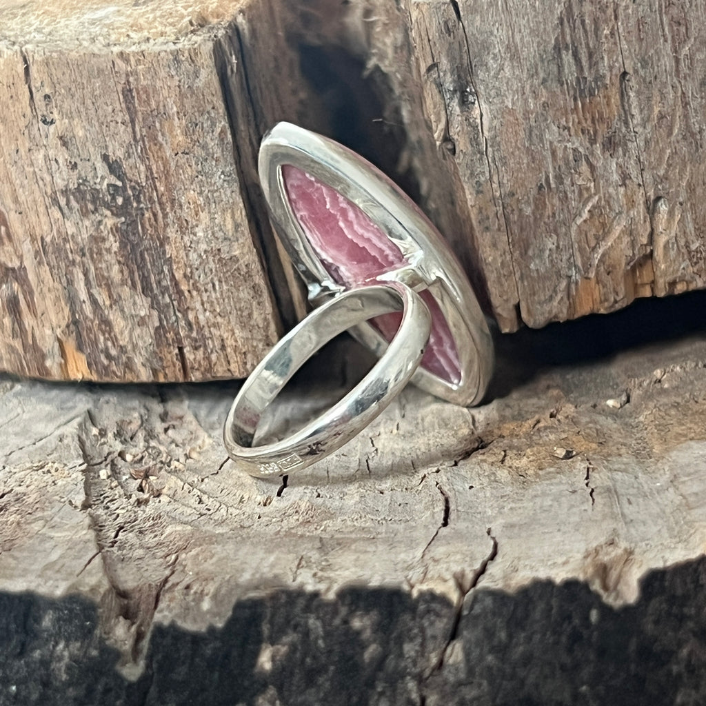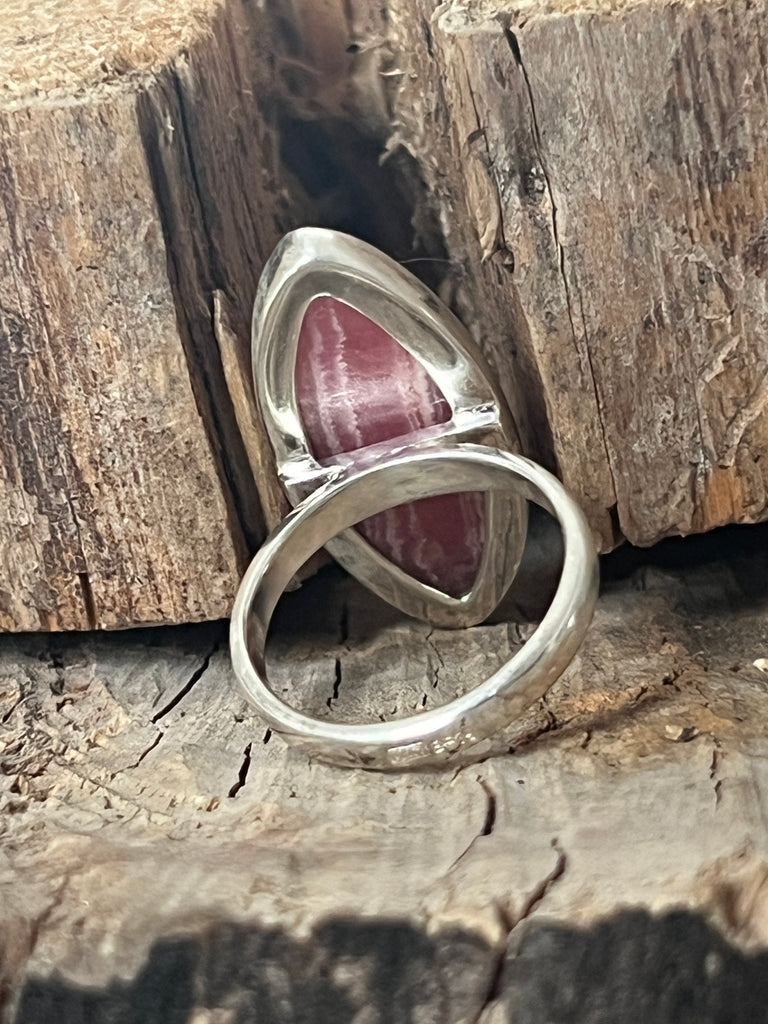 Acest inel cu rodocrozit natural montat în argint 925 este o piesă deosebită, care îmbină frumusețea pietrei cu eleganța clasică a argintului. Fiecare inel este unic, datorită striațiilor roz-coral specifice rodocrozitului, ceea ce îl face o adevărată bijuterie de colecție.