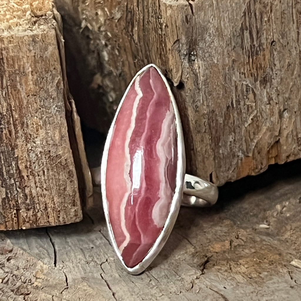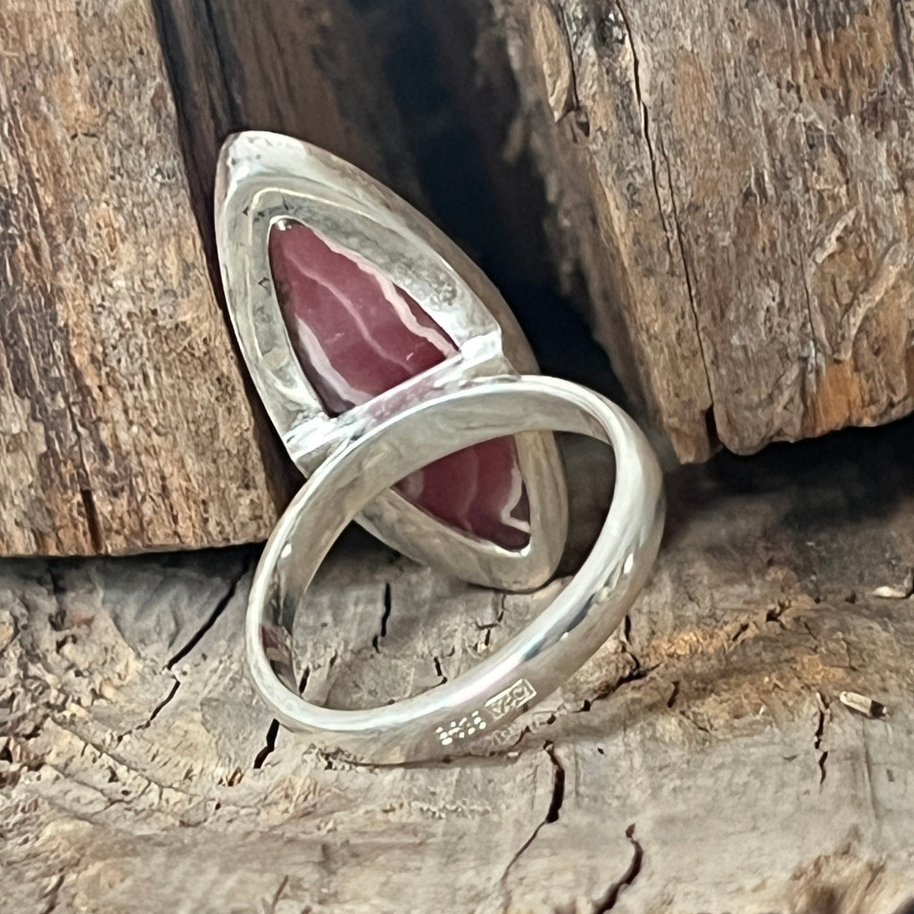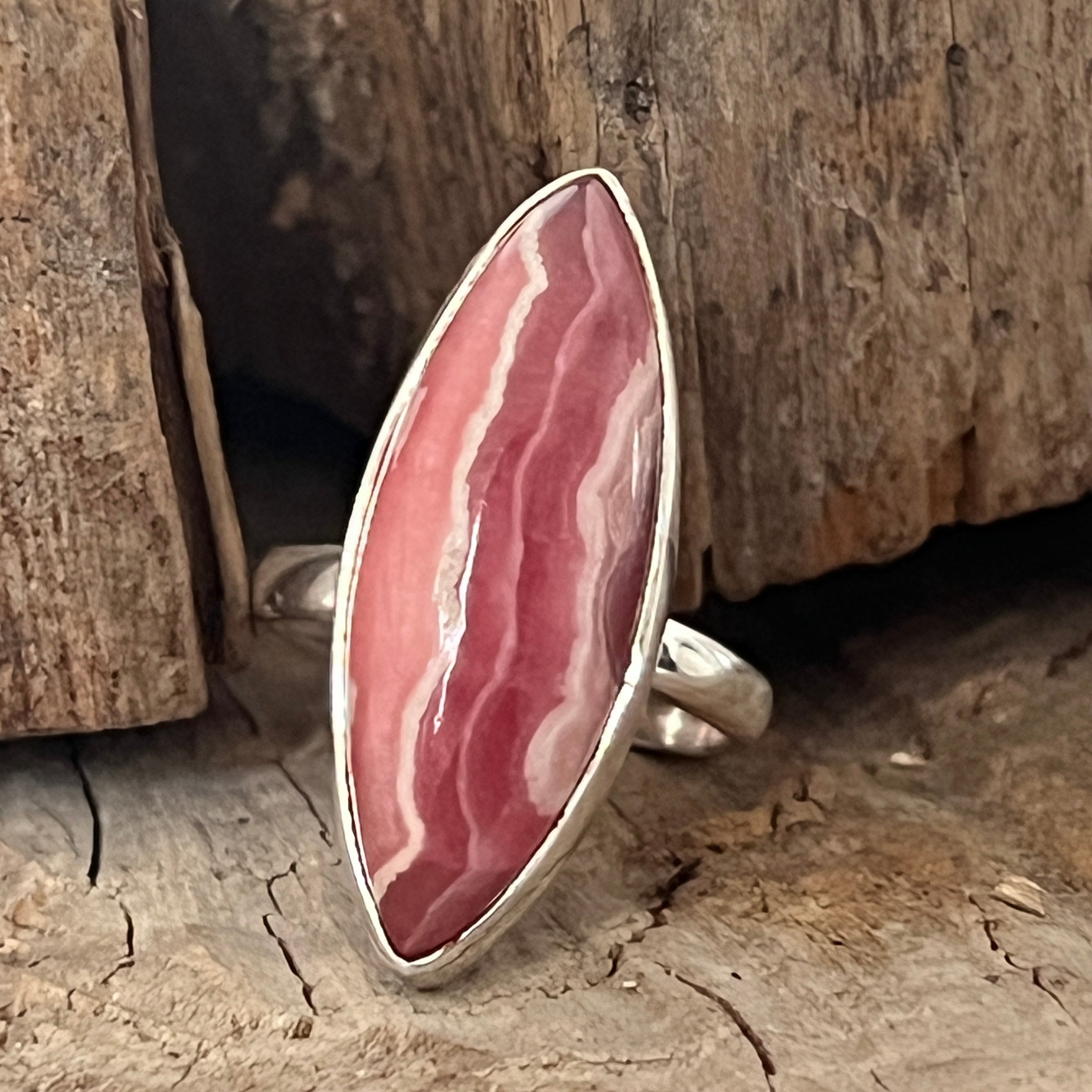 Acest inel cu rodocrozit natural montat în argint 925 este o piesă deosebită, care îmbină frumusețea pietrei cu eleganța clasică a argintului. Fiecare inel este unic, datorită striațiilor roz-coral specifice rodocrozitului, ceea ce îl face o adevărată bijuterie de colecție.