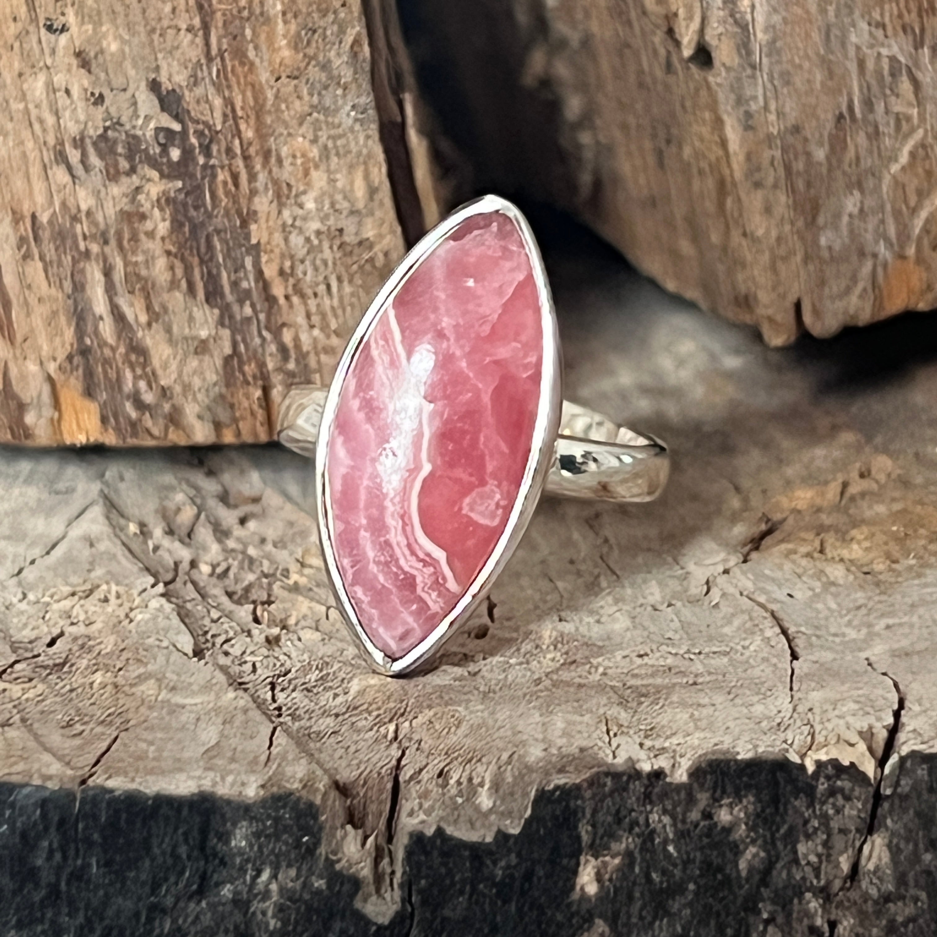 Acest inel cu rodocrozit natural montat în argint 925 este o piesă deosebită, care îmbină frumusețea pietrei cu eleganța clasică a argintului. Fiecare inel este unic, datorită striațiilor roz-coral specifice rodocrozitului, ceea ce îl face o adevărată bijuterie de colecție.