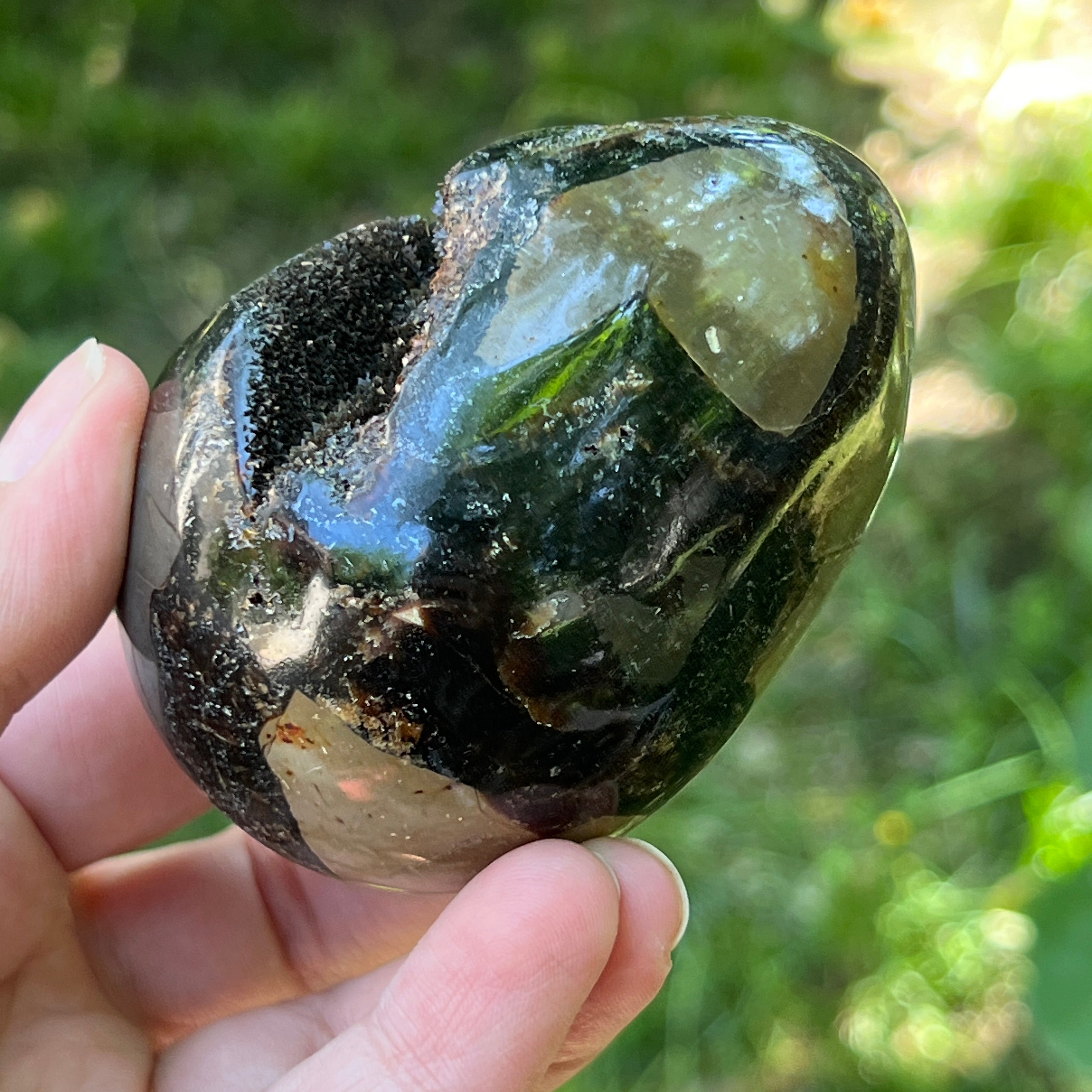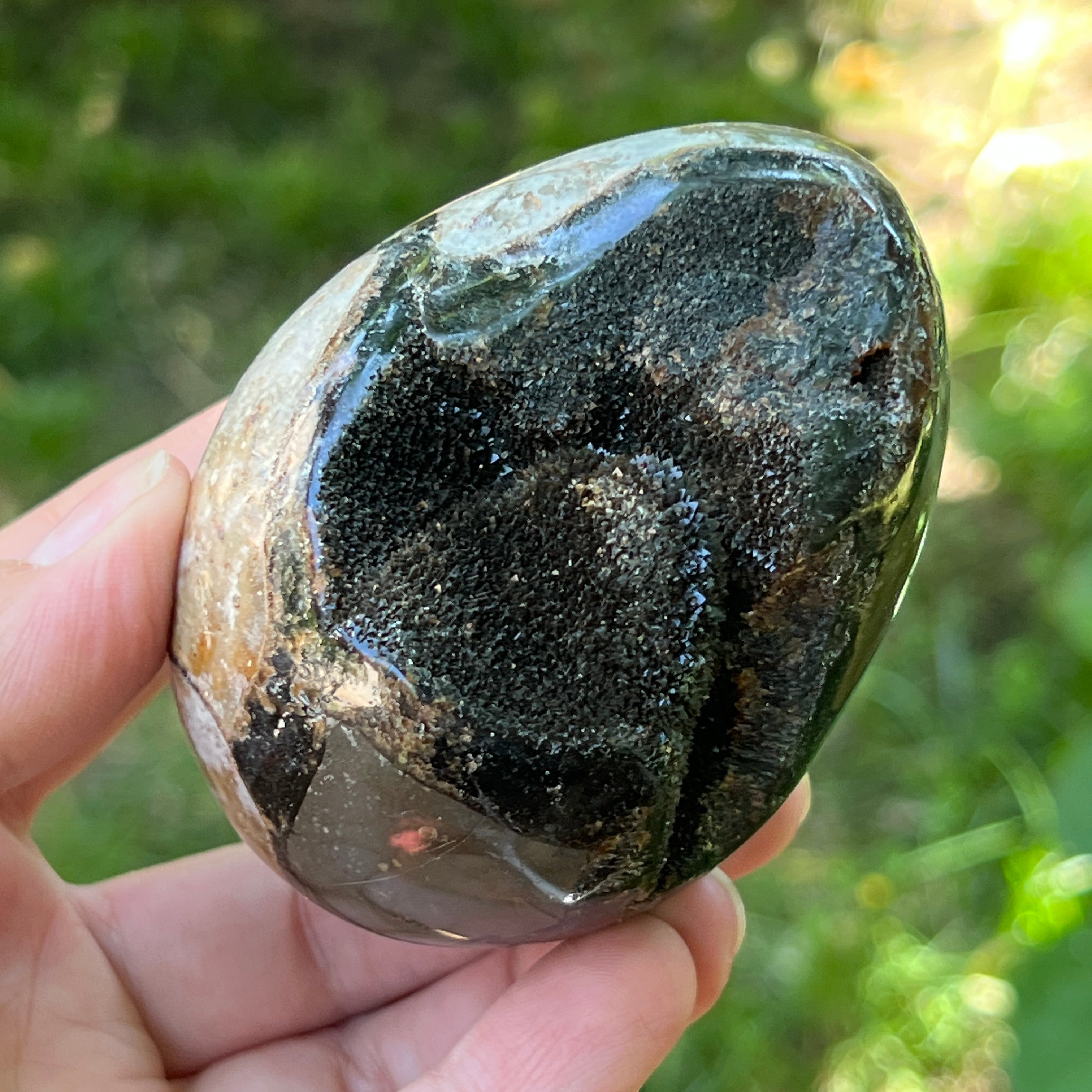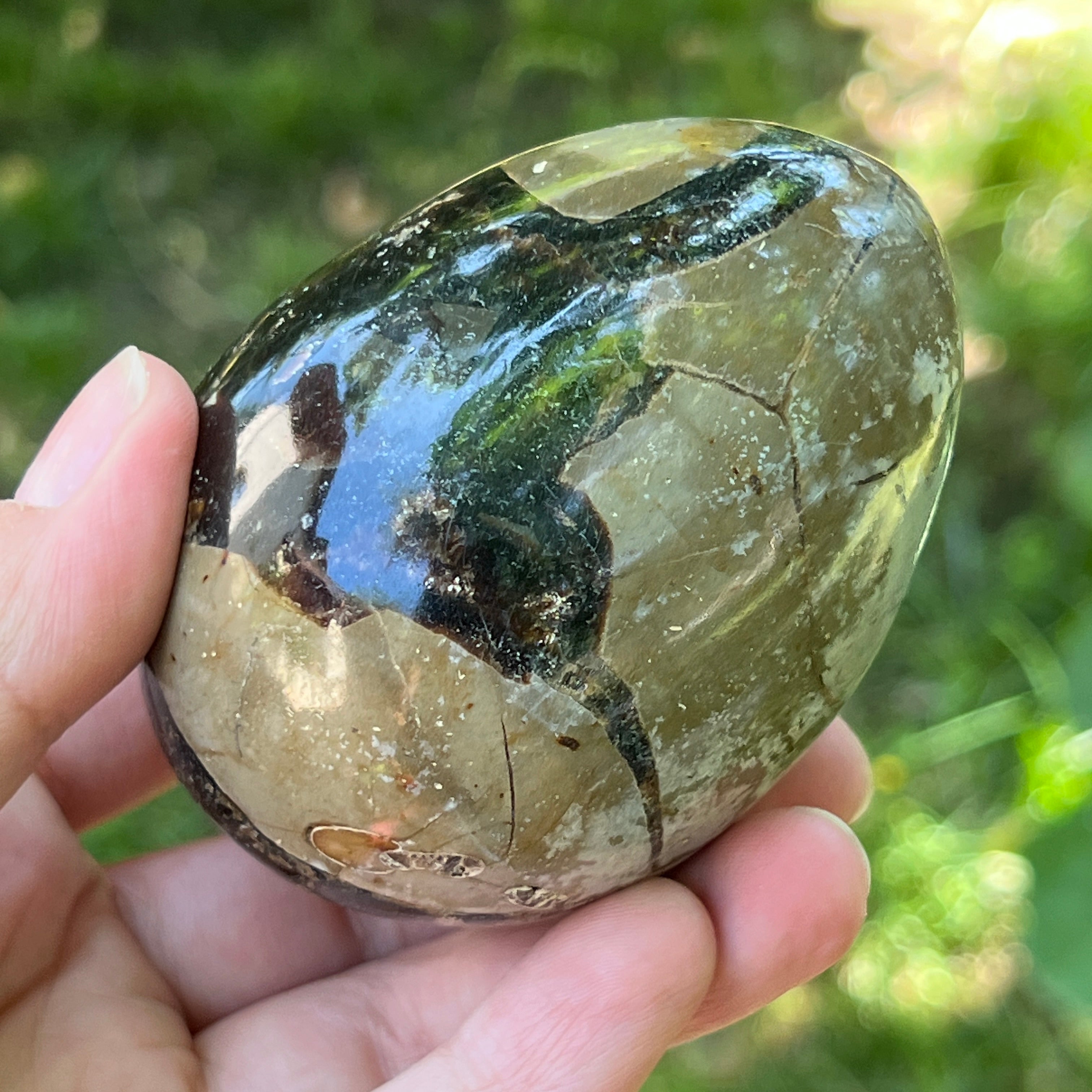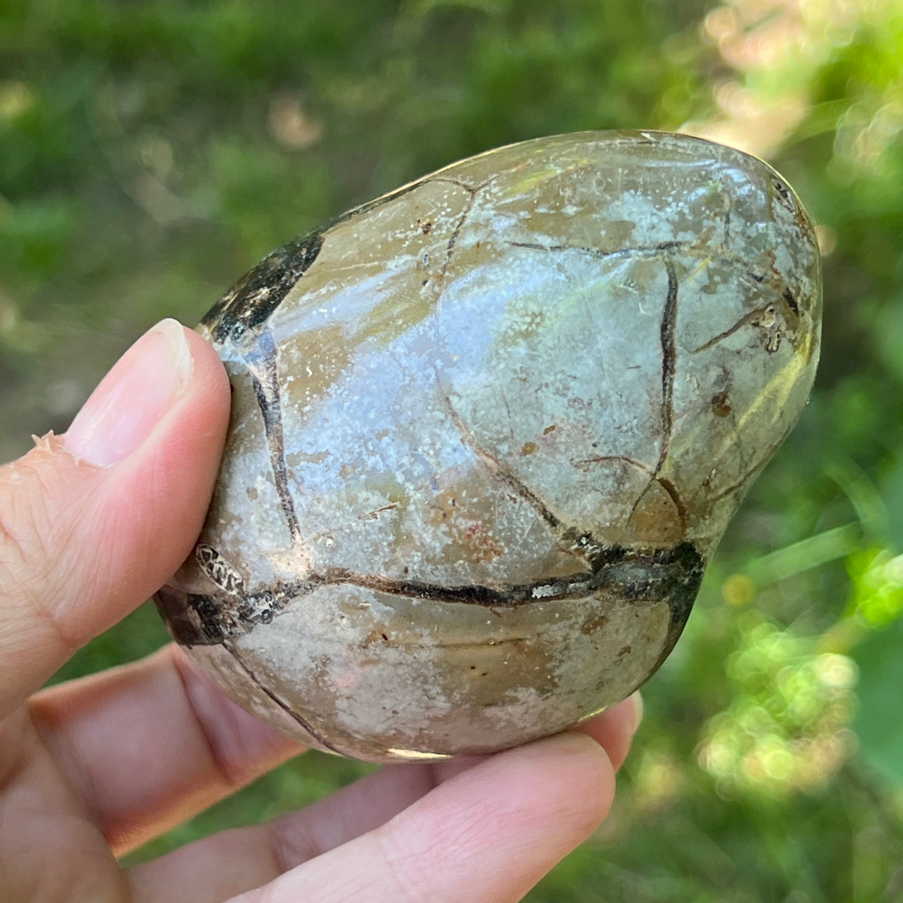 Septaria składa się z kalcytu, limonitu, gipsu i barytu, minerałów, które tworzą wyjątkową grę w tym kamieniu i nadają mu wyjątkowy wygląd.