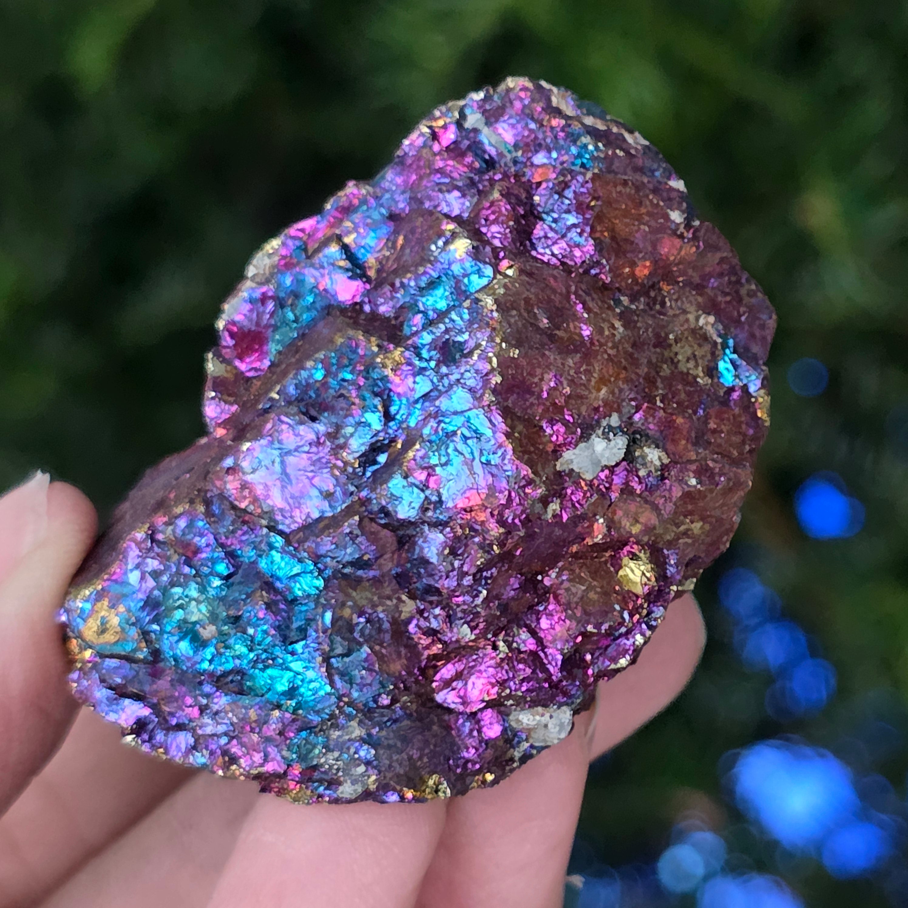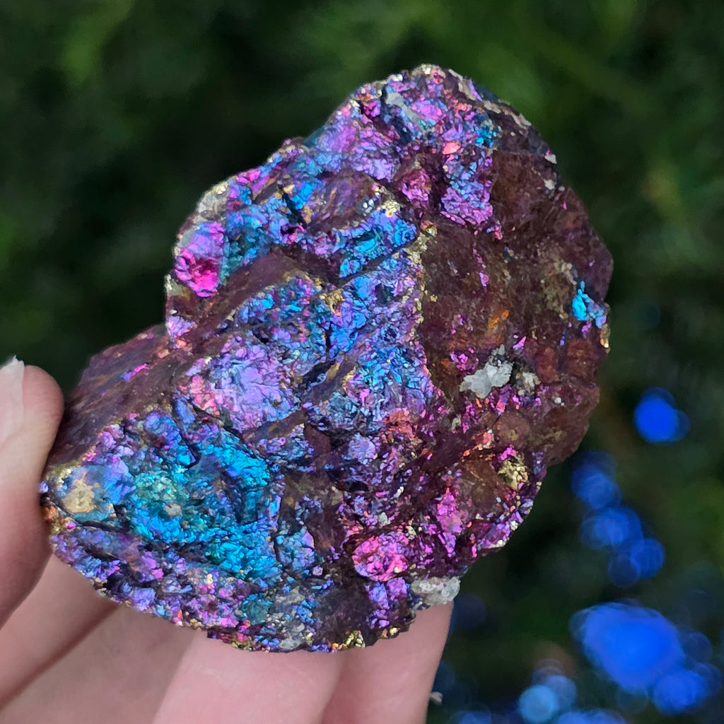 Niebieska chalkopirytowa, znana również jako chalkopiryt iryzujący, to rodzaj chalkopiryty, która wykazuje lśniące odcienie niebieskiego, fioletowego, zielonego lub innych barw iryzacyjnych. Ta iryzacja jest spowodowana cienką warstwą utleniania na powierzchni minerału, naturalnym procesem zachodzącym, gdy chalkopiryt jest przez dłuższy czas wystawiony na działanie powietrza i wilgoci.