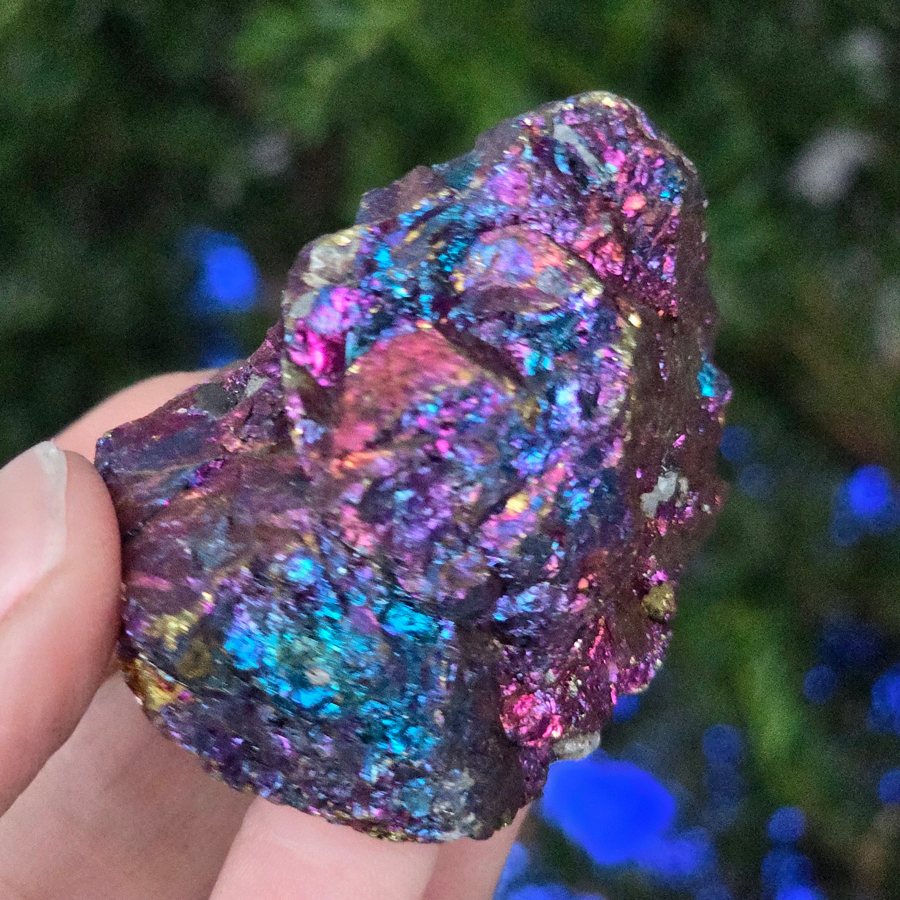 Niebieska i fioletowa chalkopirytowa są kojarzone ze wzrostem duchowym, intuicją i łączeniem się z wyższymi energiami. Wierzono, że pomagają uspokoić umysł i pobudzić kreatywność. Jej iryzujące odcienie symbolicznie związane są z równowagą i harmonią.