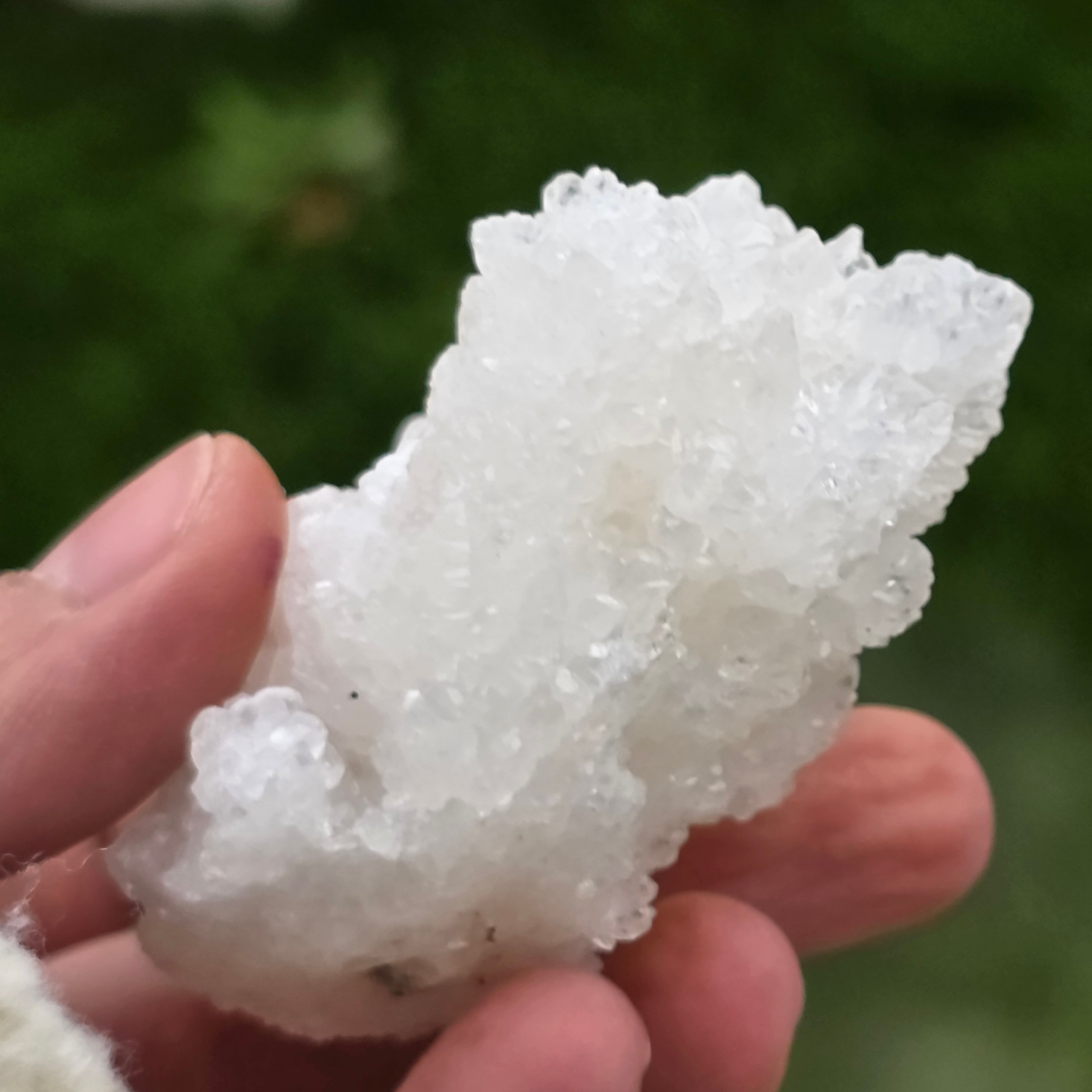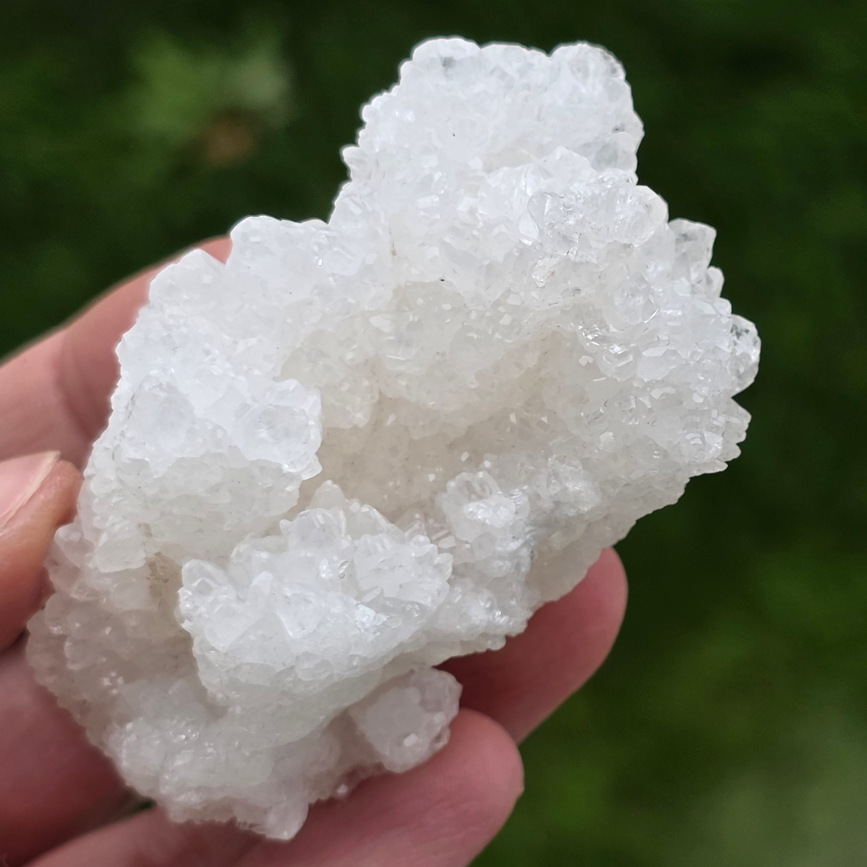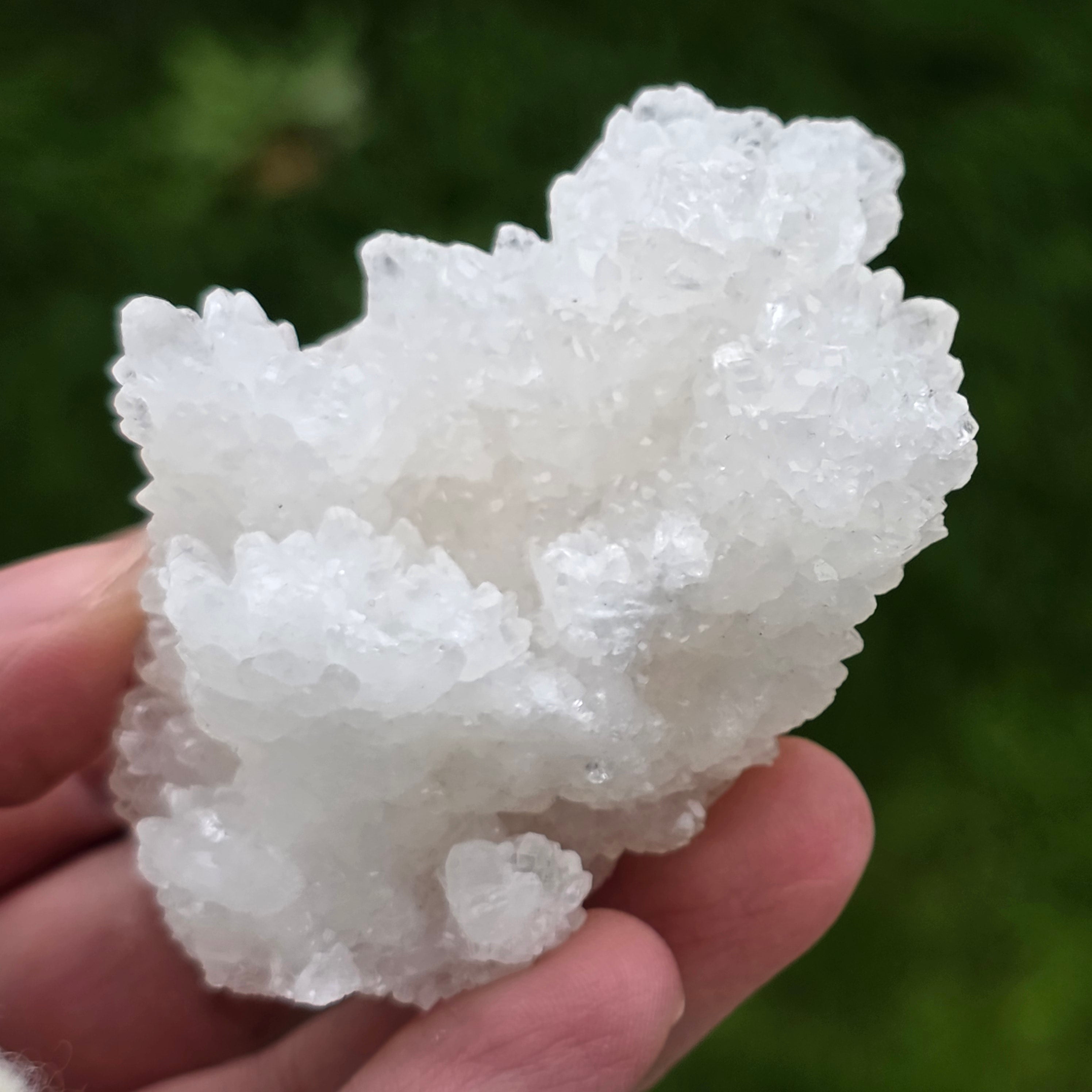 Kryształy ułożone są w nieregularne, zaokrąglone struktury, z lekko błyszczącymi powierzchniami, przypominającymi formacje spotykane wewnątrz jaskiń. Bogata tekstura i dobrze zdefiniowana objętość nadają każdemu okazowi autentyczny i ekspresyjny charakter, bardzo ceniony w kolekcjach minerałów oraz jako naturalny element dekoracyjny.