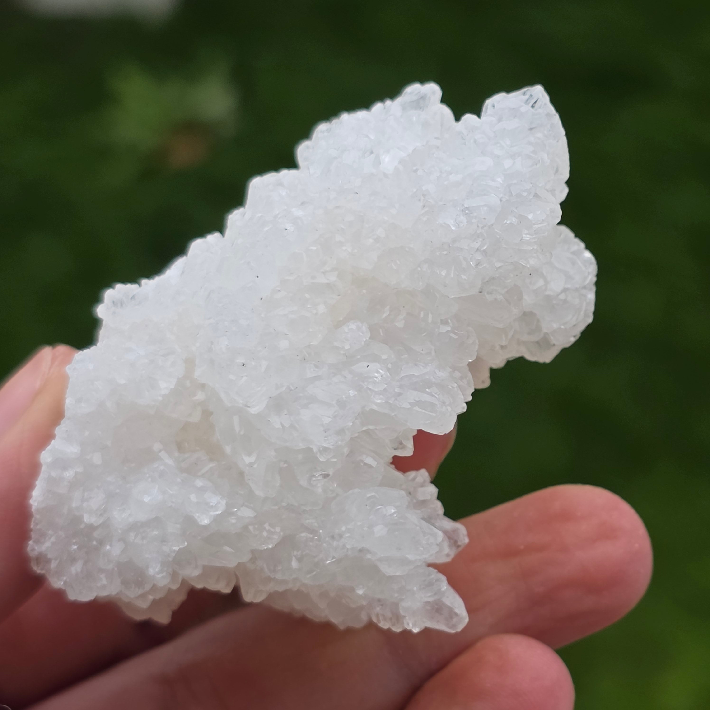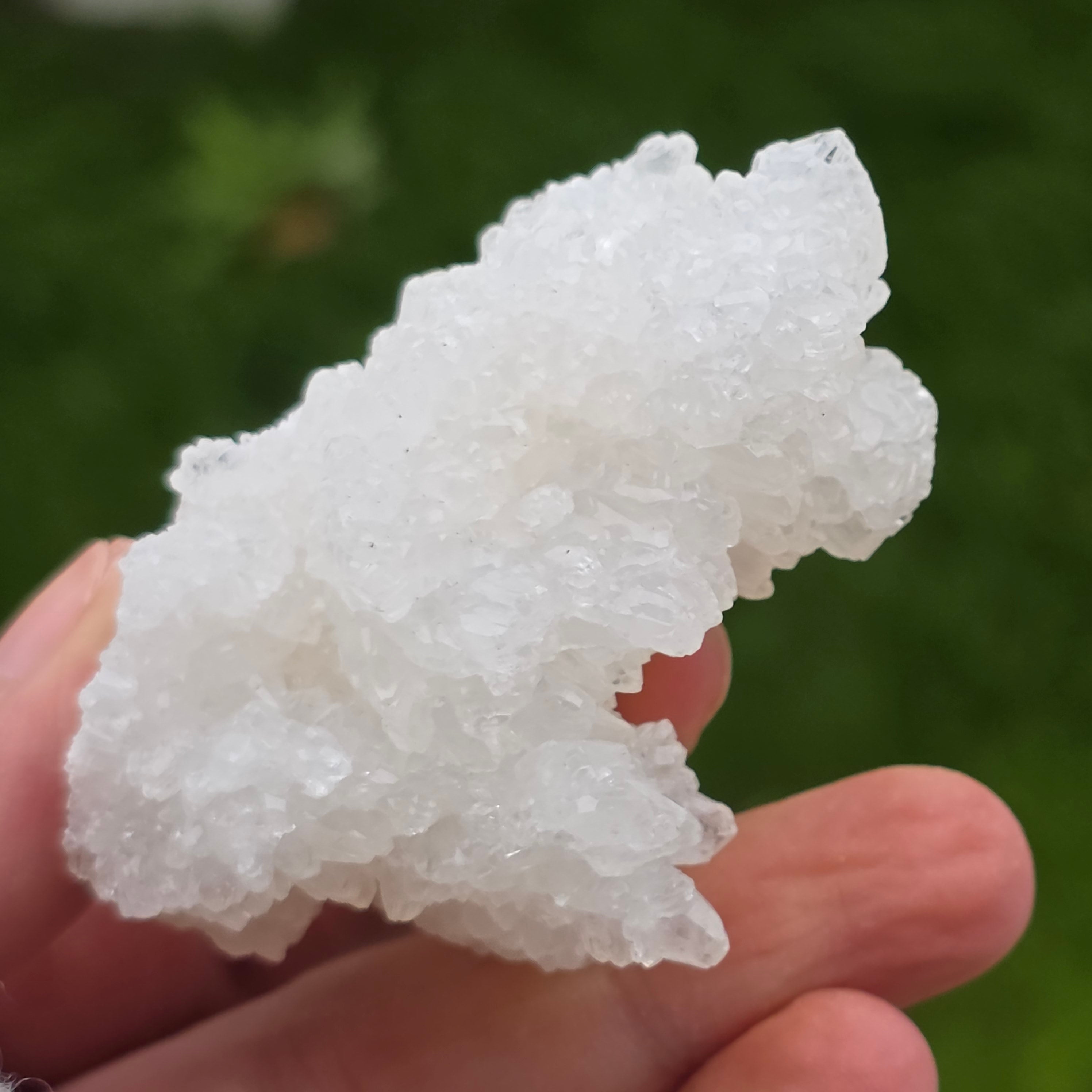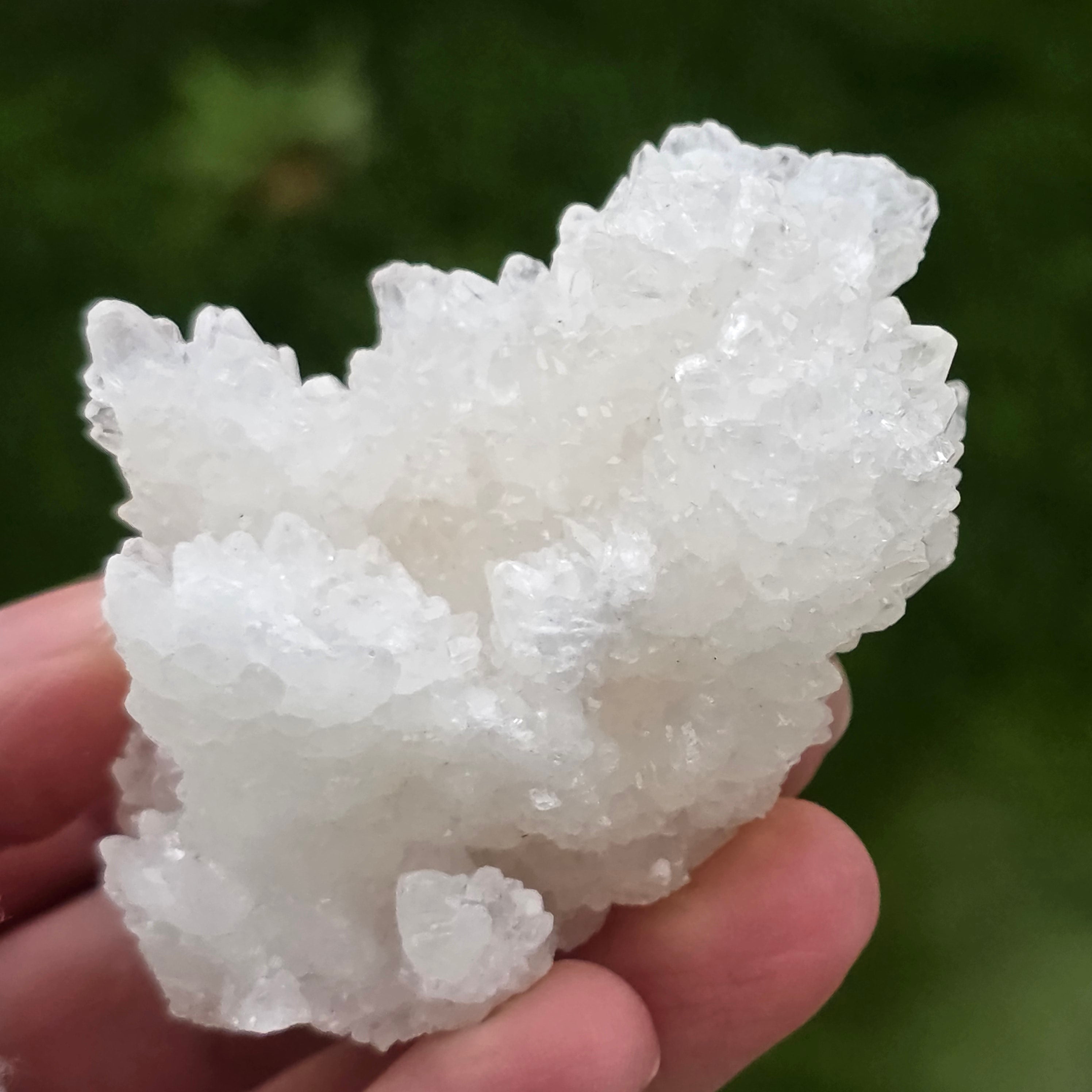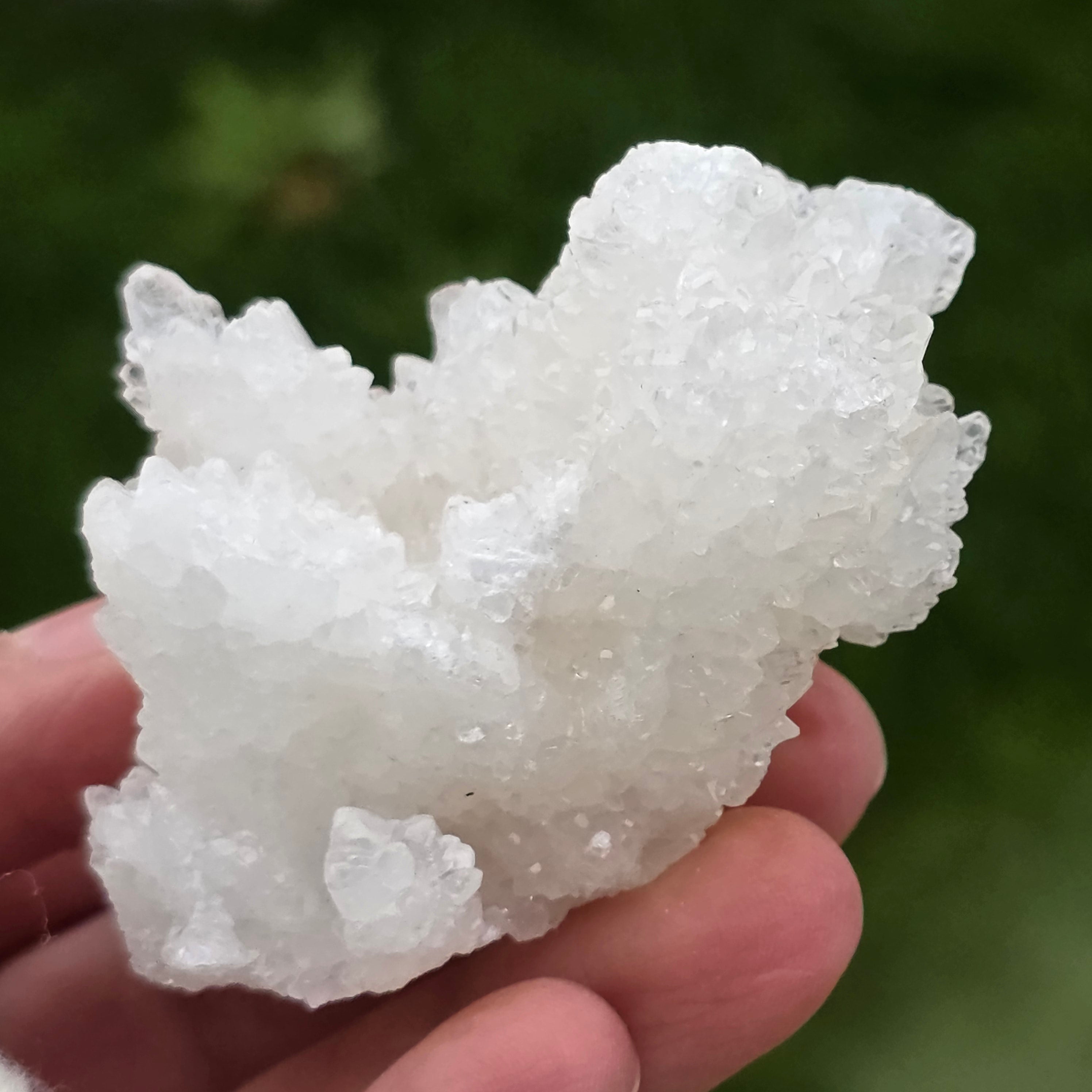 Ten kalcyt jaskiniowy (Cave Calcite) z Meksyku jest naturalnym okazem mineralnym cenionym za swoją organiczną, zwartą strukturę i mlecznobiały wygląd, utworzony z gęstych agregatów drobnych kryształów. Okazy tego typu są wynikiem powolnych procesów geologicznych zachodzących w podziemnych wnękach, gdzie stabilne warunki umożliwiły rozwój tych harmonijnych form naturalnych.