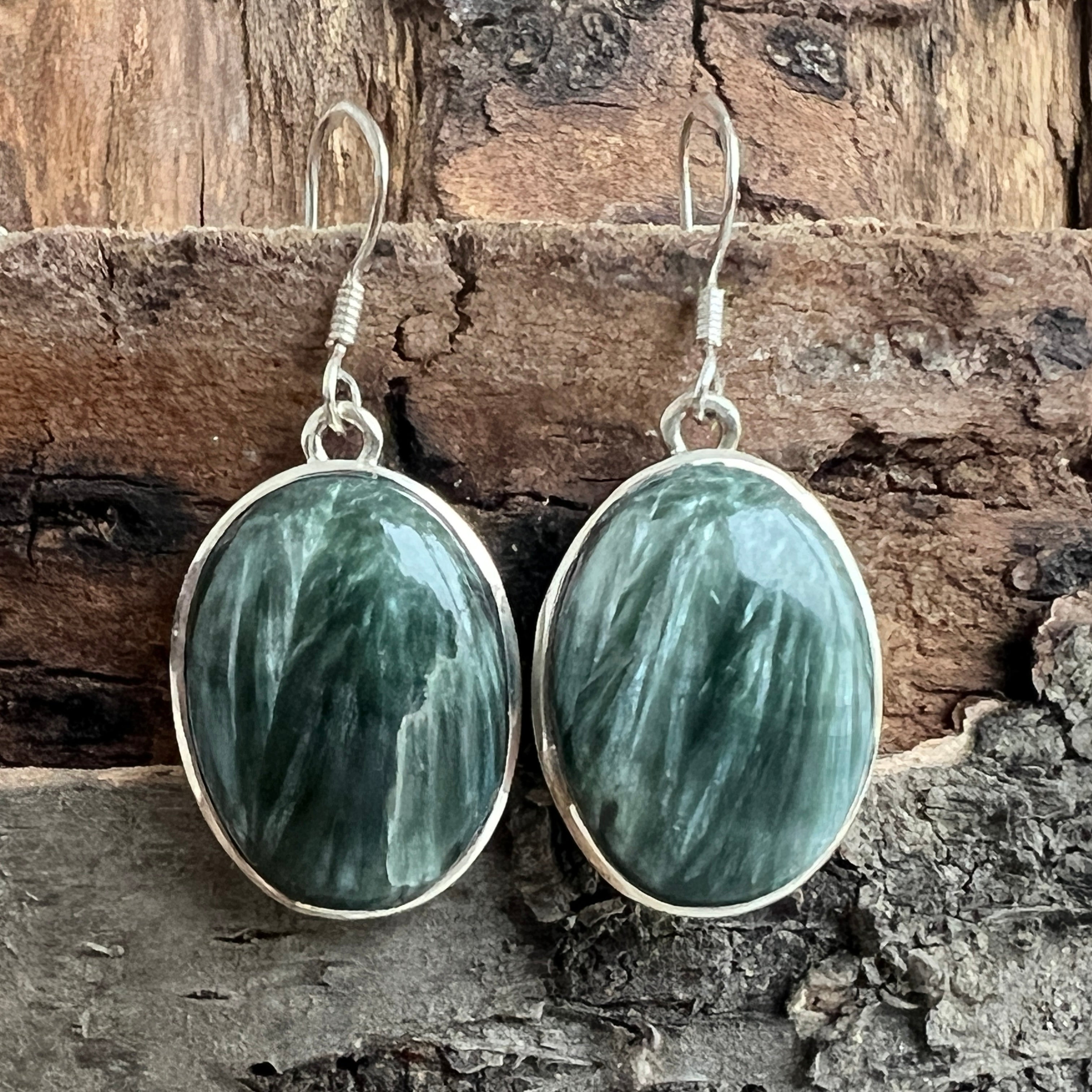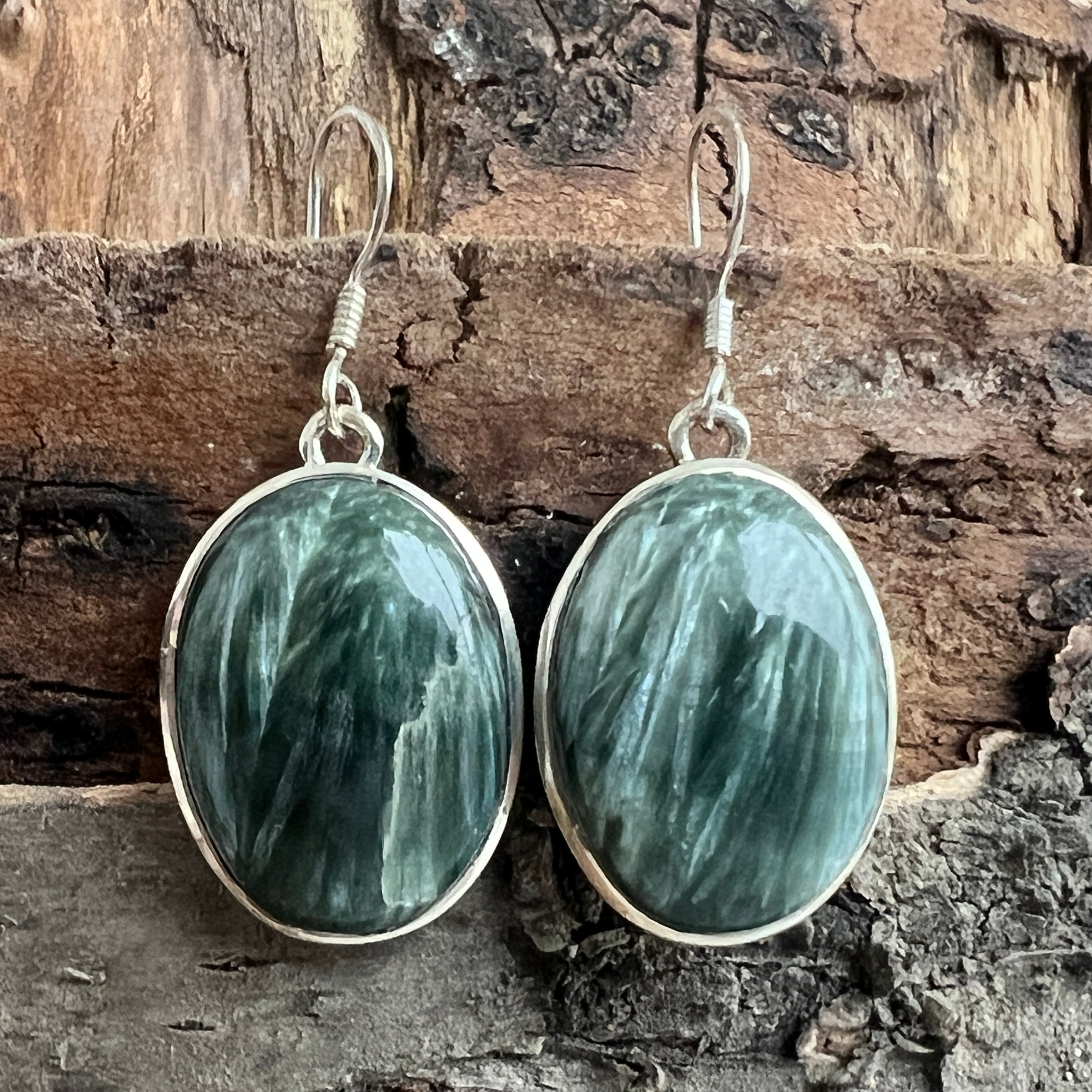 Serafinitul jest znany z subtelnych odcieni zieleni, harmonijnie połączonych ze srebrnymi lub białymi paskami, które przypominają skrzydła anioła. Ta kombinacja kolorów i naturalnych wzorów tworzy delikatny i uroczy wygląd biżuterii. Serafinitus jest często kojarzony z anielskimi i duchowymi energią, uważany za kamień boskiego światła i miłości.
