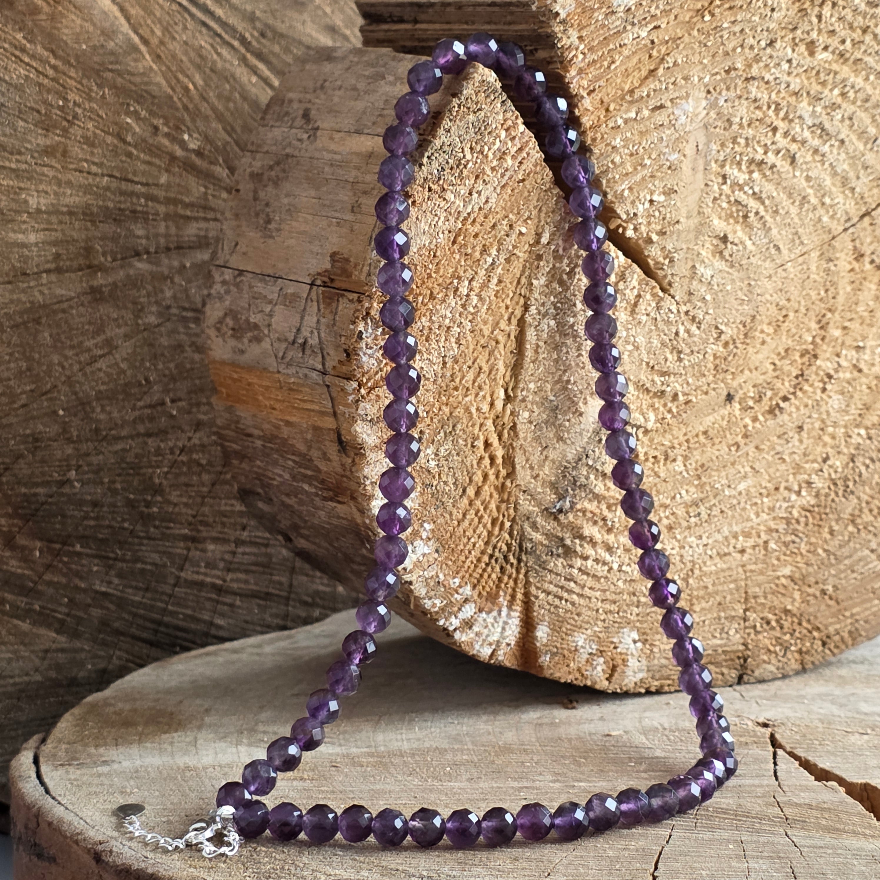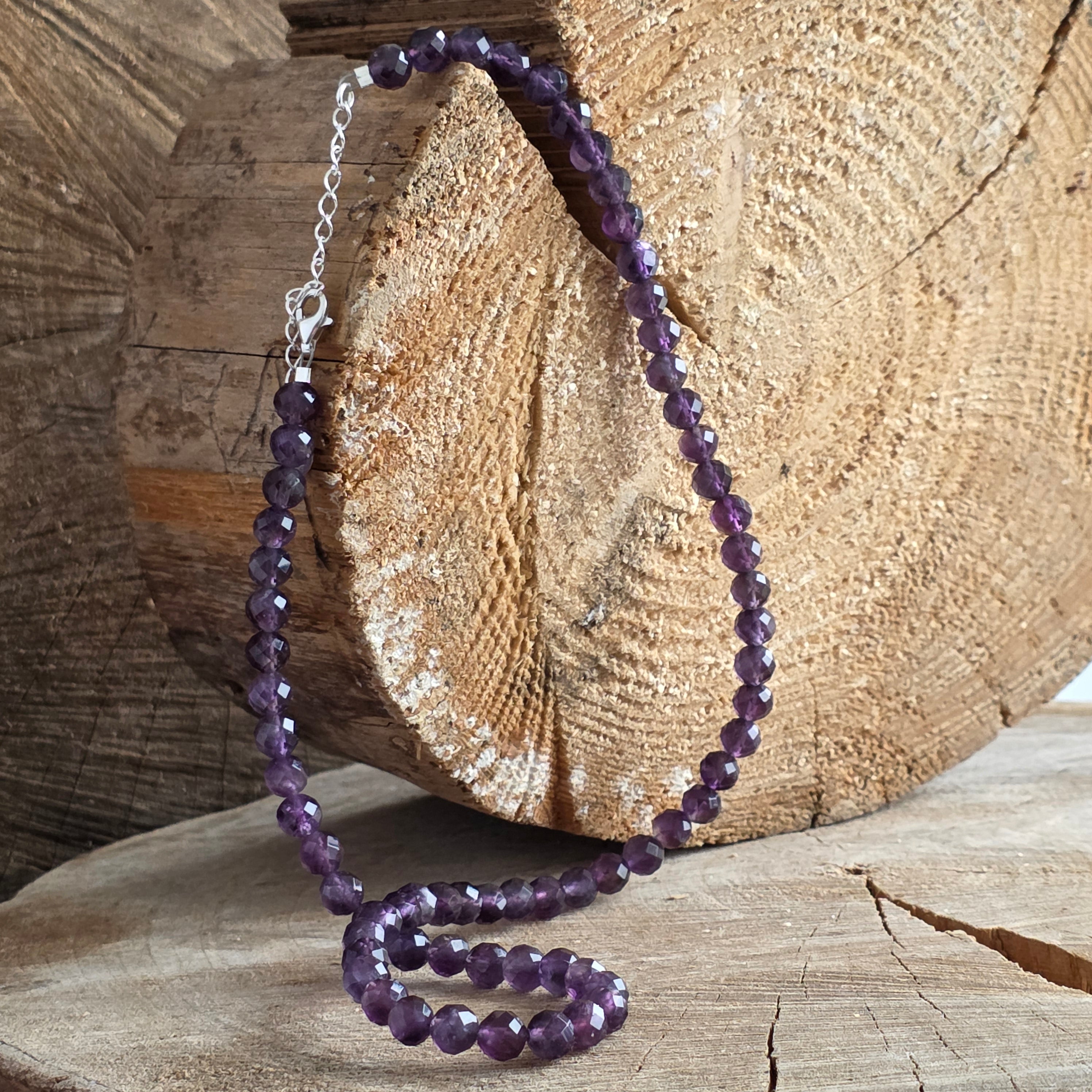 Naszyjnik niosący ze sobą delikatność i subtelną szlachetność snu, niczym szept fioletu zatrzymanego na skórze. 6 mm, starannie fasetowane, dyskretnie odbijające światło w płynnym i pełnym wdzięku rytmie.