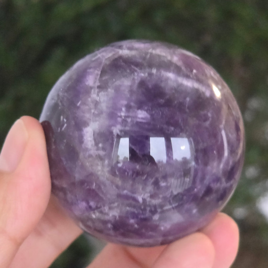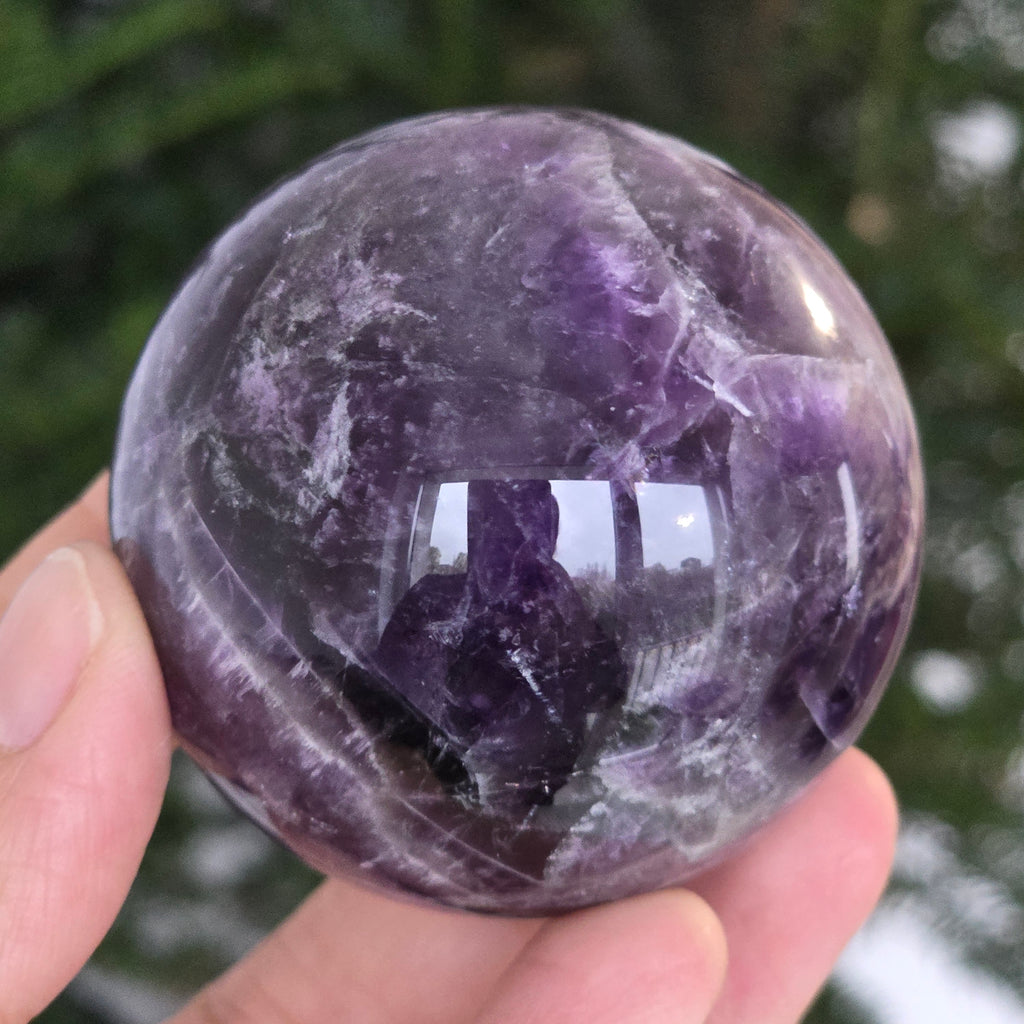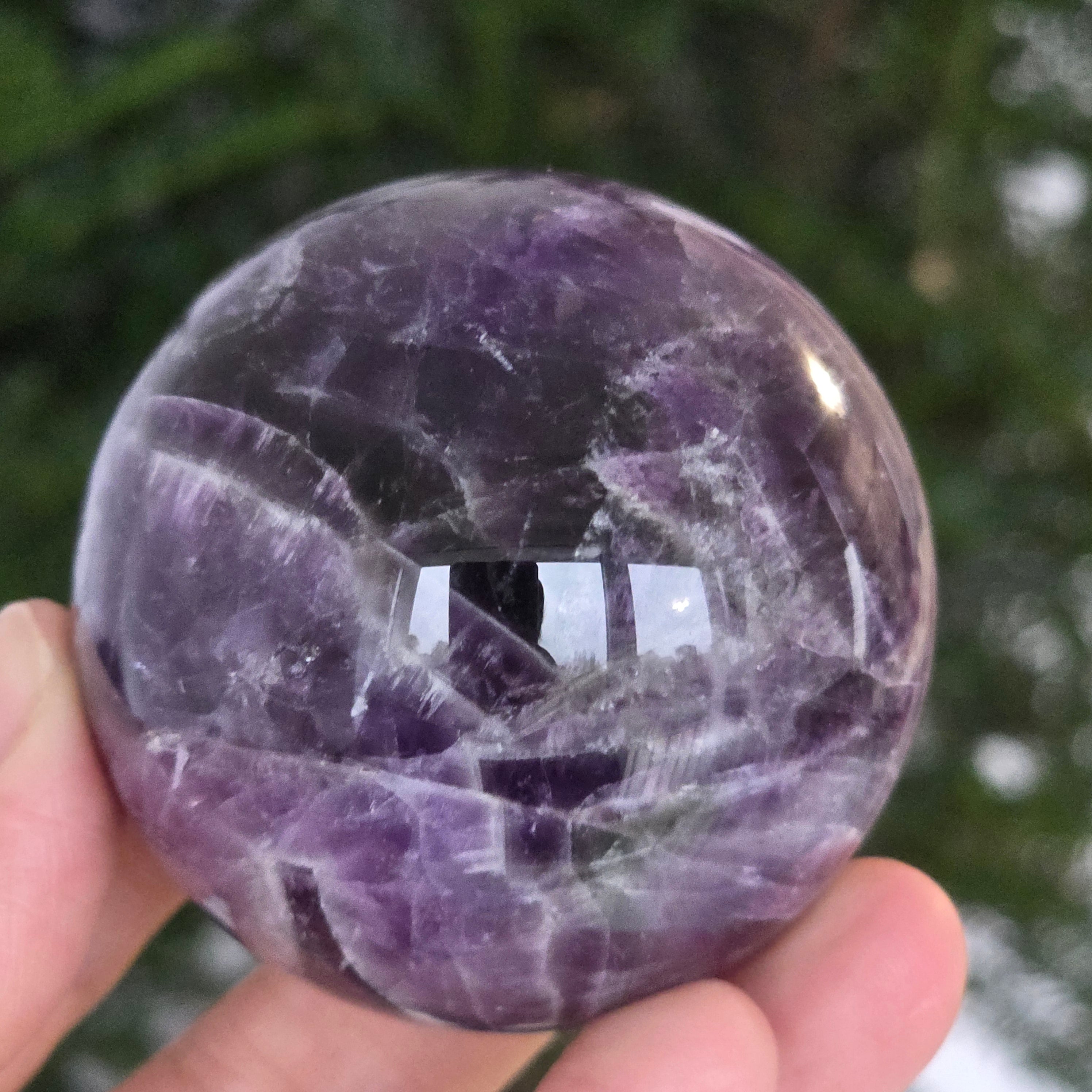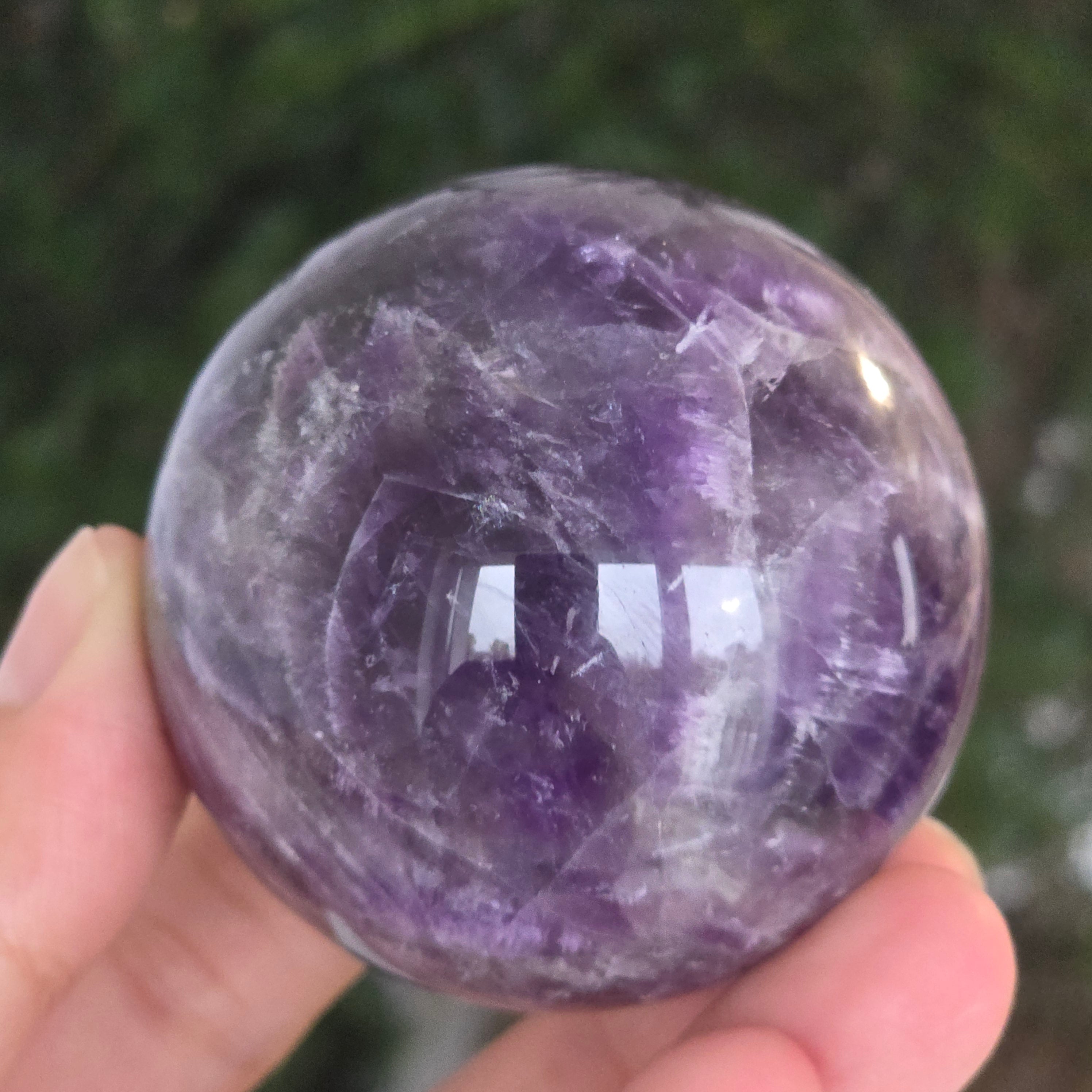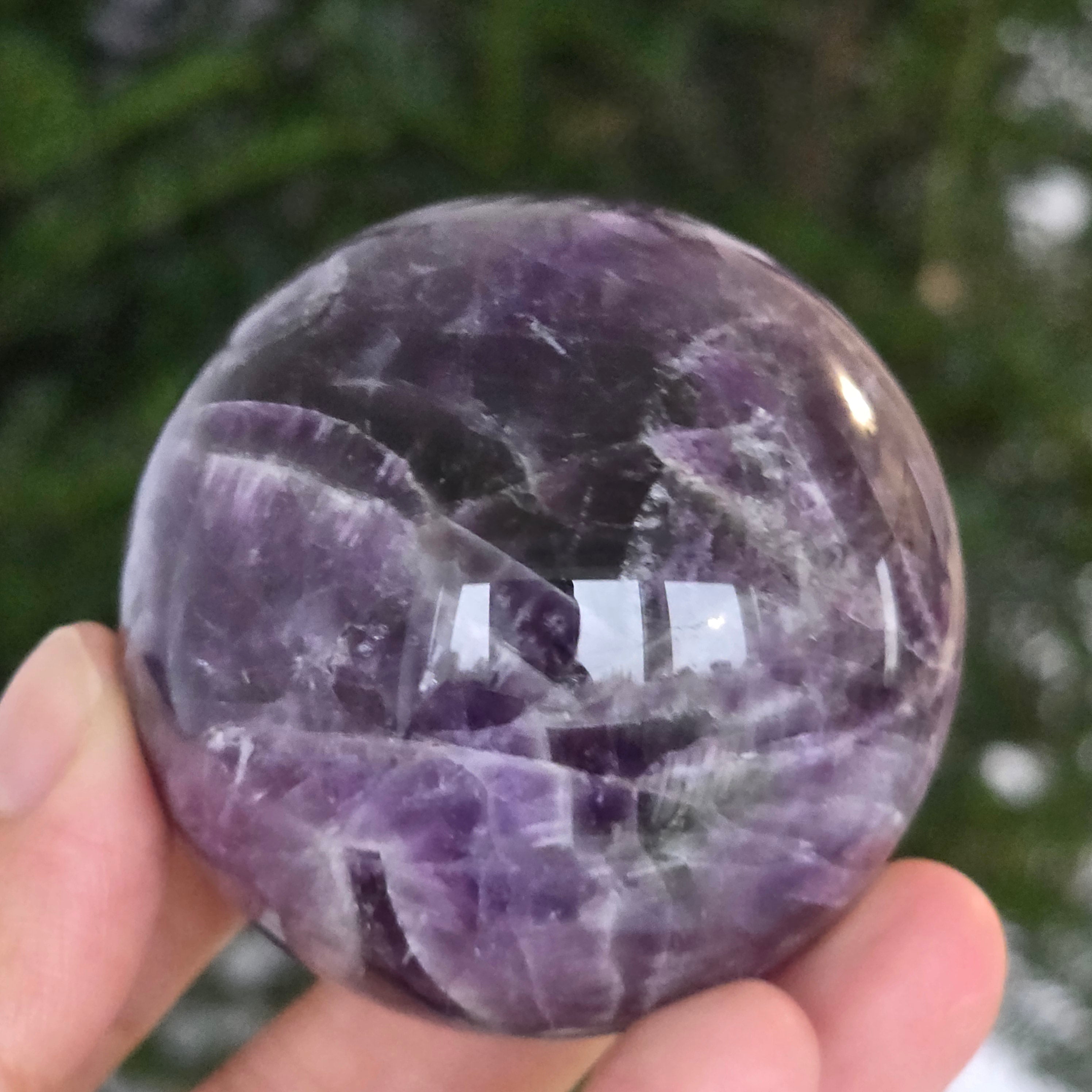 Kula, która zdaje się skupiać w sobie światło liliowej nocy. Ten unikalny kawałek naturalnego ametystu jodełkowego, odsłania oszałamiające warstwy fioletu, bieli i lawendy, ułożone w kształt litery V – znak rozpoznawczy tej rzadkiej odmiany ametystu. Idealnie wypolerowana powierzchnia, aksamitna w dotyku, odbija światło z hipnotyczną finezją, wnosząc spokój i wyrafinowanie do każdej przestrzeni.