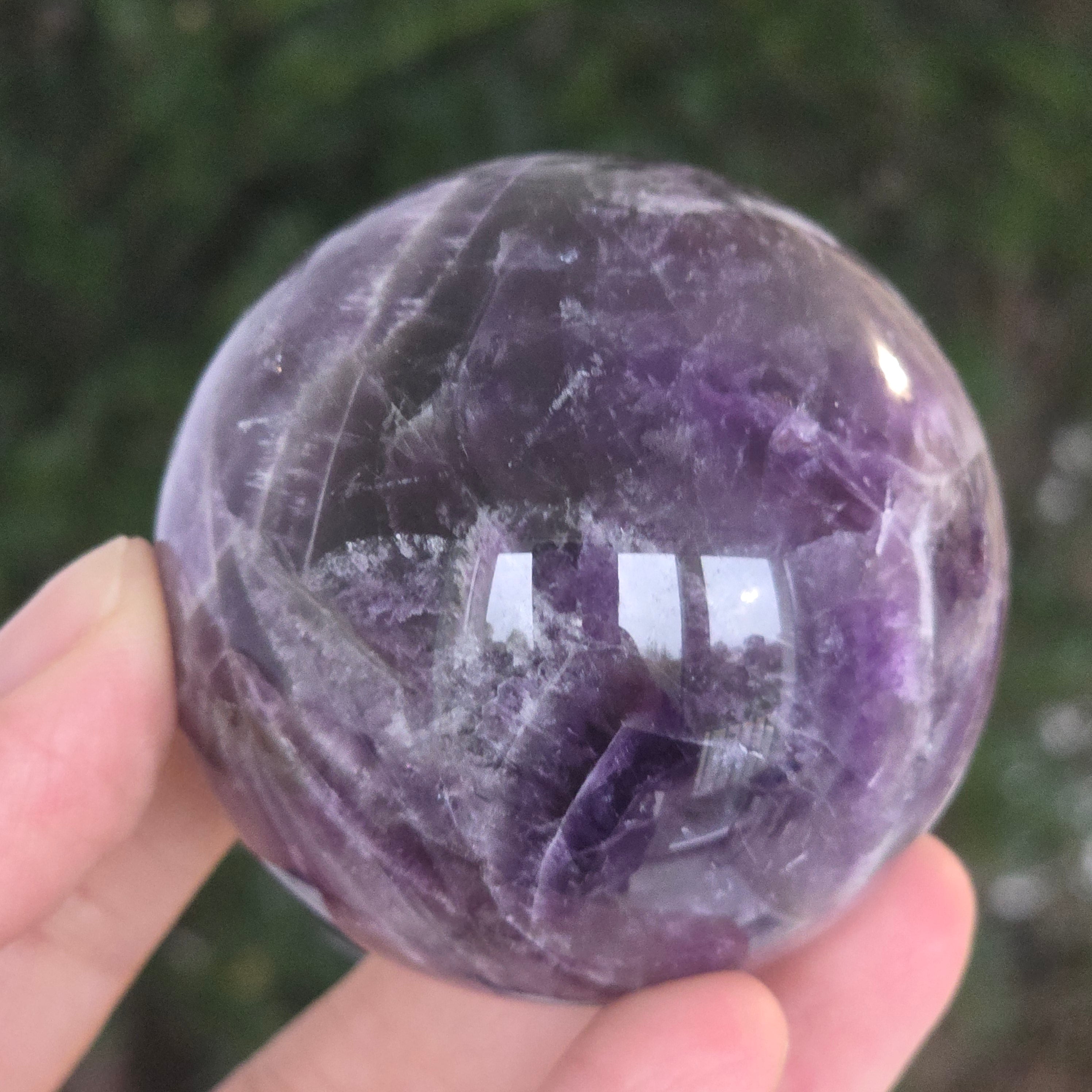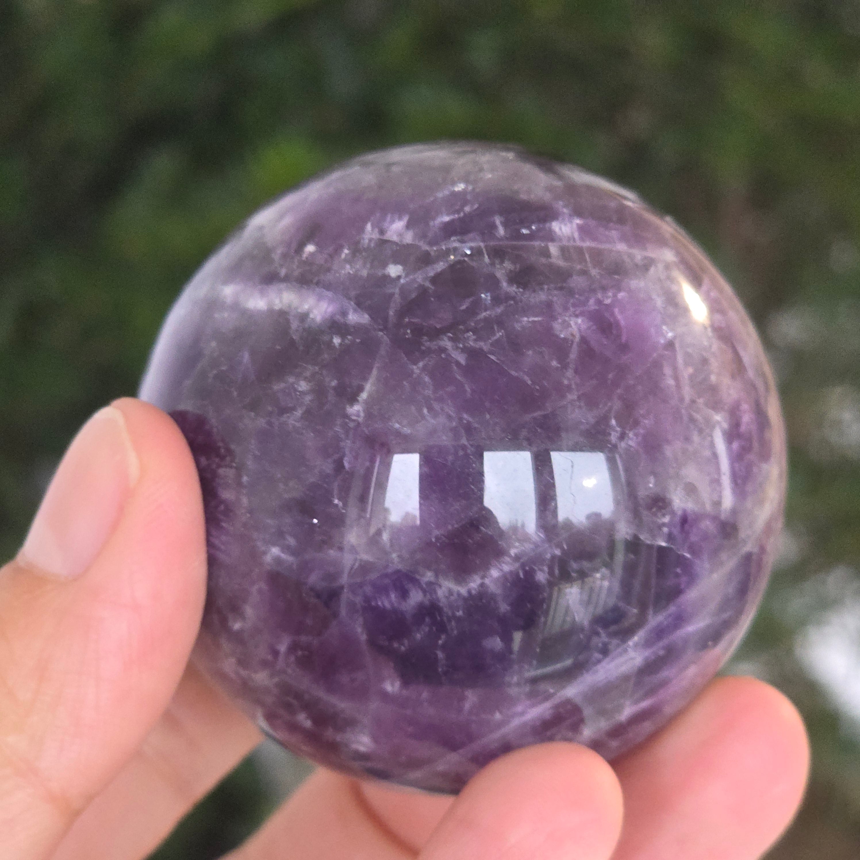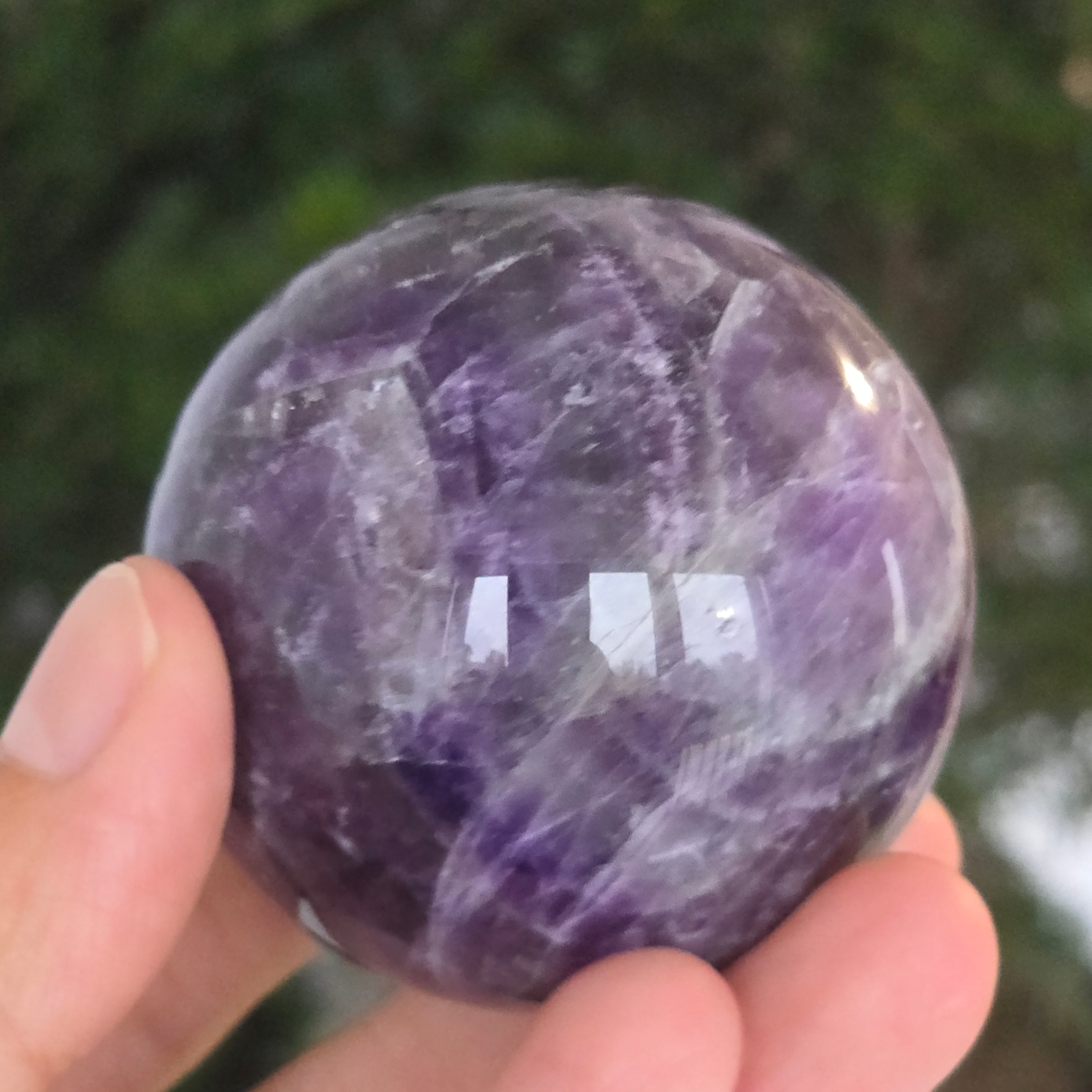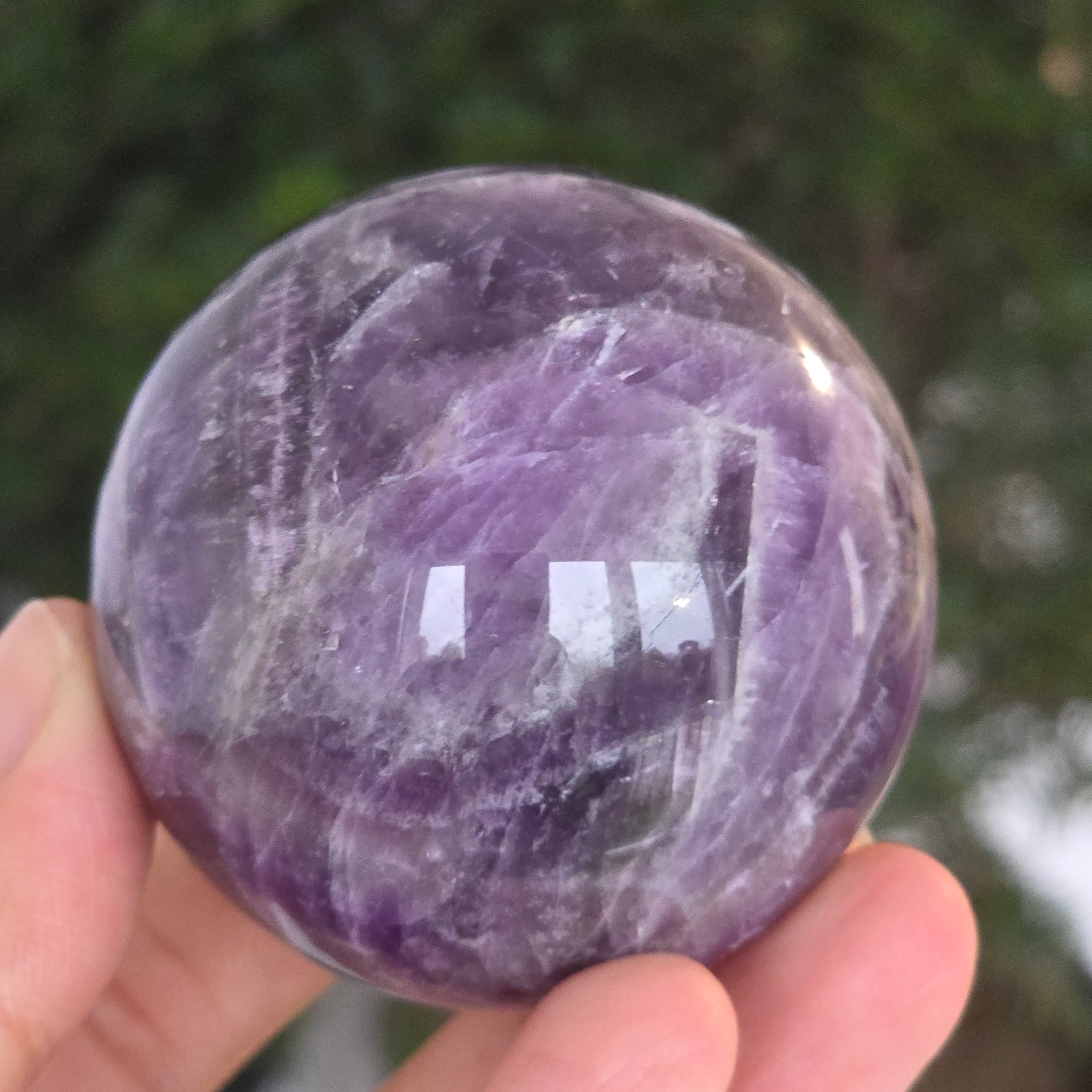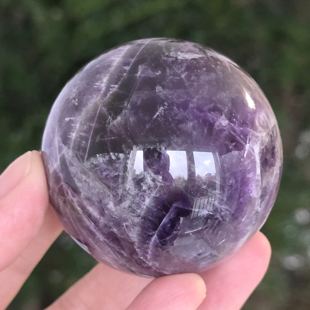 Kula, która zdaje się skupiać w sobie światło liliowej nocy. Ten unikalny kawałek naturalnego ametystu jodełkowego, odsłania oszałamiające warstwy fioletu, bieli i lawendy, ułożone w kształt litery V – znak rozpoznawczy tej rzadkiej odmiany ametystu. Idealnie wypolerowana powierzchnia, aksamitna w dotyku, odbija światło z hipnotyczną finezją, wnosząc spokój i wyrafinowanie do każdej przestrzeni.
