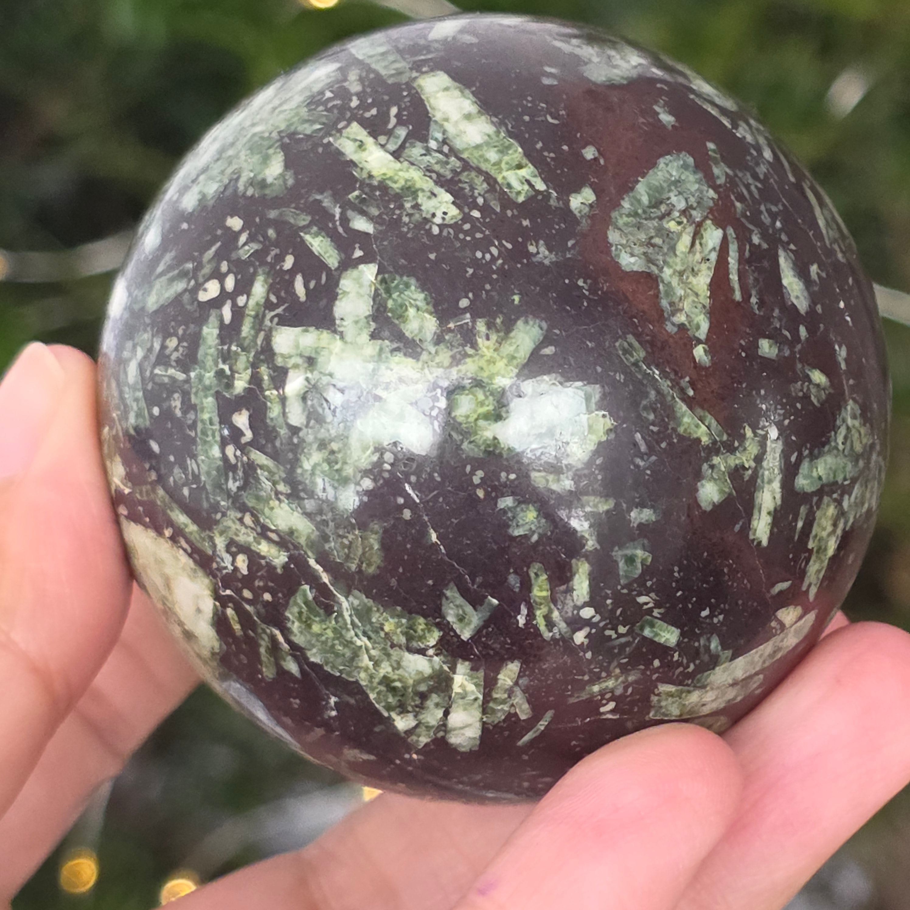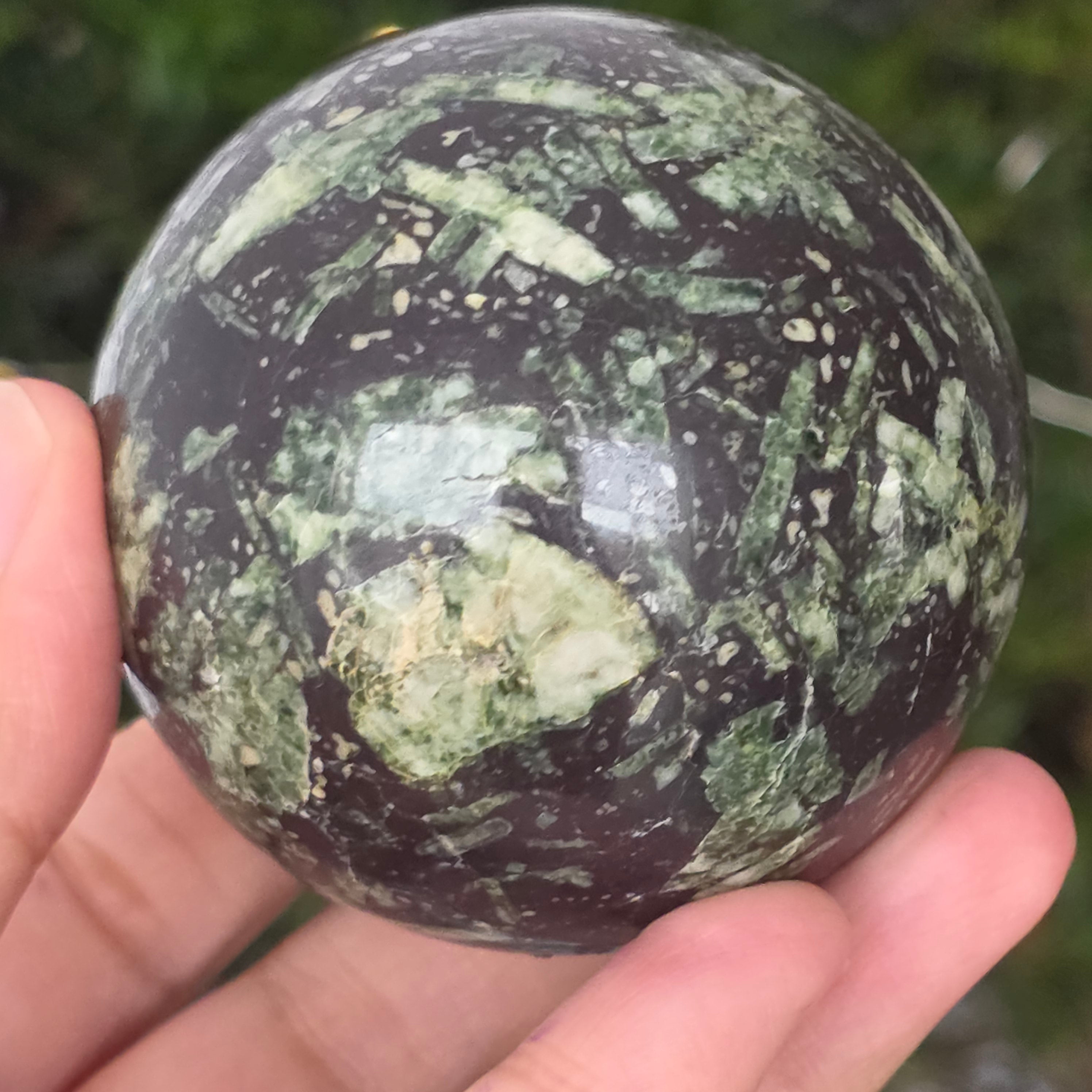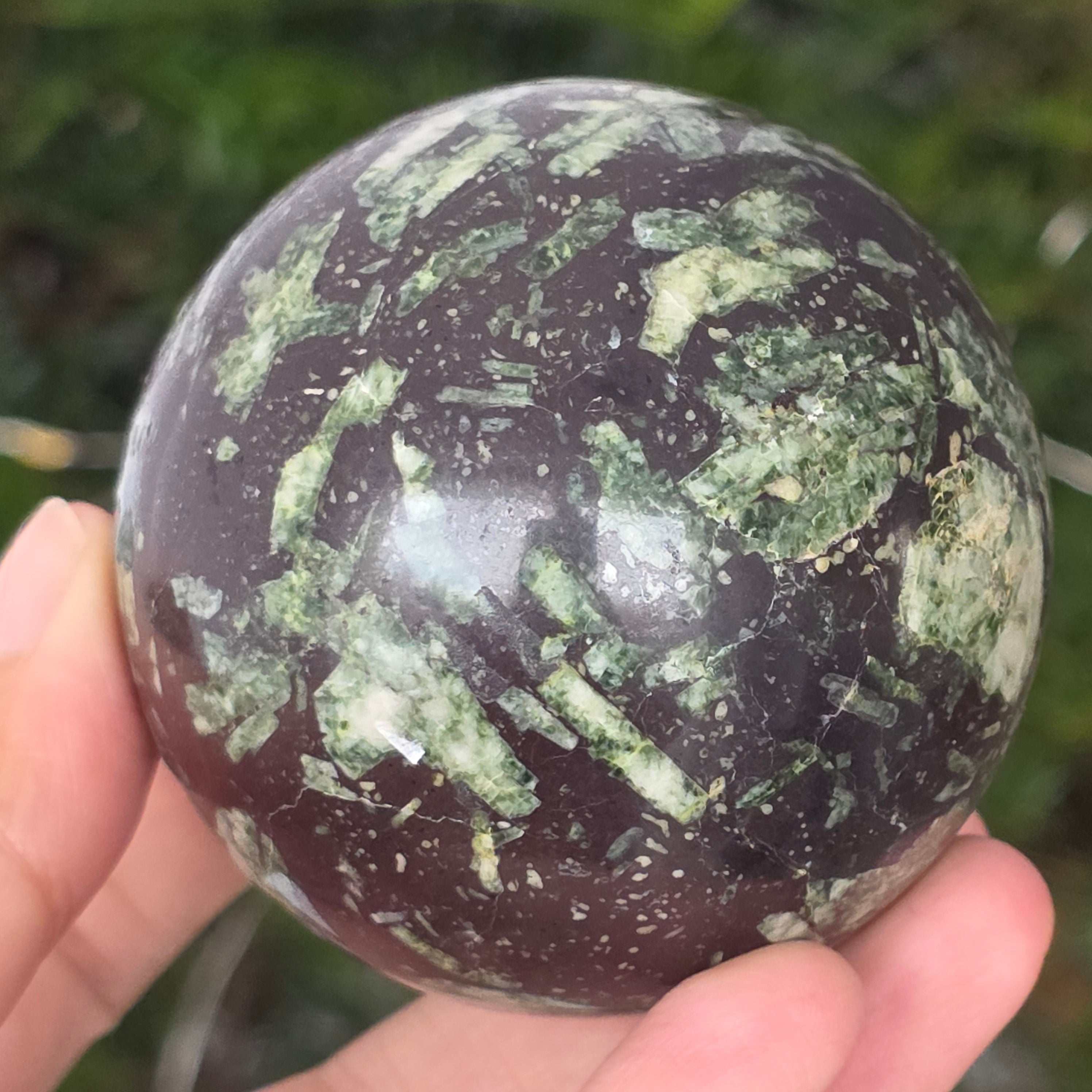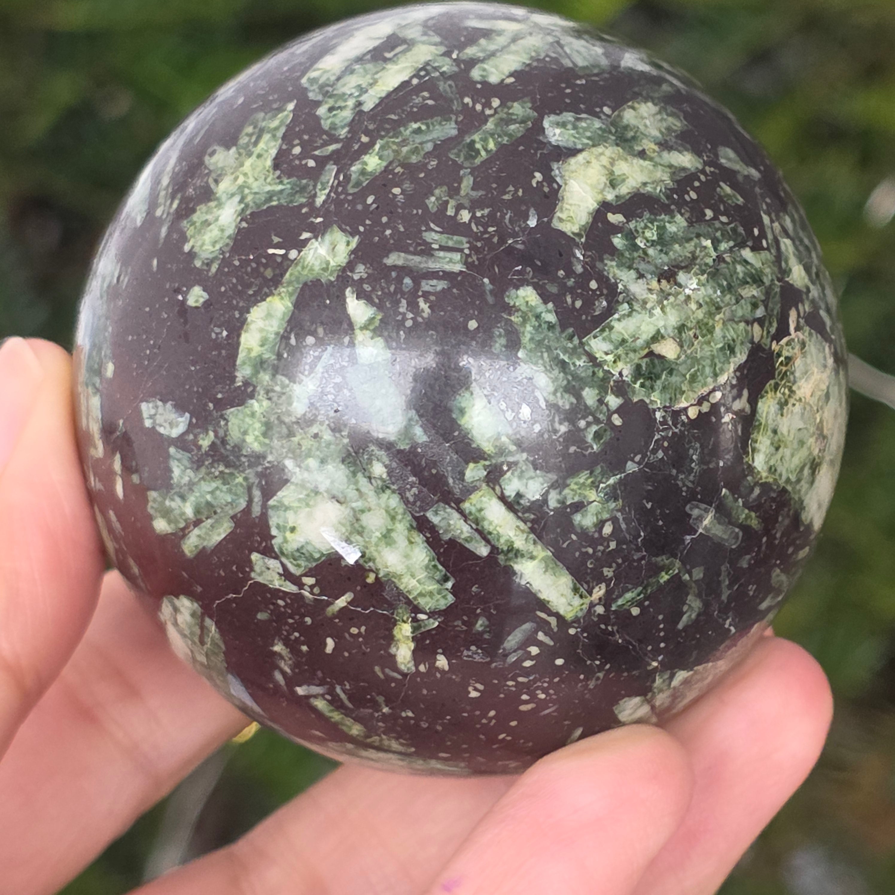 Czarny porforyt z zielonymi plamkami to dekoracyjna skała magmowa o ciemnym kolorze, charakteryzująca się intensywnie czarną matrycą, w której wyraźnie widać małe, zielone kryształy rozmieszczone nieregularnie. Jej kontrastowy i teksturowany wygląd nadaje jej tajemniczy i elegancki charakter, będąc cenioną zarówno w kolekcjach minerałów, jak i w obiektach dekoracyjnych czy okładzinach.