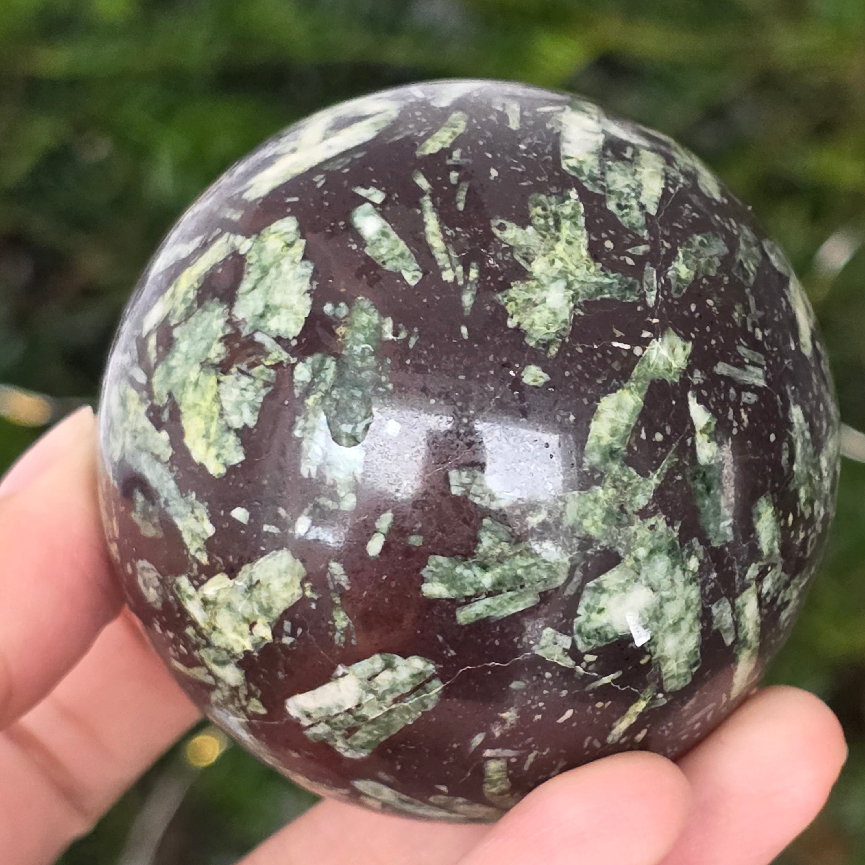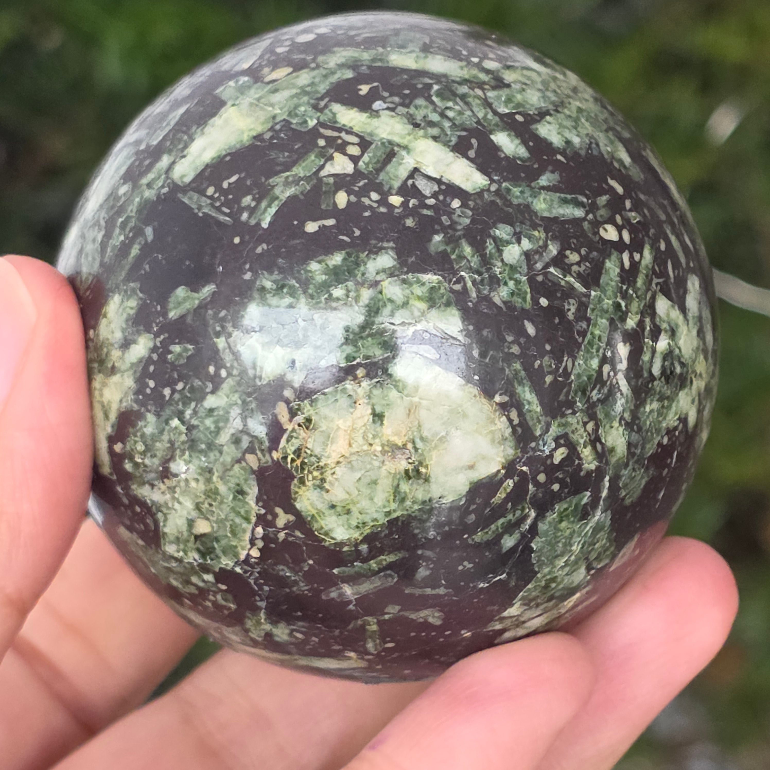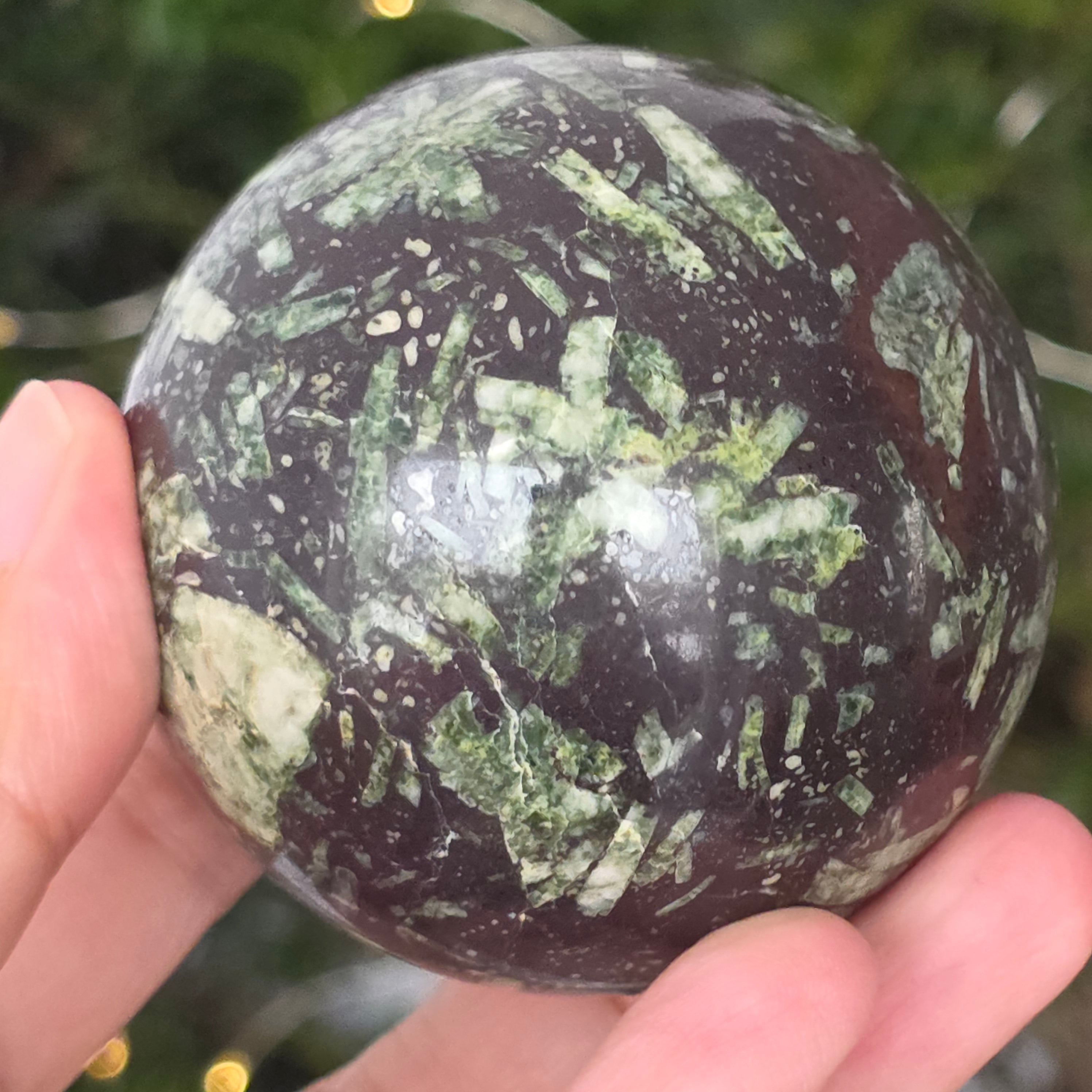 Czarny porforyt z zielonymi plamkami to dekoracyjna skała magmowa o ciemnym kolorze, charakteryzująca się intensywnie czarną matrycą, w której wyraźnie widać małe, zielone kryształy rozmieszczone nieregularnie. Jej kontrastowy i teksturowany wygląd nadaje jej tajemniczy i elegancki charakter, będąc cenioną zarówno w kolekcjach minerałów, jak i w obiektach dekoracyjnych czy okładzinach.